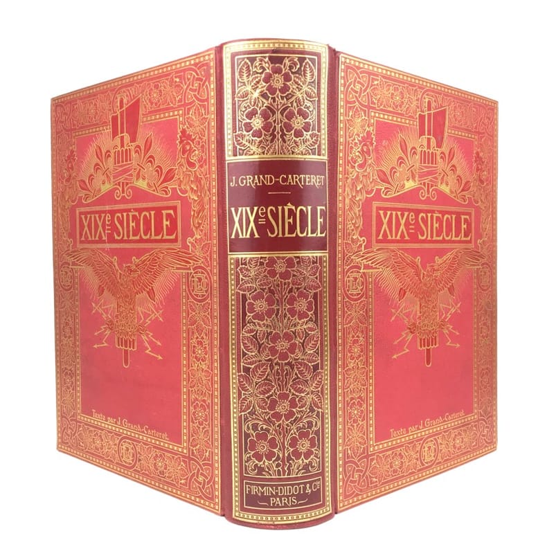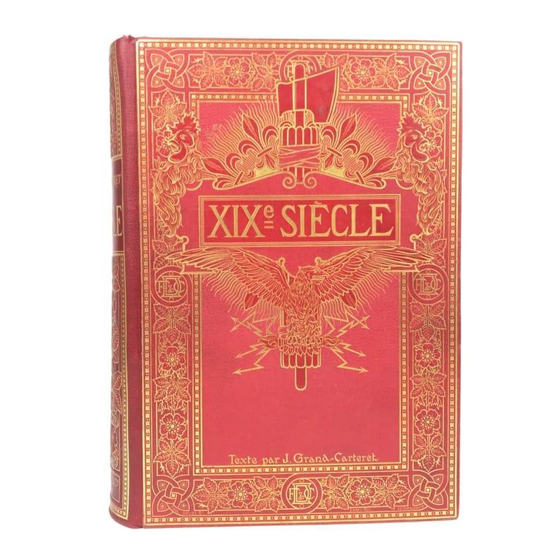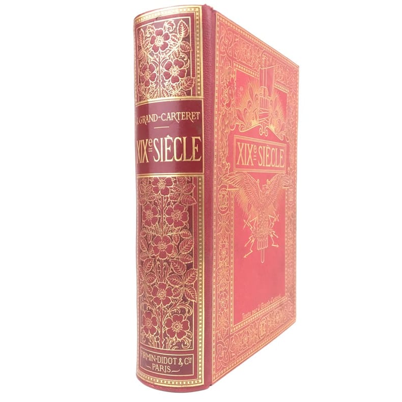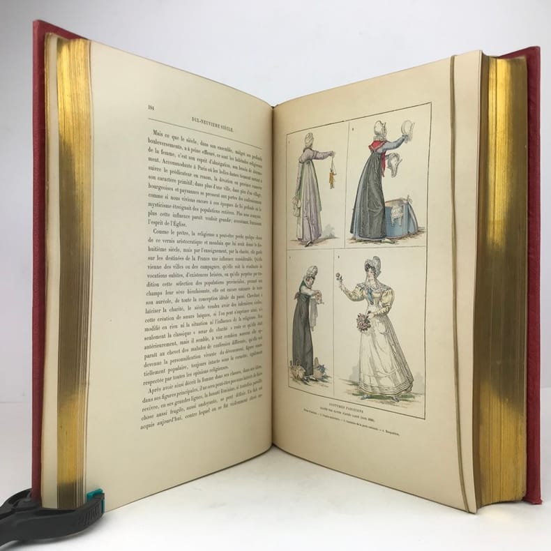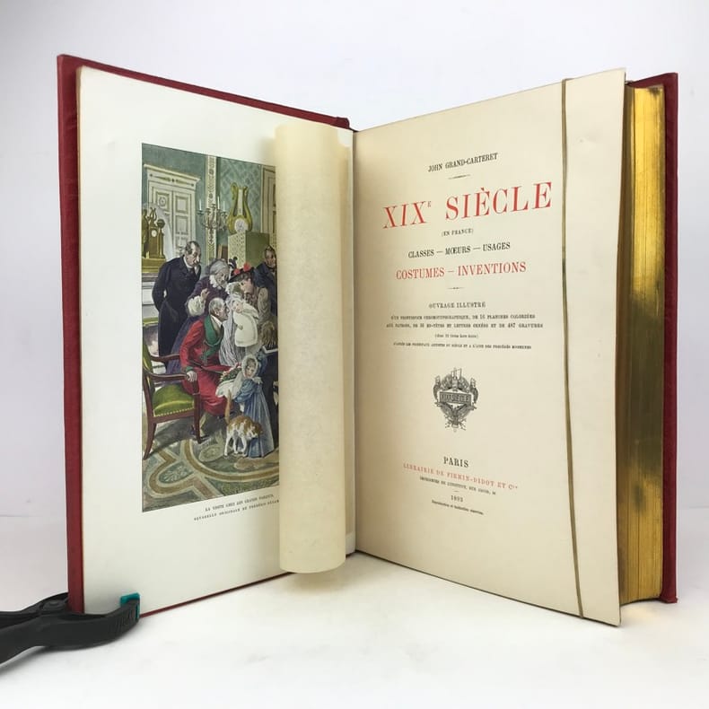 1 volume in-folio (27,5 x 19,5 cm), cartonnage éditeur rouge, dos lisse orné, tranches dorées, titre en rouge et noir, xii-774 pages (complet). Une planche coloriée dépliante déreliée. Bon état. ÉDITION ORIGINALE illustrée d’un frontispice chromolithographique, de 16 planches coloriées aux patrons, de 36 en-têtes et lettres ornées, et enfin de 487 gravures, dont 24 hors-texte. John Grand-Carteret, né le 6 mai 1850 à Paris où il est mort le 31 août 1927[1], est un journaliste français, historien de l'art et de la mode. Considéré comme un véritable pionnier dans le domaine de l’iconologie, il publie ici un volume sur l’Histoire sociale du XIXe siècle qu’il souhaite être abondamment illustré. PROVENANCES : étiquettes d’ex-libris d’André Barrier (Président à la Cour de Paris), Serge Barrier et Marcelle Léonardon. Plaisant exemplaire.