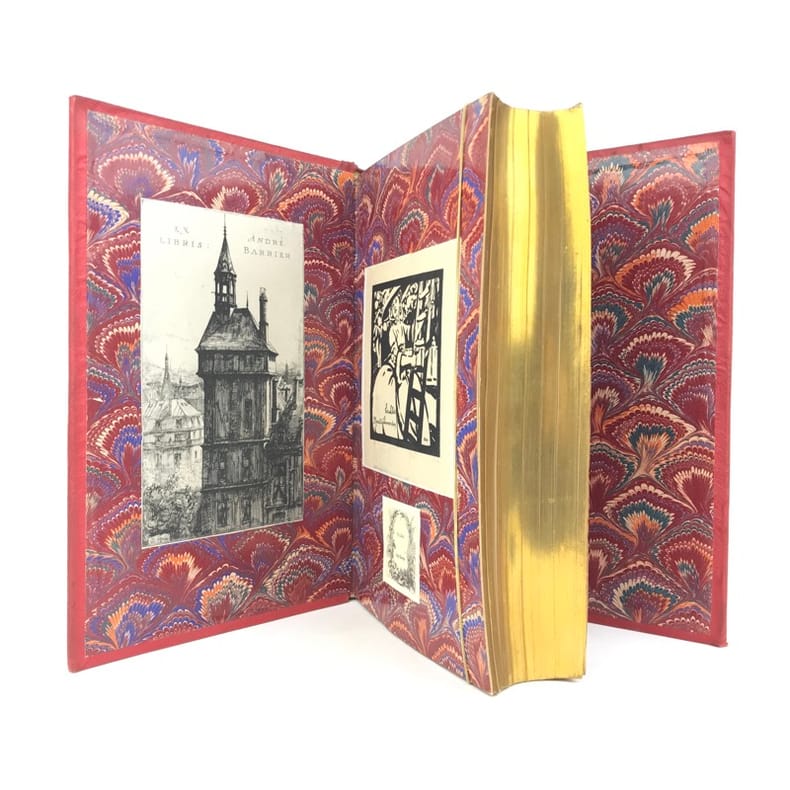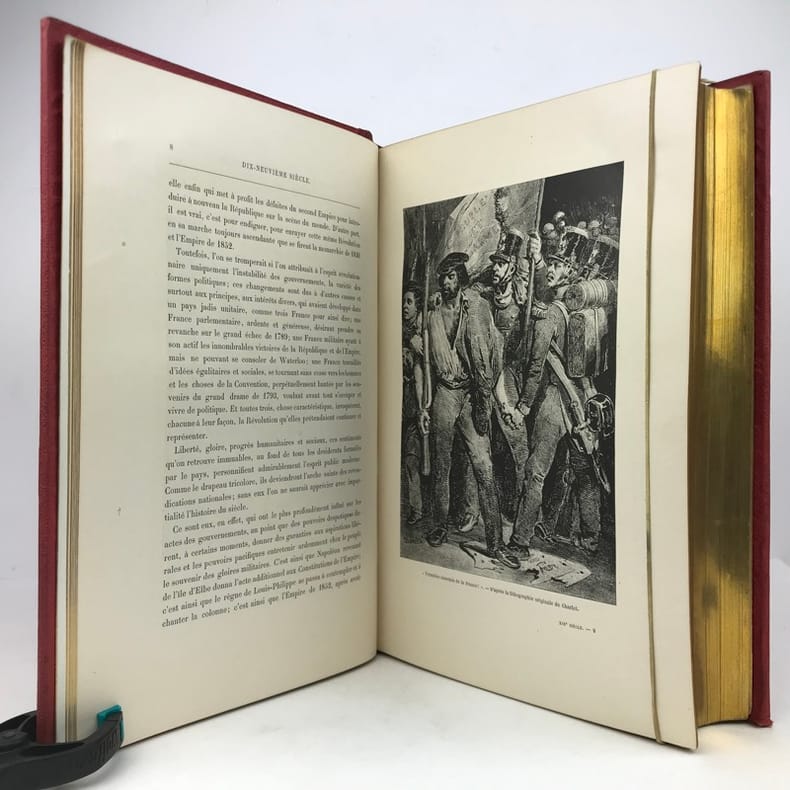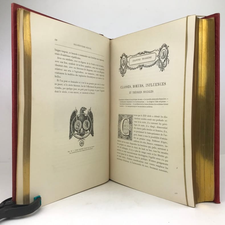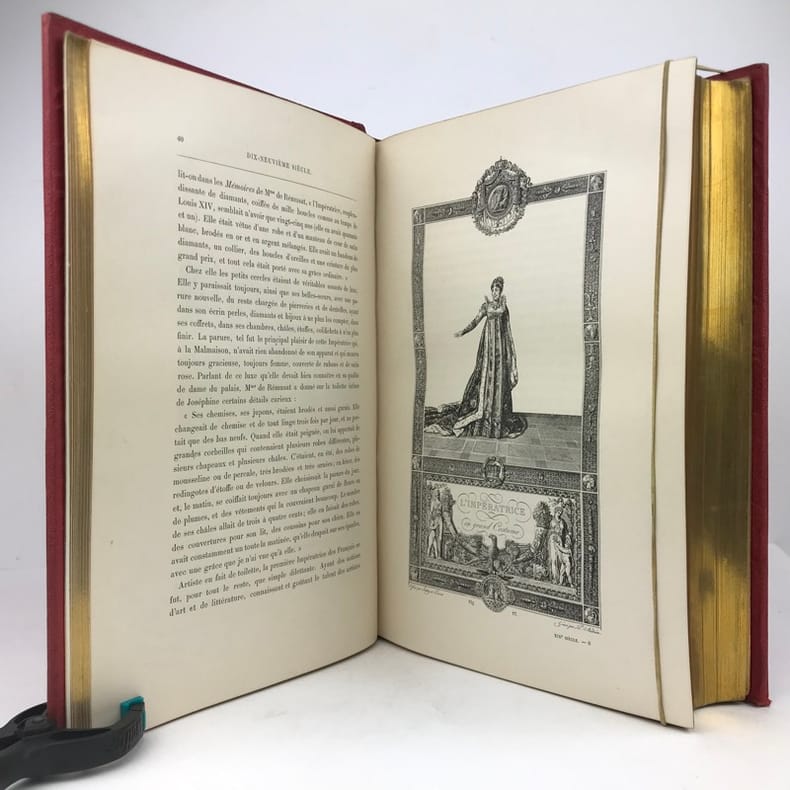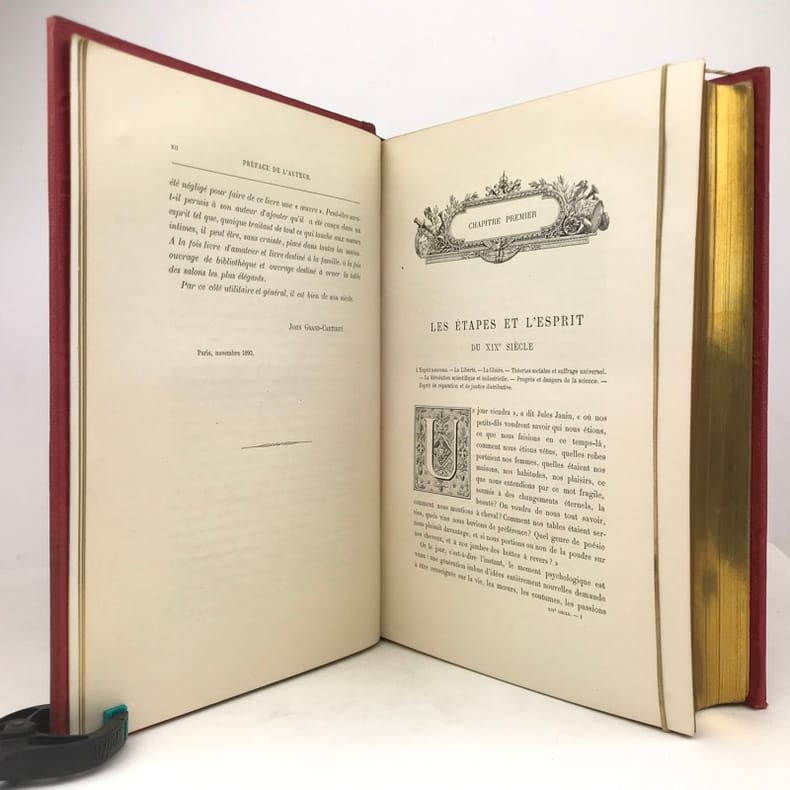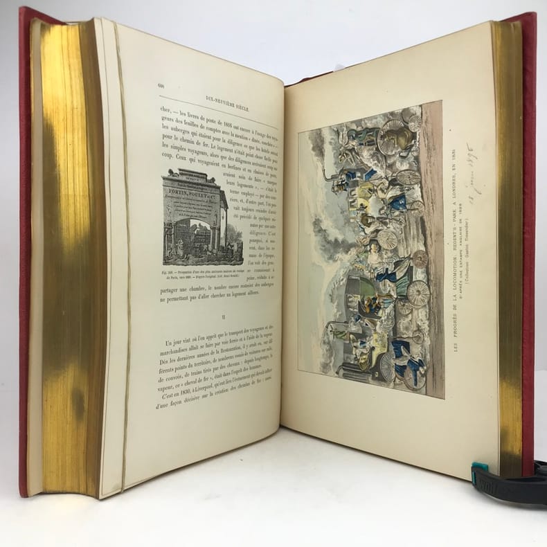 1 volume in-folio (27,5 x 19,5 cm), cartonnage éditeur rouge, dos lisse orné, tranches dorées, titre en rouge et noir, xii-774 pages (complet). Une planche coloriée dépliante déreliée. Bon état. ÉDITION ORIGINALE illustrée d’un frontispice chromolithographique, de 16 planches coloriées aux patrons, de 36 en-têtes et lettres ornées, et enfin de 487 gravures, dont 24 hors-texte. John Grand-Carteret, né le 6 mai 1850 à Paris où il est mort le 31 août 1927[1], est un journaliste français, historien de l'art et de la mode. Considéré comme un véritable pionnier dans le domaine de l’iconologie, il publie ici un volume sur l’Histoire sociale du XIXe siècle qu’il souhaite être abondamment illustré. PROVENANCES : étiquettes d’ex-libris d’André Barrier (Président à la Cour de Paris), Serge Barrier et Marcelle Léonardon. Plaisant exemplaire.