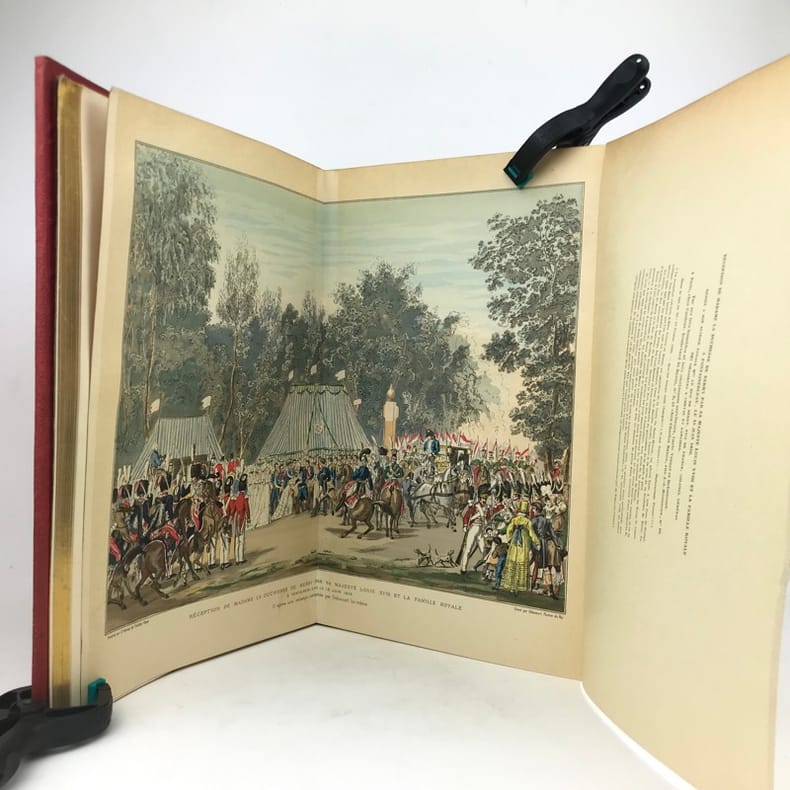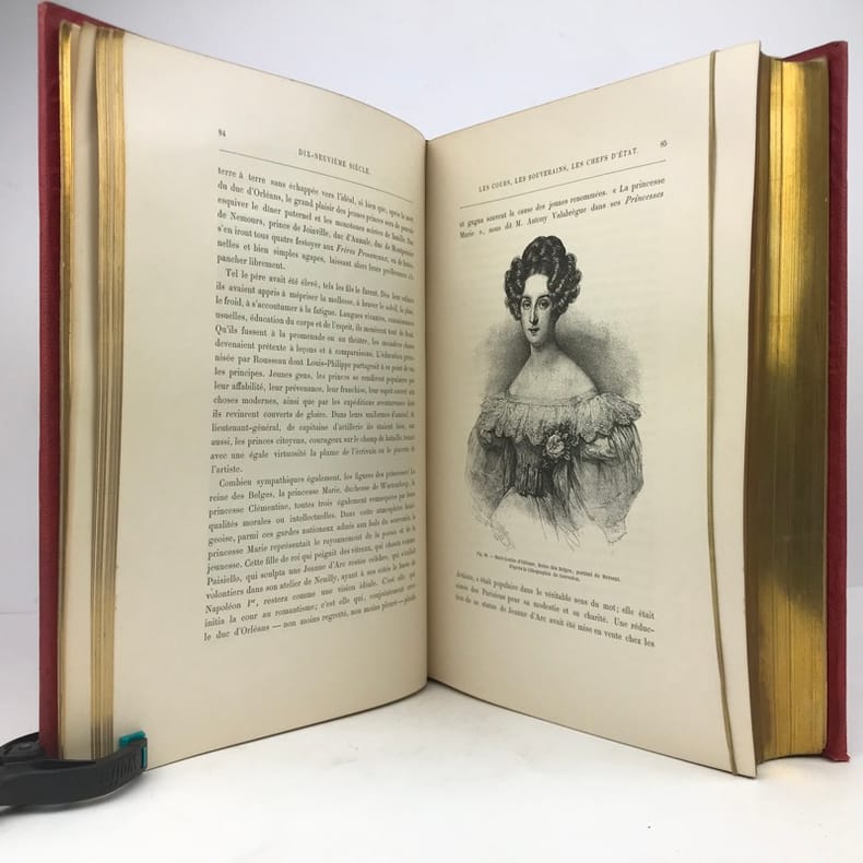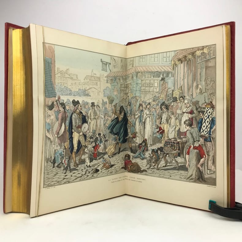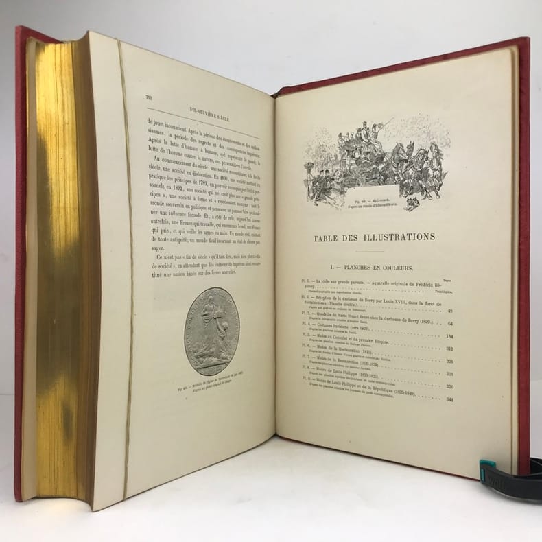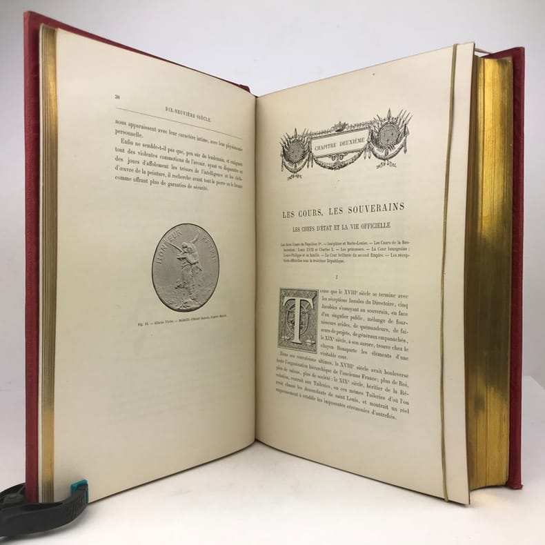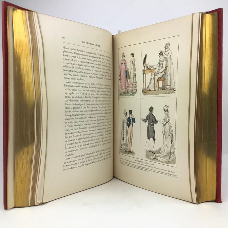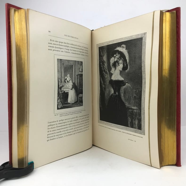 Edition originale (Vicaire, III, 1094-1095) imprimée sur papier couché légèrement teinté, abondamment illustrée : en couleurs, hors texte, frontispice en chromolithographie et seize planches coloriées au « patron » (i e pochoir) ; dans le texte, en noir, 487 gravures (dont vingt-quatre « hors-texte », verso vierge, compris dans la pagination et dix à pleine page, verso imprimé), reproduites d’après les œuvres d’artistes vivants (Bonnat, Leloir, Rops, etc.., une soixantaine) et , surtout, disparus appartenant au XIX° (Cham, Devéria, Ingres, Manet, Raffet, etc… , plus du double), donnant un richesse iconographique exceptionnelle : Grand-Carteret, grand continuateur du Bibliophile Jacob. Ce livre est une véritable encyclopédie du XIX° siècle. Très belle réalisation, en condition presque parfaite. GAR(V3 G)