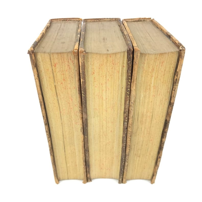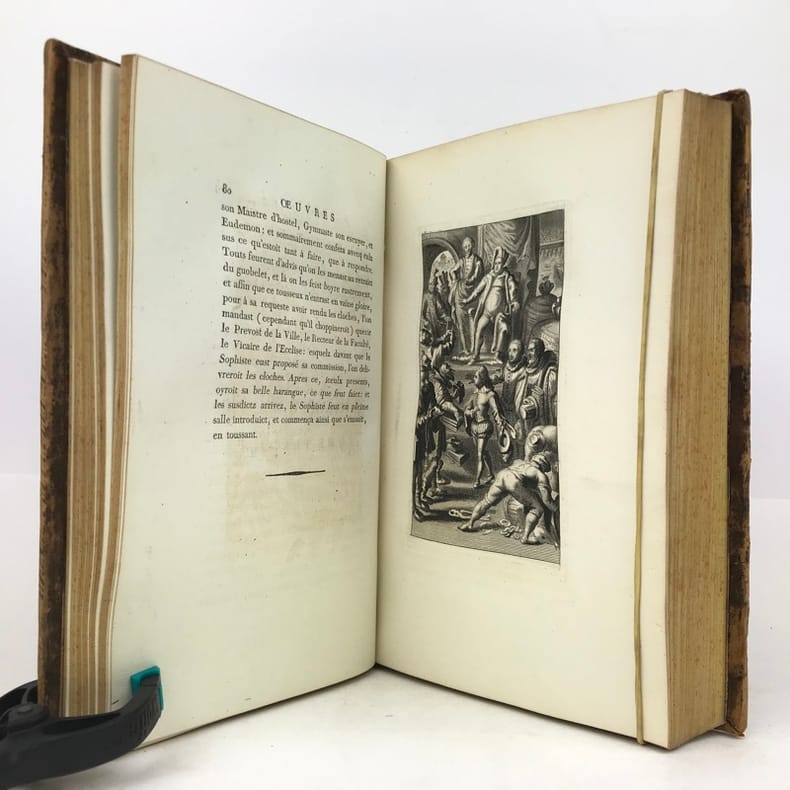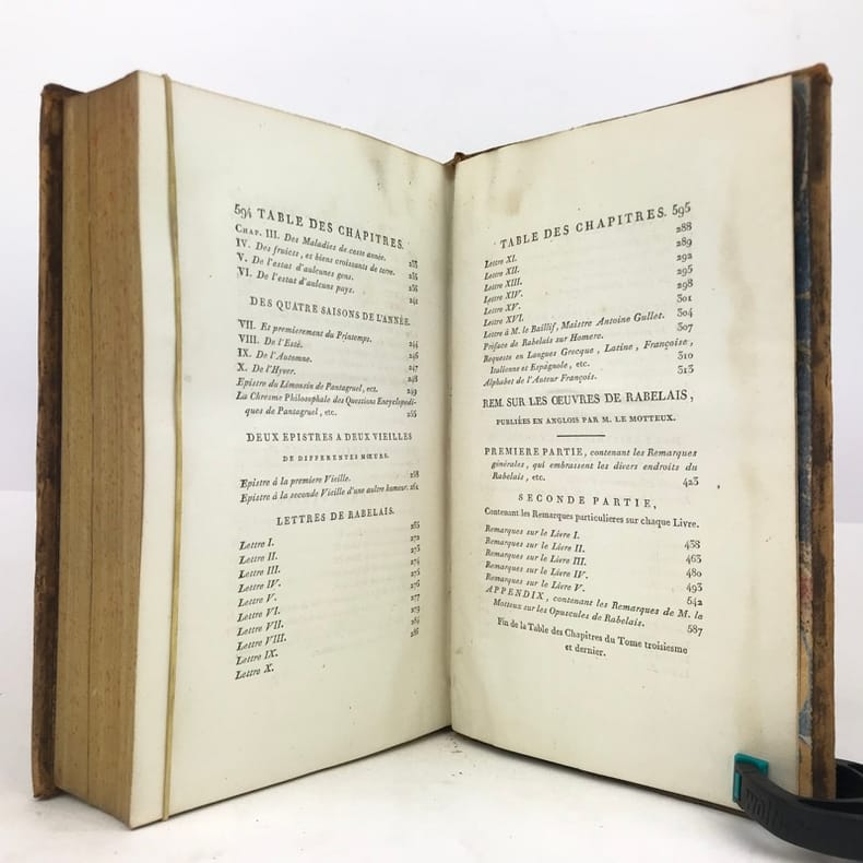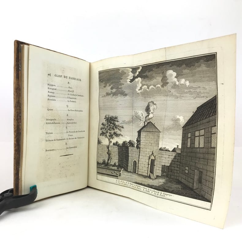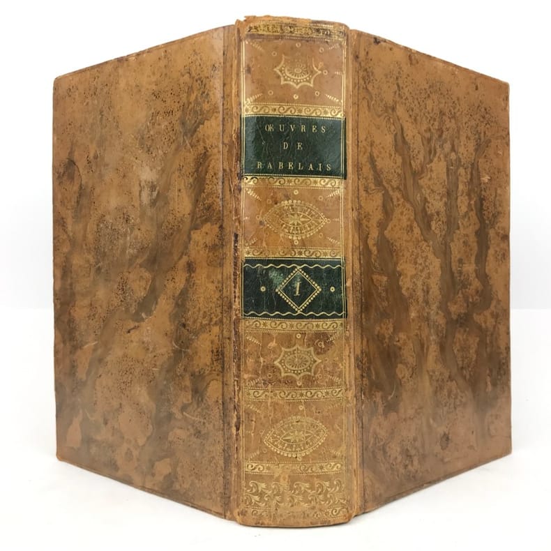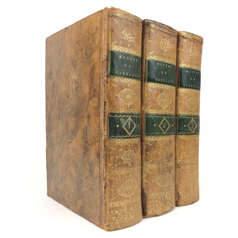 3 volumes in-8 (22 x 14,5 cm), veau fauve raciné (reliure de l’époque), dos lisse orné, pièces de titre et de tomaison en maroquin vert, filet à froid encadrant les plats, tranches mouchetées, [4]-xvi-479-[1] ; [4]-634 ; [4]-595 pages (complet). Léger accroc à la coiffe de queue du tome II, mors supérieur du tome III restauré en tête, quelques frottements aux coins et coupes, rares rousseurs. État très correct. Nouvelle édition, illustrée d’un portrait de l’auteur en frontispice, de 74 planches hors-texte dont 3 dépliantes, ainsi que d’une carte. Les principales œuvres de François Rabelais (ca.1483-1553), dont les célèbres Gargantua et Pantagruel, sont ici largement commentées par Peter Anthony Motteux (1663-1718), Poète, traducteur et librettiste franco-anglais. Agréable exemplaire.