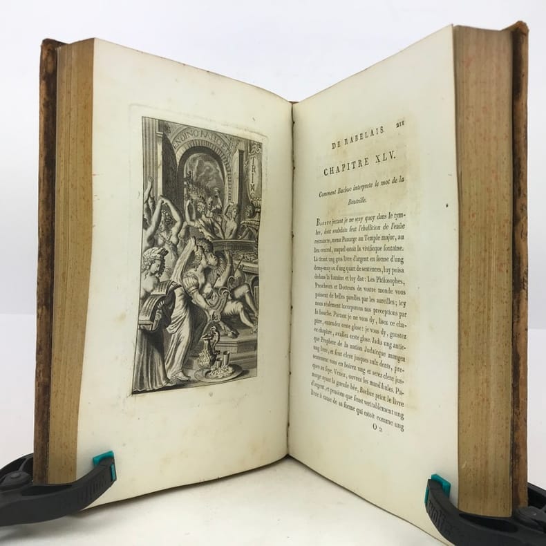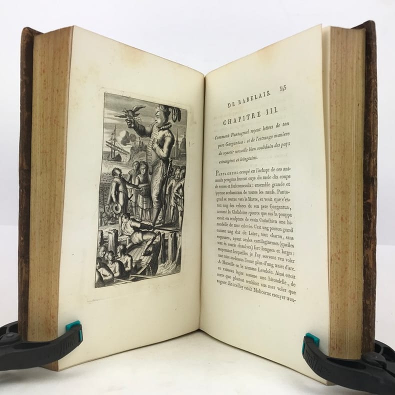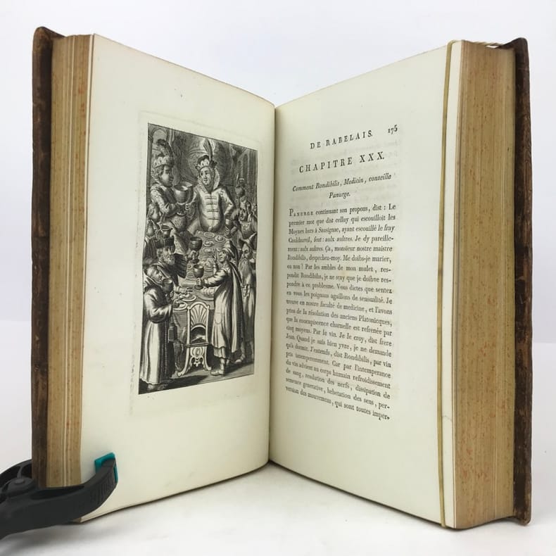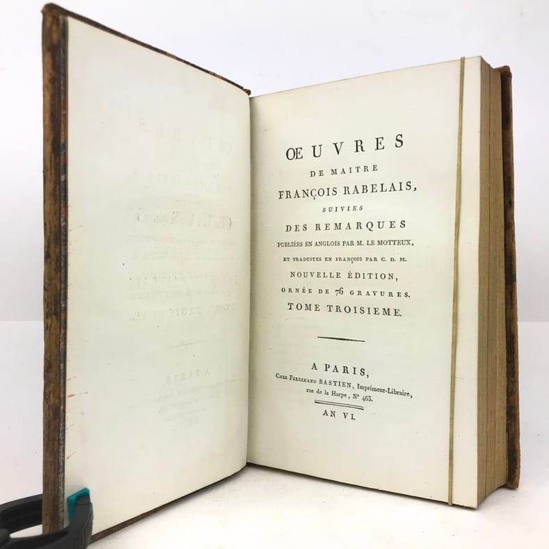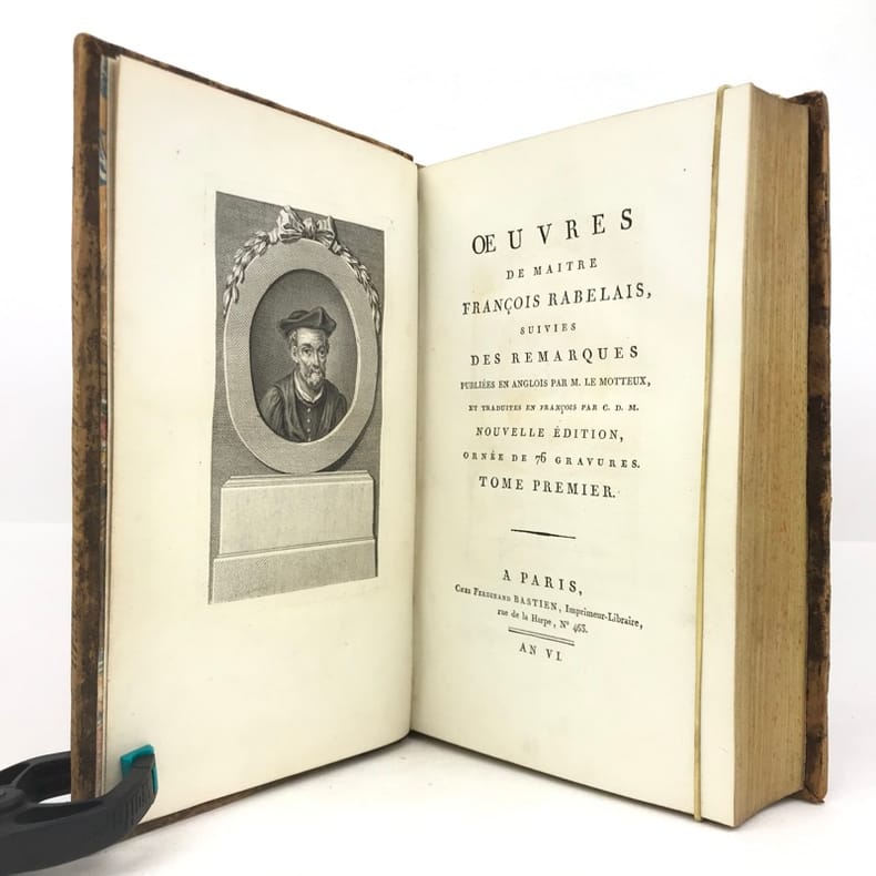 Premier tirage. Un portrait-frontispice de Rabelais et 75 - dont 4 dépliantes - planches hors texte gravées sur cuivre, le tout en tirage avant la lettre. Un des 250 exemplaires sur grand papier vélin au format in-4. Cette belle édition illustrée s'adressait, dès l'origine, aux bibliophiles, comme le montre L'Avis du libraire placé en tête du premier volume et qui indique le choix de proposer des grands papiers et de limiter le tirage. Au texte de Rabelais s'ajoutent les remarques du normand Pierre-Antoine Le Motteux, huguenot exilé à Londres, responsable, à la fin du XVIIe siècle, de la première traduction complète de Rabelais en langue anglaise. Ces remarques sont assez notables pour avoir servi de nouveau en 1830 de référence à un texte du grand médiéviste et philologue Francisque Michel dont le Rabelais analysé, qui plus est, prenait précisément comme point de départ les 76 gravures de la présente édition. Bel exemplaire dans de décoratives reliures signées de l'époque : elles portent l'étiquette de Lenoir, relieur à Lyon. Ramsden (French Bookbinders 1789-1848) le cite et situe son travail au tout début du XIXe siècle. Cohen, Guide de l'amateur de livres à gravures du XVIIIe siècle, 843. - Monglond, La France révolutionnaire et impériale, IV, 582-587. - Rahir, La Bibliothèque de l'amateur, 599.