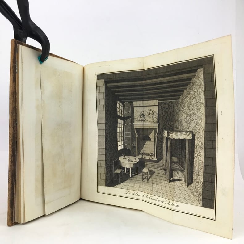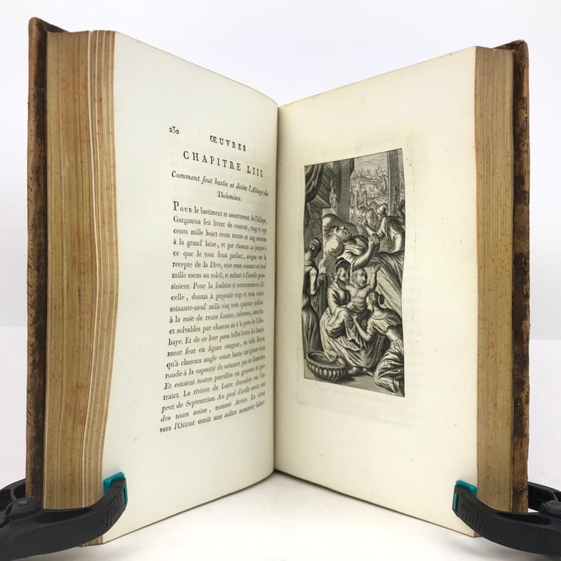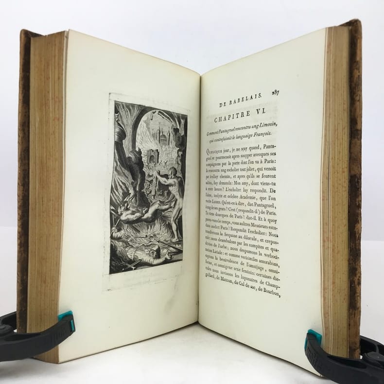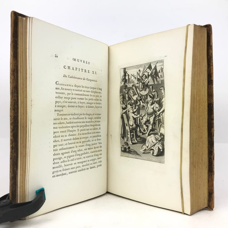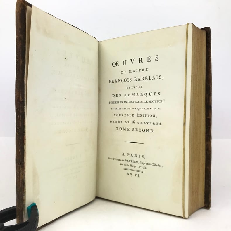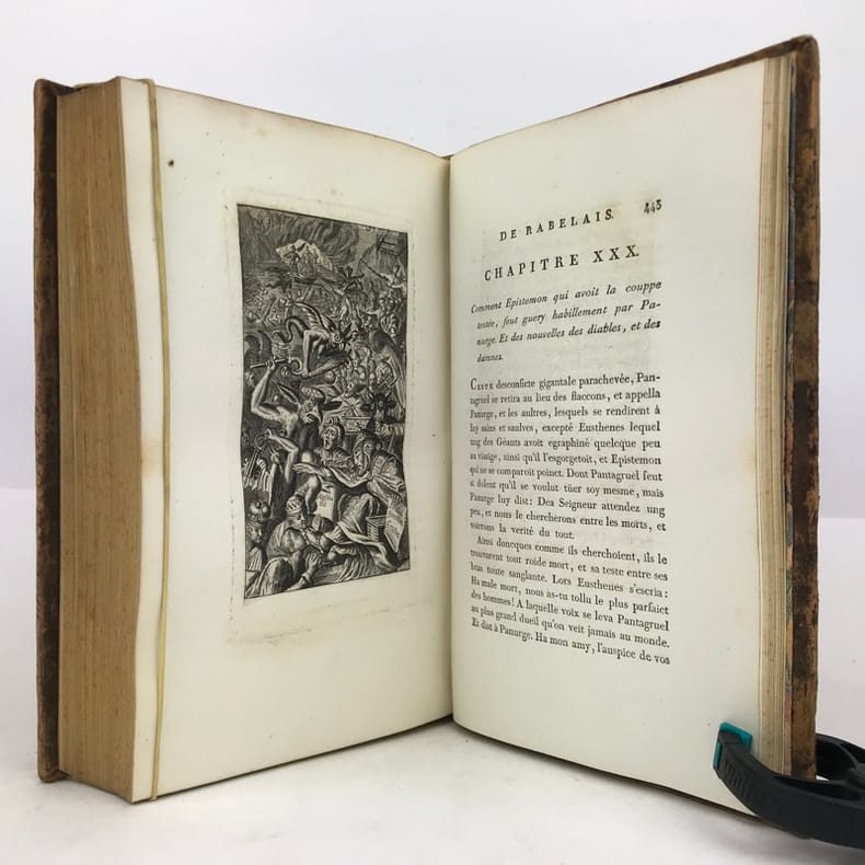 Premier tirage. Un portrait-frontispice de Rabelais et 75 - dont 4 dépliantes - planches hors texte gravées sur cuivre, le tout en tirage avant la lettre. Un des 250 exemplaires sur grand papier vélin au format in-4. Cette belle édition illustrée s'adressait, dès l'origine, aux bibliophiles, comme le montre L'Avis du libraire placé en tête du premier volume et qui indique le choix de proposer des grands papiers et de limiter le tirage. Au texte de Rabelais s'ajoutent les remarques du normand Pierre-Antoine Le Motteux, huguenot exilé à Londres, responsable, à la fin du XVIIe siècle, de la première traduction complète de Rabelais en langue anglaise. Ces remarques sont assez notables pour avoir servi de nouveau en 1830 de référence à un texte du grand médiéviste et philologue Francisque Michel dont le Rabelais analysé, qui plus est, prenait précisément comme point de départ les 76 gravures de la présente édition. Bel exemplaire dans de décoratives reliures signées de l'époque : elles portent l'étiquette de Lenoir, relieur à Lyon. Ramsden (French Bookbinders 1789-1848) le cite et situe son travail au tout début du XIXe siècle. Cohen, Guide de l'amateur de livres à gravures du XVIIIe siècle, 843. - Monglond, La France révolutionnaire et impériale, IV, 582-587. - Rahir, La Bibliothèque de l'amateur, 599.