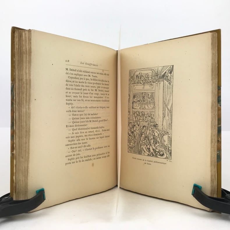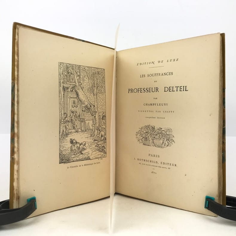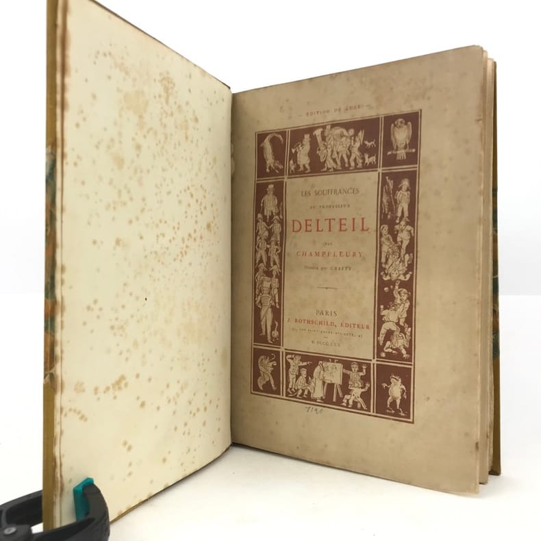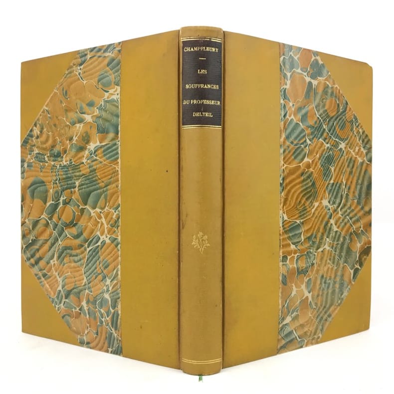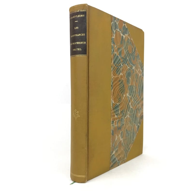 1 volume in-8 (21,5 x 15 cm), bradel demi-percaline citron à coins (reliure de l’époque), dos lisse orné d’un fleuron et d’un double filet, dorés, pièce de titre brune, tête dorée, couverture illustrée et dos conservés, ex-libris sur le contreplat aux initiales “SB”, cachet ex-libris, et ex-libris manuscrit d’André Barrier sur un feuillet de garde, [4]-ii-298 pages (complet). Seconde de couverture et dos doublés avec petites pertes de papier en pied du dos, rousseurs éparses sans gêne de lecture. État très correct. Nouvelle édition dite “de luxe” de ce roman d'une enfance provinciale, illustrée par Crafty, dont 6 planches hors texte et de nombreux dessins in texte. Jules François Félix Husson, dit Fleury, dit Champfleury, (1821-1889), journaliste, critique d’art et de littérature, nouvelliste et romancier français. Bon exemplaire.