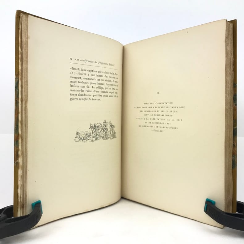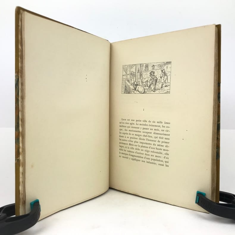 Paris Michel Lévy frères 1857 1 vol. relié in-12, bradel demi-percaline taupe à coins, pièce de titre de basane verte avec fleuron doré au dos, couvertures conservées, non rogné (Thivet), 247 pp. Première édition séparée de cette satire de moeurs provinciales d'abord parue dans les Contes d'été (Lecou, 1853). Excellent exemplaire enrichi des 4 belles eaux-fortes de Cham exécutées pour la réédition de Poulet-Malassis en 1861 (Oberlé, 311).