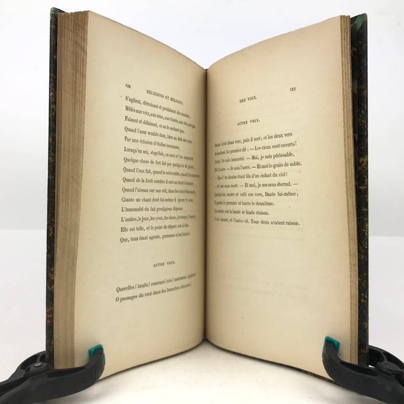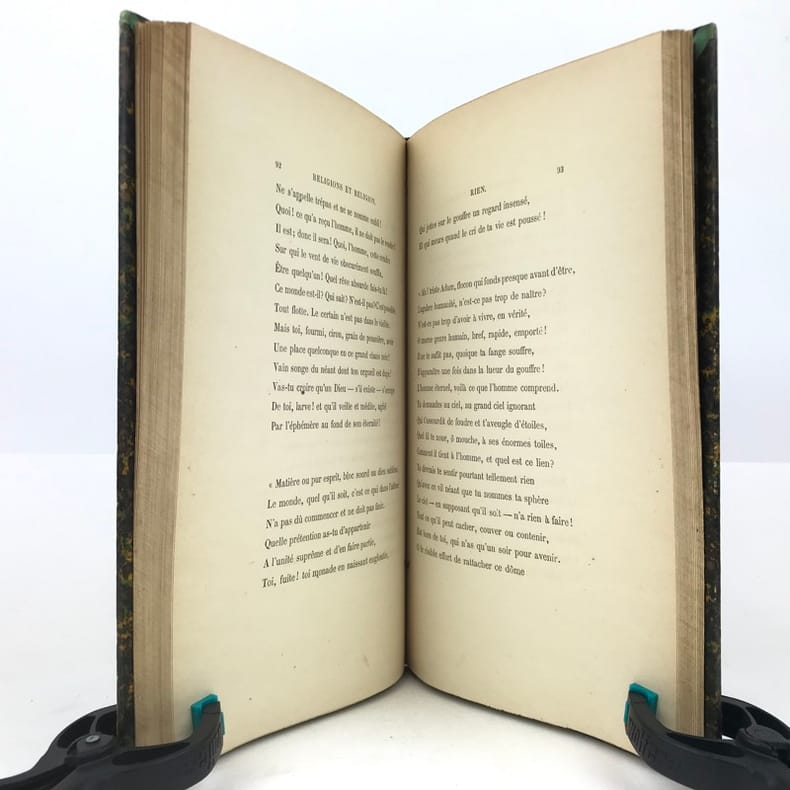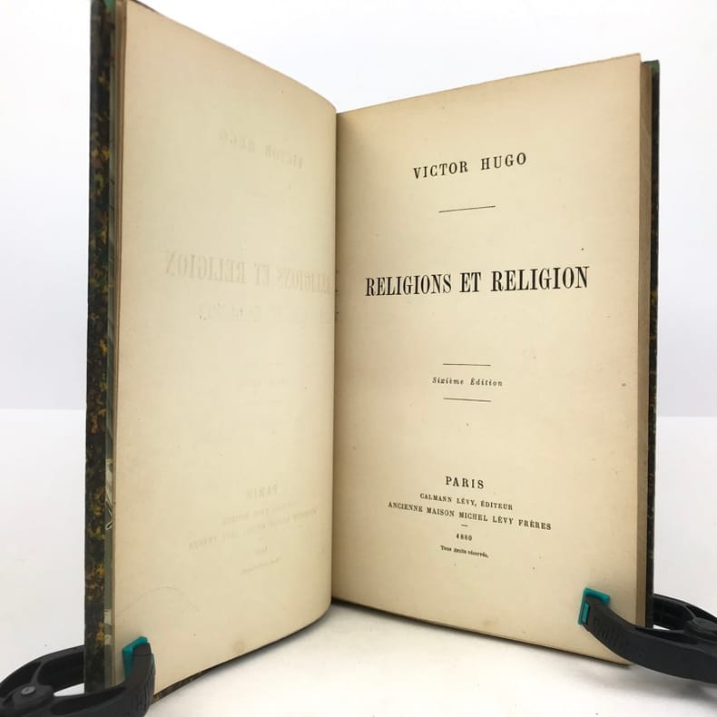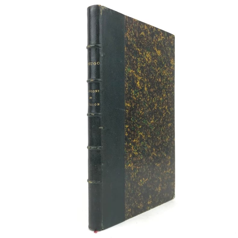1 volume in-8 (23,3 x 14,5 cm) demi-chagrin vert lierre (reliure de l’époque), dos à nerfs avec auteur et titre doré, [6]-141-[3] pages (complet). Petits frottements au dos, sur les coiffes, les nerfs et les charnières, légers accrocs sur le second plat, rares pâles rousseurs. État très correct. Sixième édition publiée la même année que l’édition originale. “Religions et religion” est un long poème de Victor Hugo publié en avril 1880. Il aborde des thèmes philosophiques et religieux, avec une réflexion sur les différentes religions humaines. En résumé, le poème est une méditation sur la spiritualité, appelant à transcender les divisions religieuses pour atteindre une compréhension plus universelle et humaine de la foi. Exemplaire sur papier d’édition. Bon exemplaire.