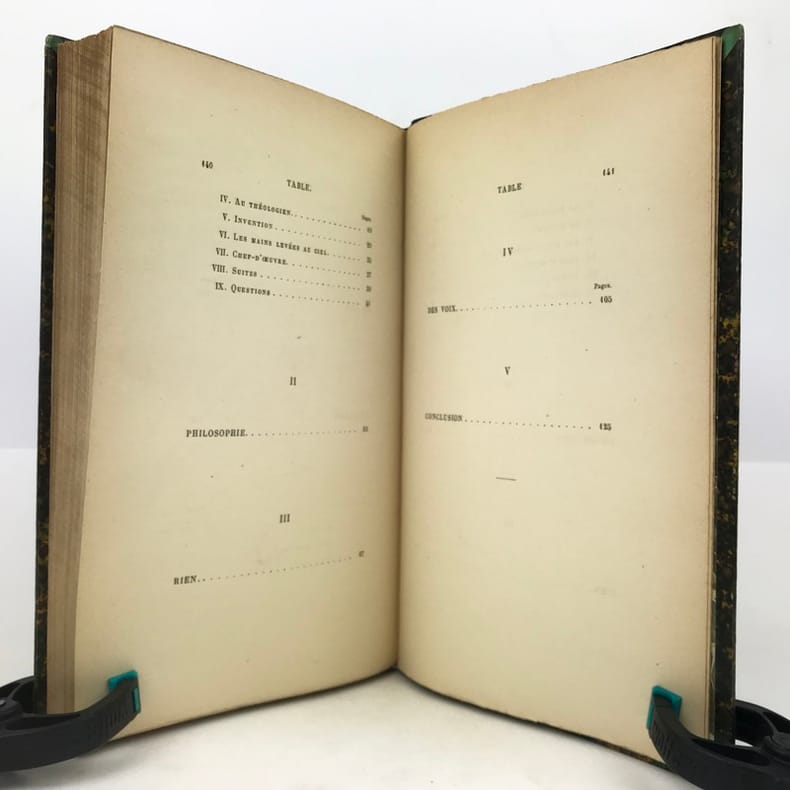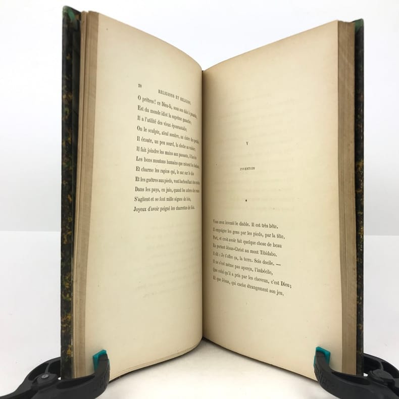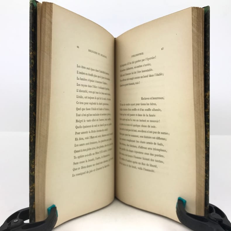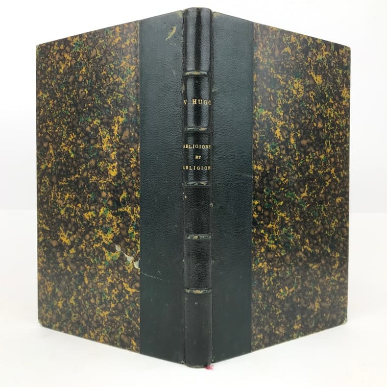 L'exemplaire - agréablement relié - renferme deux ouvrages de Victor Hugo. Le Pape est ici en édition originale, exempte de toute mention d'édition. Religions et religion - également en originale - est quant à lui pourvu d'une mention fictive d'édition en page de titre. ''Le Pape fut rédigé en réaction au principe de l'infaillibilité pontificale établi en 1870. Dans cette œuvre Hugo expose sa pensée religieuse tout en critiquant de façon ironique la papauté ; tendant ainsi à mettre en lumière l'anticléricalisme de l'auteur''. ''Perceras-tu, toi l'homme, un trou dans la lumière Pour y loger ce Dieu que ton esprit forma D'un peu de Jupiter et d'un peu de Brahma ?'' (in Religions et religion). Pour Le Pape : Clouzot, Guide du bibliophile français, p. 93 - Vicaire IV, Manuel de l'amateur de livres du XIXème, 358 - Carteret I, Le Trésor du bibliophile romantique et moderne, p. 426. Pour Religions et religion : Clouzot, Guide du bibliophile français, p. 93 - Vicaire IV, Manuel de l'amateur de livres du XIXème, 360 - Carteret I, Le Trésor du bibliophile romantique et moderne, p. 427. Coiffe de tête arasée. Angles et coupes légèrement élimés. Claires rousseurs affectant le premier texte. Nonobstant, belle condition.