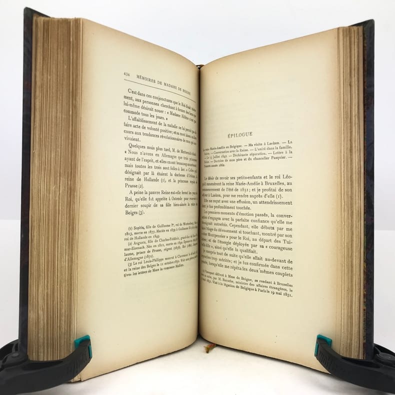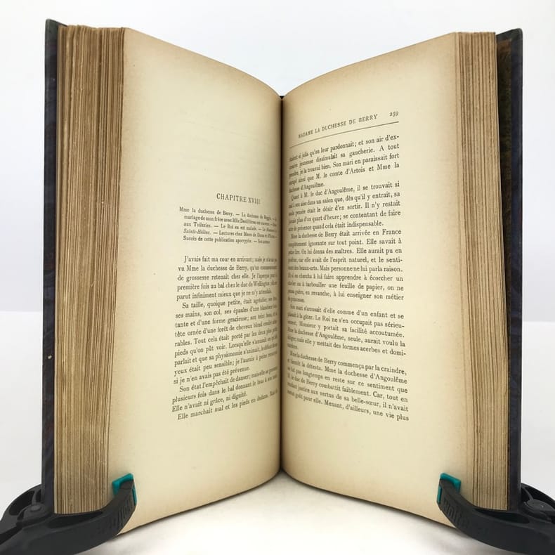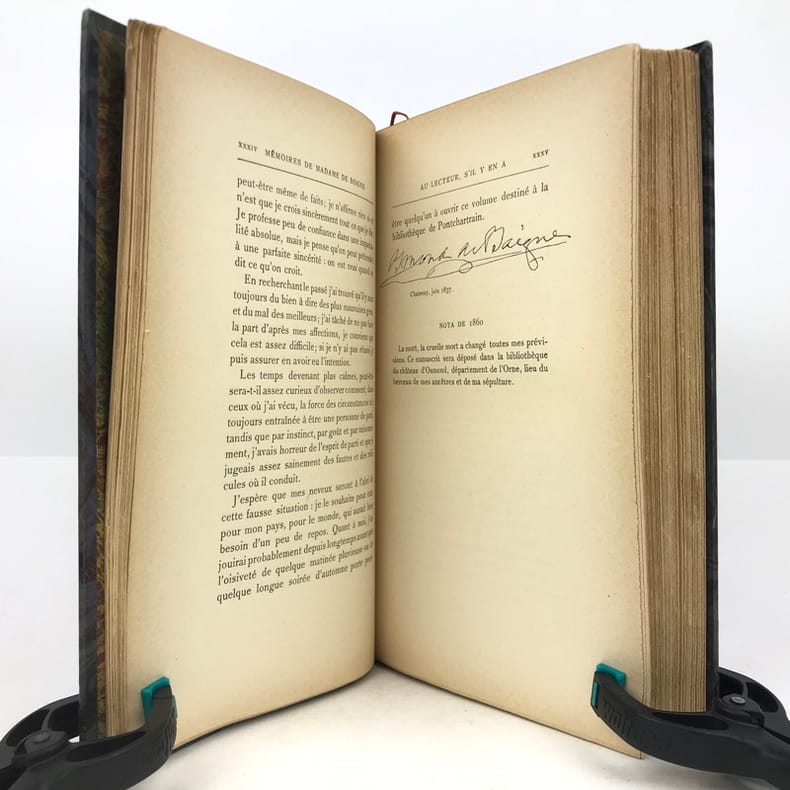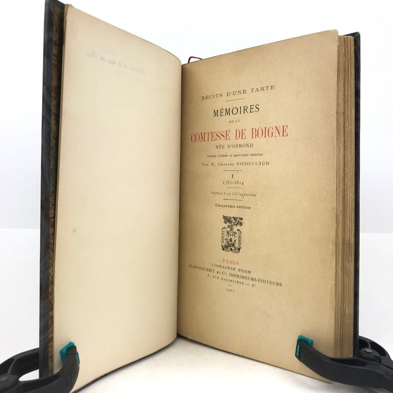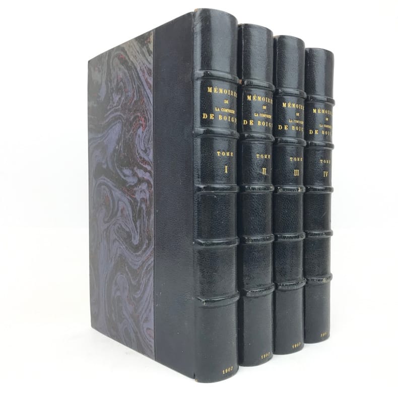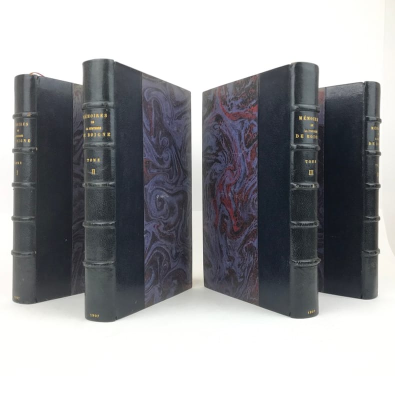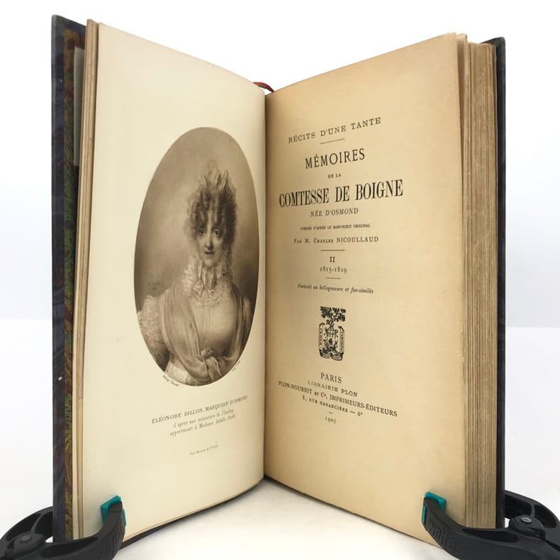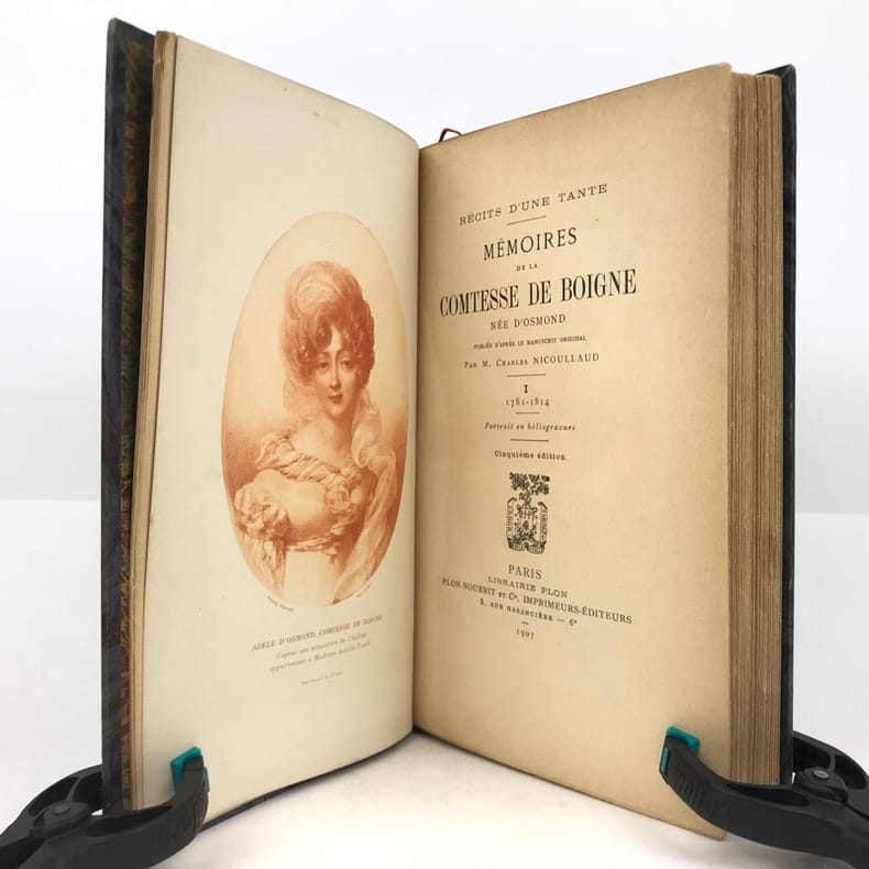 4 volumes in-8 (22 x 14 cm), demi-maroquin noir (reliure de l’époque), couverture conservée, dos à nerfs orné, tranche de tête dorée, quelques commentaires manuscrits marginaux, [6]-xxxv-[1]-505-[3] ; [4]-434 ; [4]-448 ; [4]-547-[1] pages (complet). Quelques rousseurs. État très correct. Nouvelle édition, illustrée de trois portraits de la comtesse en héliogravure, placés en frontispice, et d’un fac-similé dépliant. Charles Nicoullaud (1854-1925) est un astrologue, essayiste et antimaçon français. Il publie ici de manière posthume les mémoires d’Adélaïde Charlotte Louise Éléonore dite Adèle d'Osmond (1781-1866), par son mariage comtesse de Boigne. Elle fut très proche tout au long de sa vie de la famille d’Orléans, et ses mémoires témoignent du traitement des aristocrates au XIXe siècle. PROVENANCE : étiquettes d’ex-libris d’André Barrier (Président à la Cour des comptes et Président des Cent Bibliophiles) et de Serge Barrier. Agréable exemplaire.