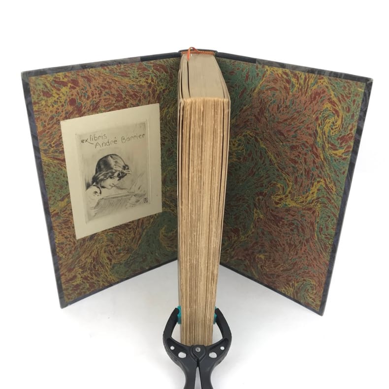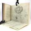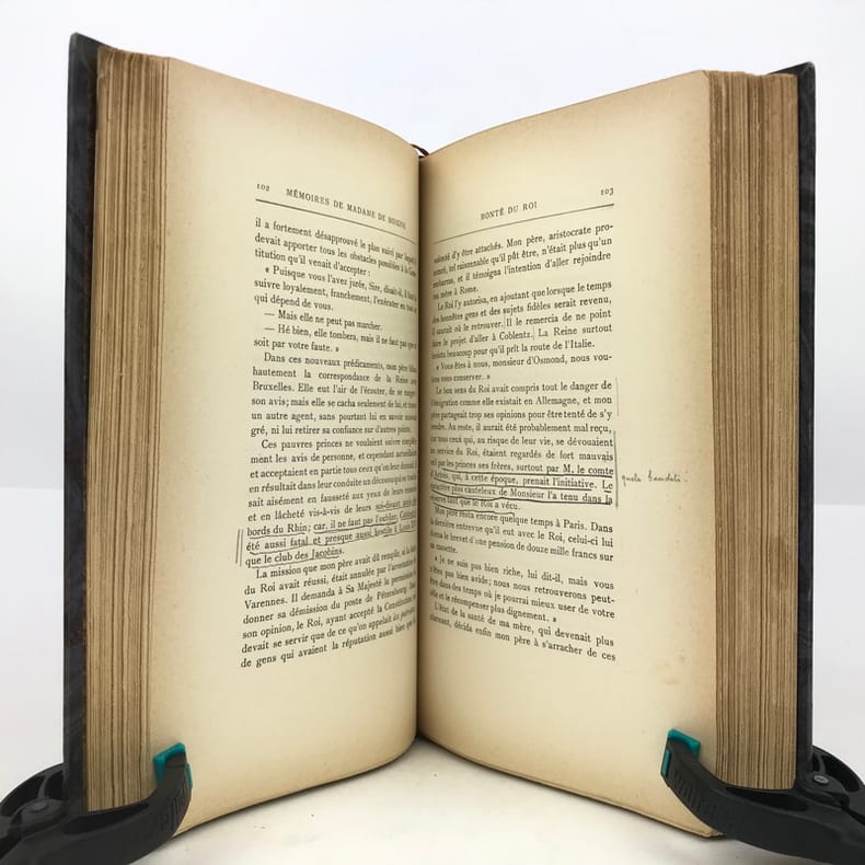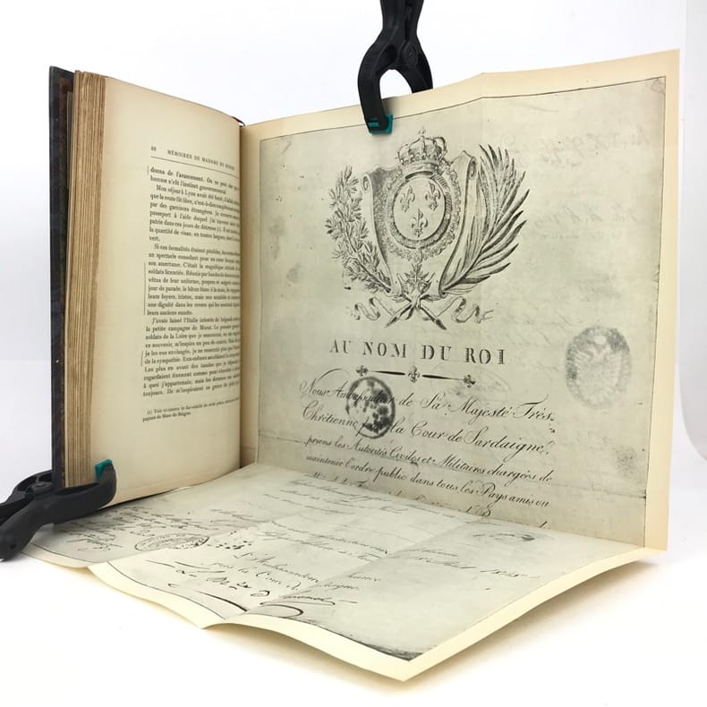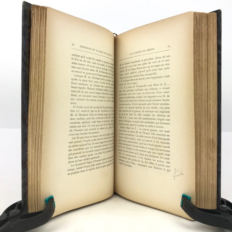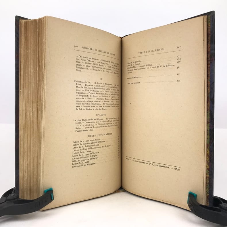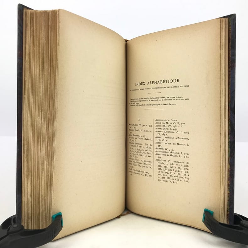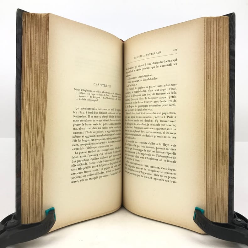 4 volumes in-8 (22 x 14 cm), demi-maroquin noir (reliure de l’époque), couverture conservée, dos à nerfs orné, tranche de tête dorée, quelques commentaires manuscrits marginaux, [6]-xxxv-[1]-505-[3] ; [4]-434 ; [4]-448 ; [4]-547-[1] pages (complet). Quelques rousseurs. État très correct. Nouvelle édition, illustrée de trois portraits de la comtesse en héliogravure, placés en frontispice, et d’un fac-similé dépliant. Charles Nicoullaud (1854-1925) est un astrologue, essayiste et antimaçon français. Il publie ici de manière posthume les mémoires d’Adélaïde Charlotte Louise Éléonore dite Adèle d'Osmond (1781-1866), par son mariage comtesse de Boigne. Elle fut très proche tout au long de sa vie de la famille d’Orléans, et ses mémoires témoignent du traitement des aristocrates au XIXe siècle. PROVENANCE : étiquettes d’ex-libris d’André Barrier (Président à la Cour des comptes et Président des Cent Bibliophiles) et de Serge Barrier. Agréable exemplaire.