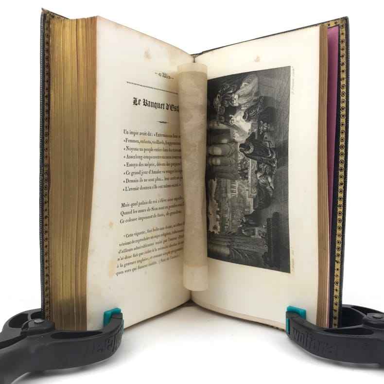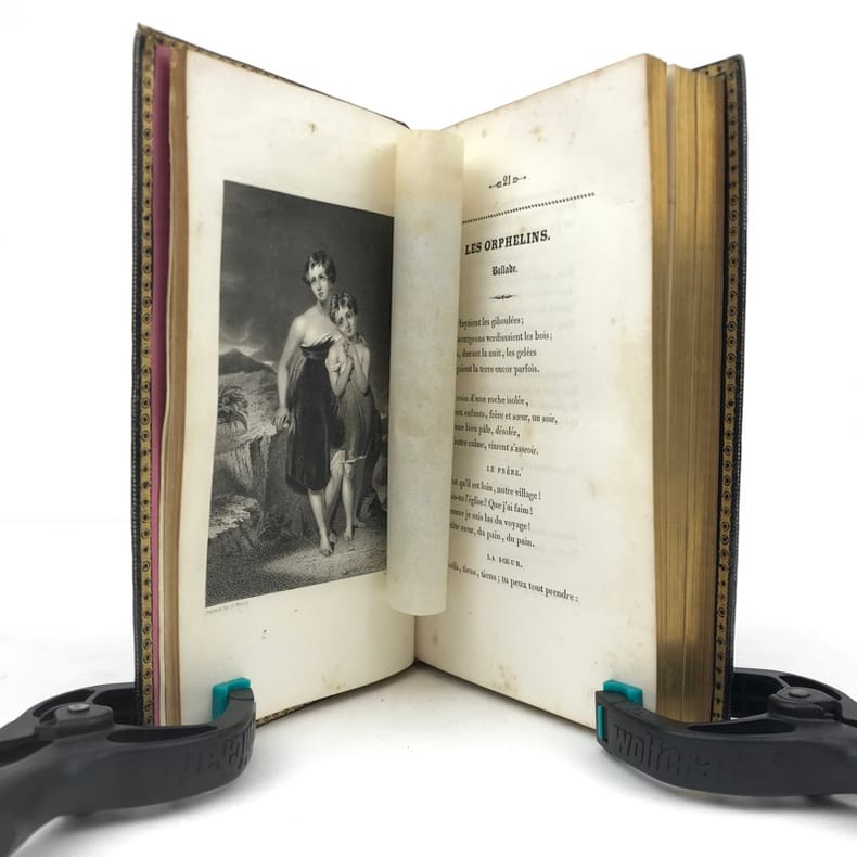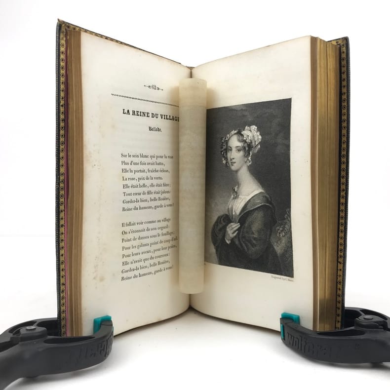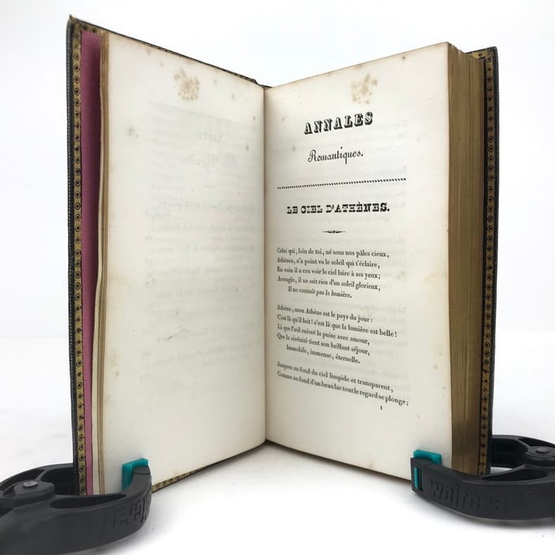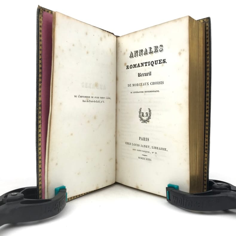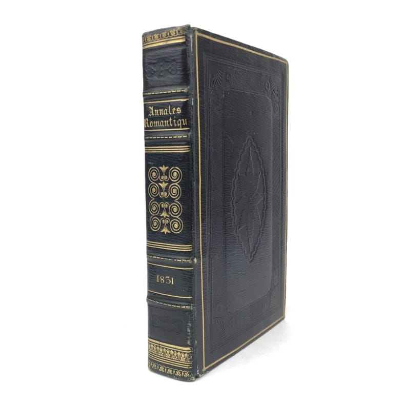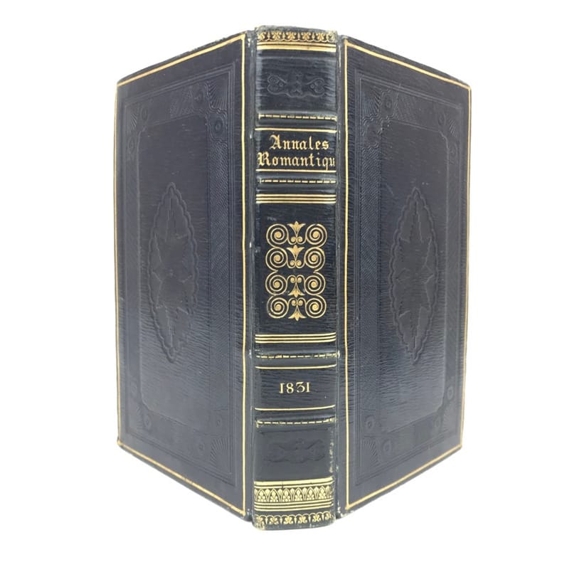 Recueil de poésies, scènes de théâtre et cours textes littéraires par 47 auteurs dont des textes inédits de Théophile Gautier, Alfred de Musset ou le Bibliophile Jacob. Il est illustré de huit jolies gravures sur acier sous serpentes, toutes par des graveurs et d'après des artistes différents.La collection des Annales romantiques fait partie d'une collection de 12 volumes parus de 1823 à 1836. On y trouve "beaucoup de pièces alors inédites d'écrivains célèbres". "Dans cette collection devenue rare, à rechercher surtout en reliure de l'époque (...). C'est un ensemble d'ouvrages (...) qui sont le prototype du keepsake, comme Le Saphir, paru en 1832, L'Emeraude, 1832, La Corbeille d'or, 1836".Rousseurs éparses, plus importante au niveau des planches. Petits frottements à la reliure.Charmante reliure romantique..Vicaire, I, 68-71. Carteret, III, 34.