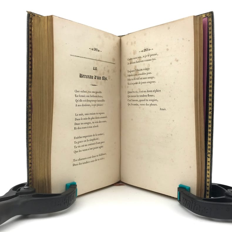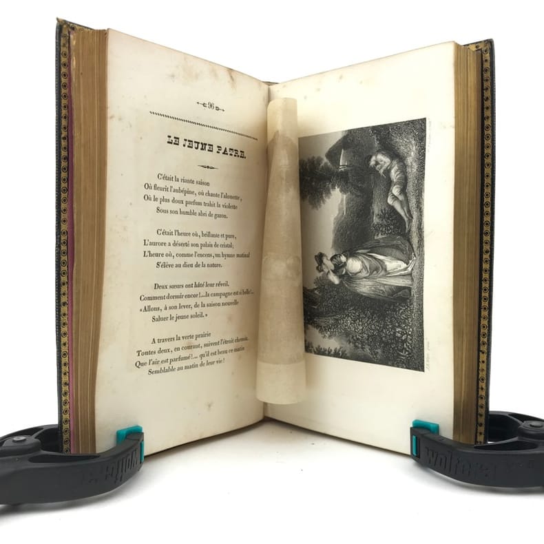 Paris, Louis Janet, 1832 in-16, [4] ff. n. ch. (faux-titre et titre, liste des auteurs, table des gravures), 351 pp., avec 8 planches gravées, sous serpentes, veau violine, dos à nerfs orné de filets et caissons dorés, encadrement de triple filet doré sur les plats, tranches dorées, dentelle intérieure (reliure de l'époque). Bel exemplaire.