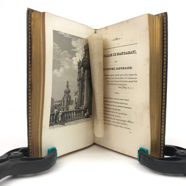 In-16 (151 x 101 mm), (1) ff., vj pp., 367 pp., veau vert, dos à quatre nerfs et plats ornés or et à froid d'un décor à la cathédrale, dentelle sur les coupes et intérieure, tranches dorées (reliure d'époque). Textes inédits en vers ou en prose de Hugo, Nodier, Mme Cottin, Desbordes-Valmore, Genlis, Salm, etc. Orné de huit gravures sur acier hors-texte, d'après W. Daniell, Stéphanoff, C. R. Leslie, etc. Cet ouvrage fait partie d'une collection de 12 volumes parus de 1823 à 1836. "Dans cette collection devenue rare, à rechercher surtout en reliure de l'époque, ont paru un grand nombre de pièces d'auteurs célèbres qui sont ici en édition originale (.). C'est un ensemble d'ouvrages (.) qui sont le prototype du keepsake, comme Le Saphir, paru en 1832, L'Emeraude, 1832, La Corbeille d'or, 1836" (.). Carteret tome 3, p. 34. (coiffes usées, frottements, charnière supérieure fendue dans le haut, page de titre rognée, rousseurs). // 16o (151 x 101 mm), (1) ff., vj pp., 367 pp., green calf, spine raised on four bands and covers tooled in gilt and blind with a "cathedral" romantic pattern, dentelle on turns-in and inside, gilt edges (contemporary binding). Original texts in prose or verse by Hugo, Nodier, Mme Cottin, Desbordes-Valmore, Genlis, Salm, etc. Illustrated with 8 steel-engravings, after W. Daniell, Stéphanoff, C. R. Leslie, etc. This book is a part of a 12 volumes collection published from 1823 to 1836. "Dans cette collection devenue rare, à rechercher surtout en reliure de l'époque, ont paru un grand nombre de pièces d'auteurs célèbres qui sont ici en édition originale (.). C'est un ensemble d'ouvrages (.) qui sont le prototype du keepsake, comme Le Saphir, paru en 1832, L'Emeraude, 1832, La Corbeille d'or, 1836" (.). Carteret tome 3, p. 34. (spine extremities used, rubbings, upper hinge cracked on top, title page a bit cut, brownings).