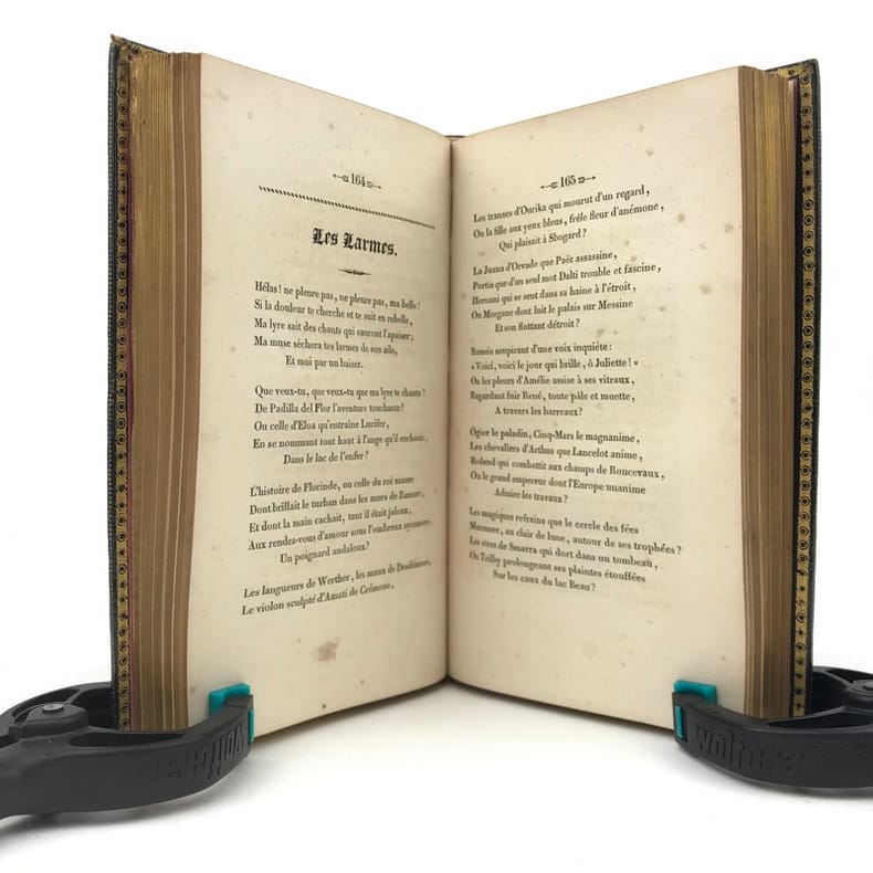 Paris, Louis Janet, 1834. 1 vol. in-18. [4]ff, 315pp. Plein veau bleu glacé, larges plaques romantiques estampées à froid sur les plats, filet doré en encadrement avec petit motif d'angle, dos lisse orné, titre doré, dentelle intérieure, tranches dorées.