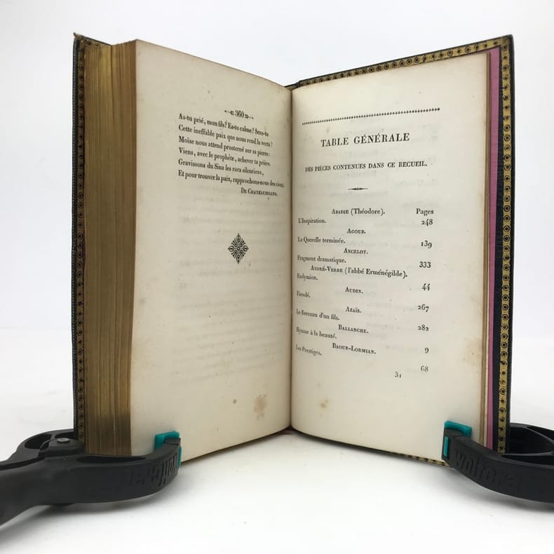 Bel exemplaire dans une jolie reliure d'époque "à la cathédrale" de ce recueil qui comprend des publications inédites de nombreux auteurs romantiques : dont Chateaubriand, Desbordes-Valmore, Delphine Gay, Victor Hugo, X. de Maistre, Resseguier, Alfred de Vigny (Le Cor) et Charles Nodier (La Tour du prisonnier de Gisors). Rare. Asselineau, 102; Lachèvre I, 8; Vicaire I, 69; Grand-Carteret, 2015; Escoffier, 625; Larat, 57; Bender, 23.