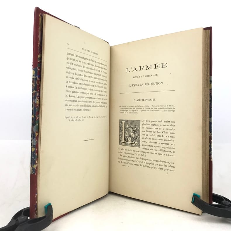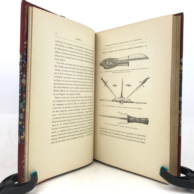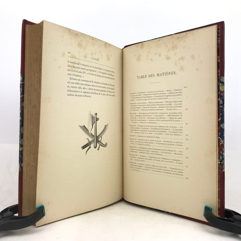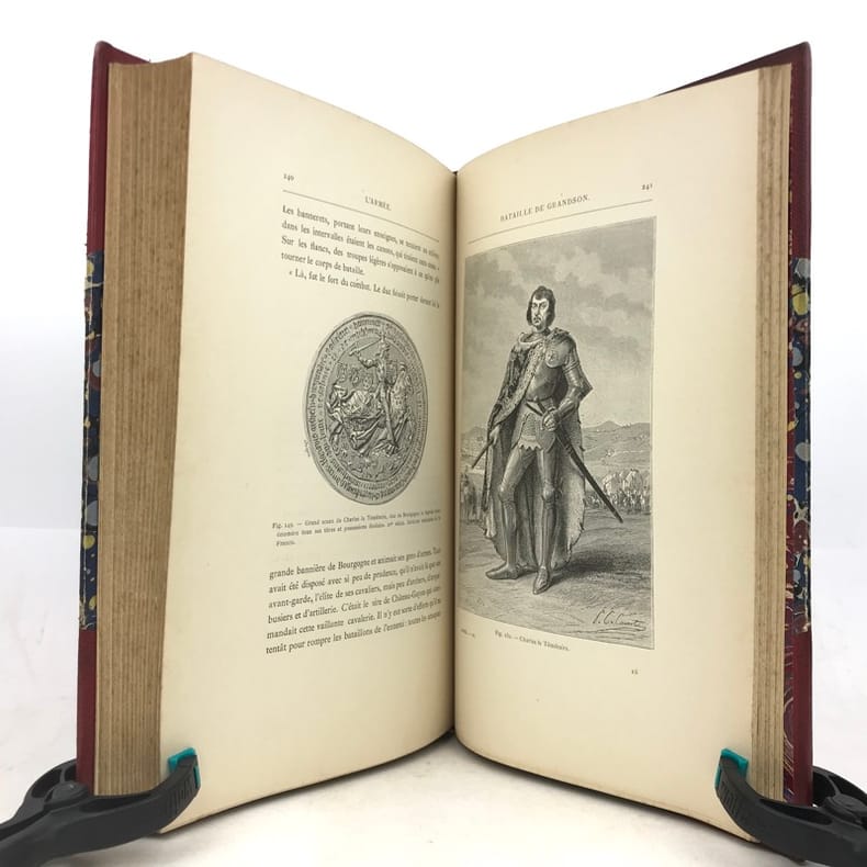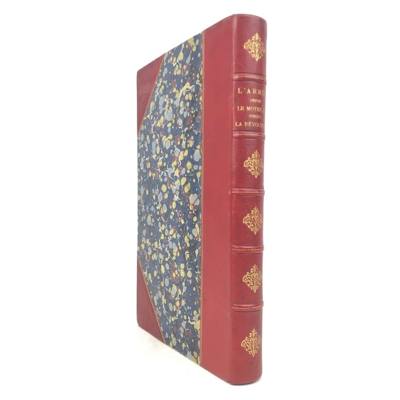 1 volume in-4 (26,5 x 17,5 cm), demi-chagrin rouge à coins (reliure de l’époque), dos à nerfs orné, double filet doré en bordure, tranche de tête dorée, titre en rouge et noir, viii-288 pages (complet). Coins légèrement frottés, rousseurs éparses. État correct. Édition illustrée de 165 gravures in-texte, et une chromolithographie placée en frontispice. Rédigé par Paul Lacroix (1806-1884), aussi appelé le “Bibliophile Jacob”, ce traité historique reprend de manière chronologique les fonctionnements successifs de l’armée française. Il débute son propos avec l’art de la guerre chez les Gaulois, et le conclut avec les dernières guerres du roi Louis XV. Agréable exemplaire.