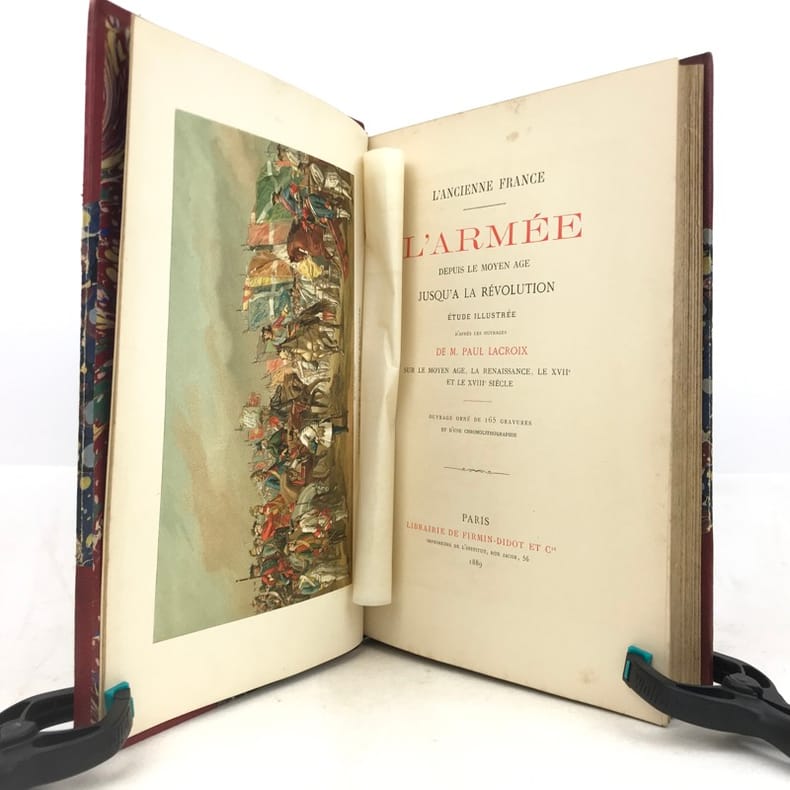 Etude illustrée d’après les ouvrages de M Paul LACROIX in 8 pleine toile rouge d’éditeur à décor passe-partout titre doré au dos avec décor en long et sur le premier plat dans cartouche.faux-tire,frontispice en chromolithographie sous serpente(costumes de l’Armée française)titre,VIII,288 pages,tranches dorées,165 figures dans le texte et pleine page Firmin Didot 1887 rousseurs éparses habituelles, dorure oxydée par endroit,assez bon état d’ensemble.