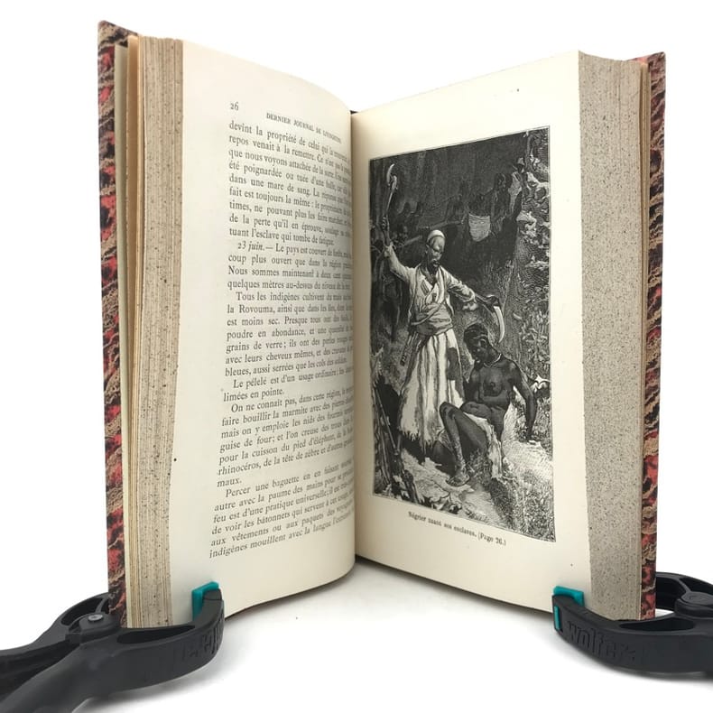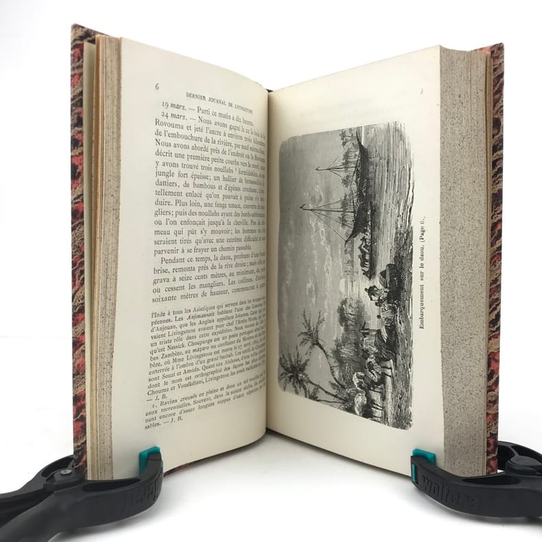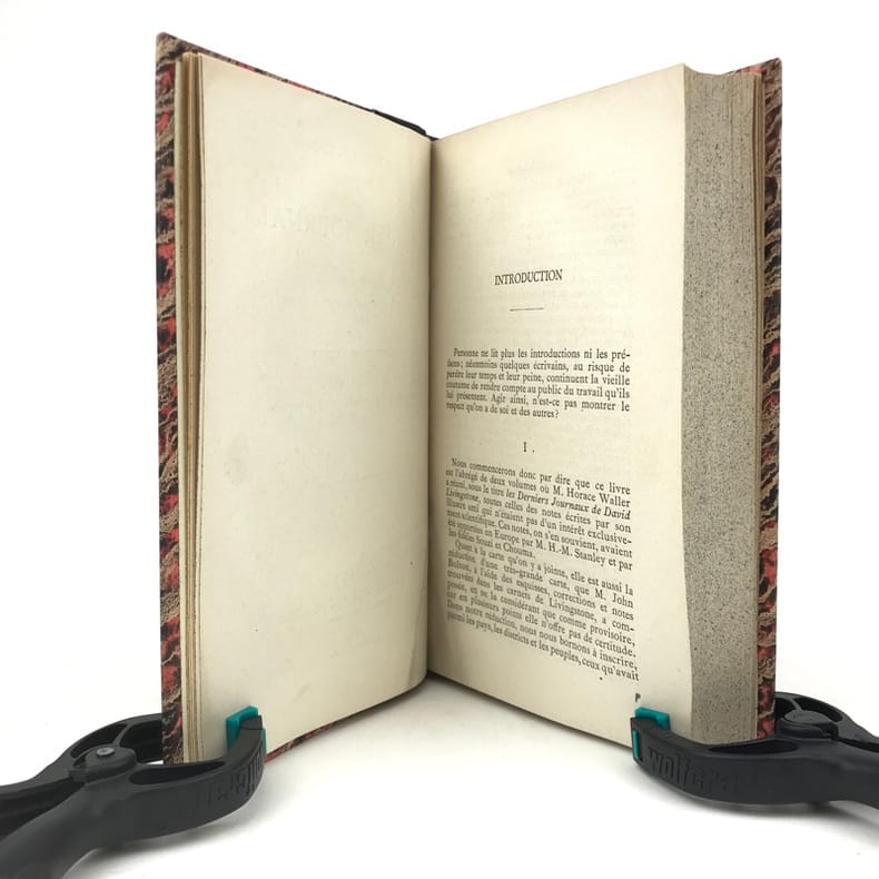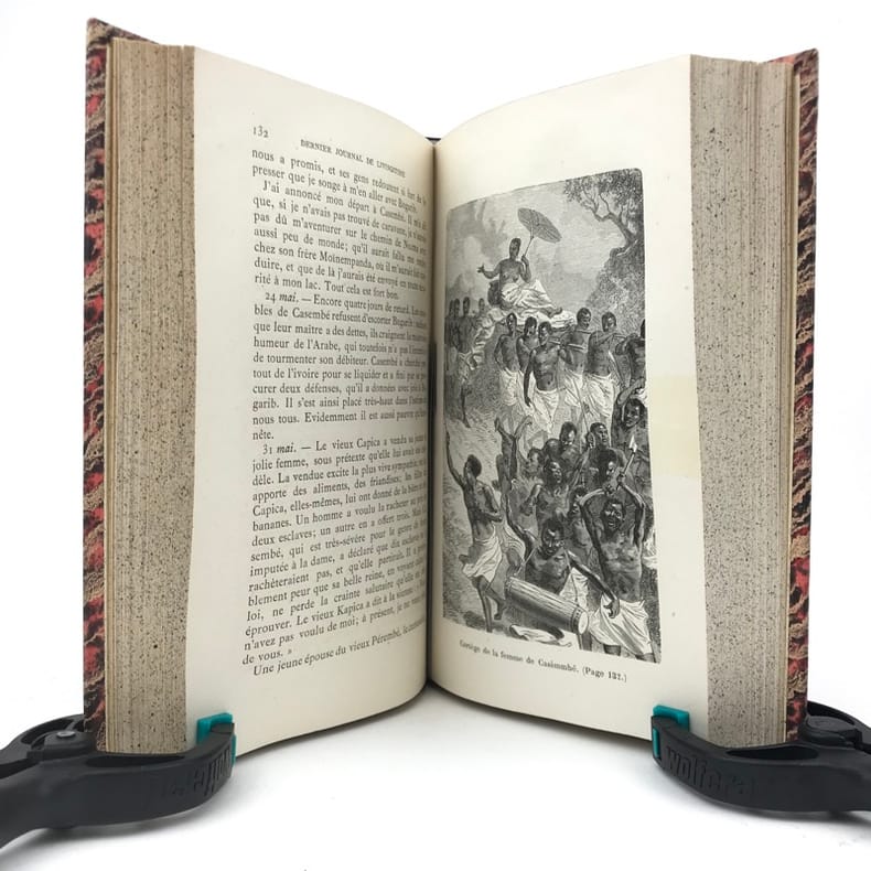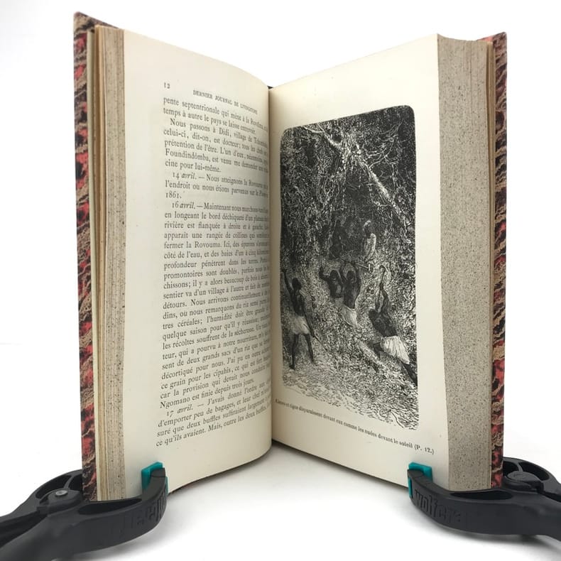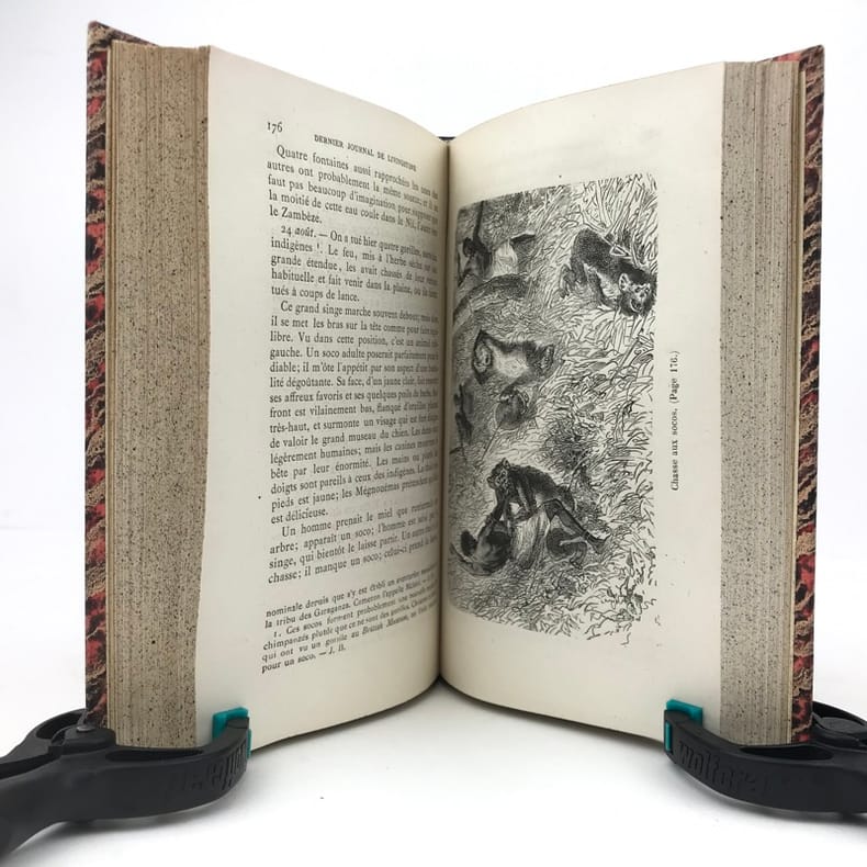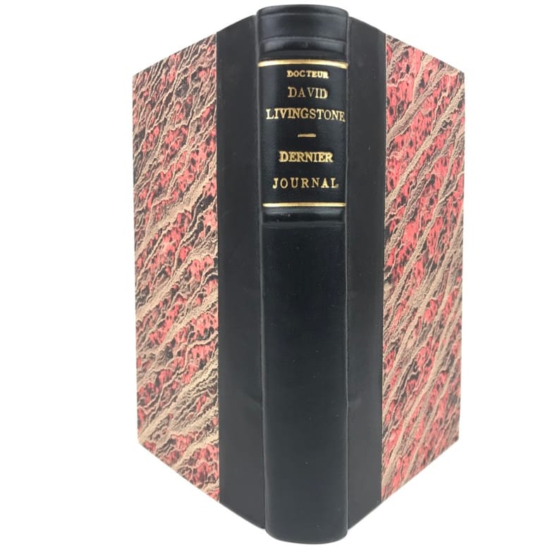 1 volume in-12 (17,7 x 11 cm), demi-veau noir (reliure moderne), dos à 2 nerfs, auteur et titre dorés, [4]-xxiv-306-[2] pages (complet). Premiers et derniers feuillets roussis. Bon état. Édition illustrée de 16 planches hors texte, dont un portrait de l’auteur en frontispice ; et d’une carte dépliante gravée par Erhard. Récit du voyage de Livingstone en Afrique de l'est de Zanzibar à Tchitambo, se terminant par la mort du Docteur aux bords du lac Bangwelo dans l'actuelle Zambie et le retour de ses restes à Westminster. David Livingstone (1813-1873), médecin, missionnaire protestant et explorateur britannique qui contribua à la fois au développement et à la promotion de l'empire commercial britannique d'une part, à la lutte contre la traite esclavagiste et à l'évangélisation du Sud du continent africain d'autre part. Il participa au mouvement d'exploration et de cartographie de l'intérieur du continent africain précédant le « partage de l'Afrique » entre grandes puissances européennes. Livingstone consacra une partie de sa vie à rechercher les sources du Nil. Agréable exemplaire.