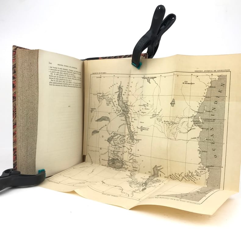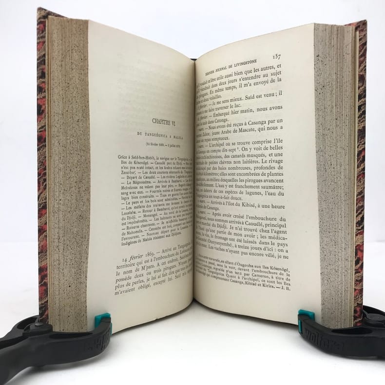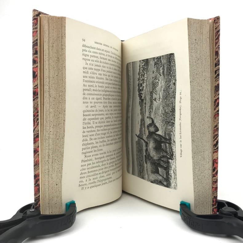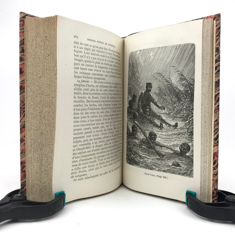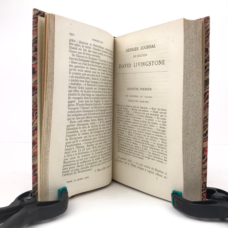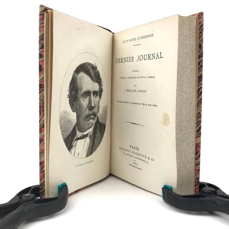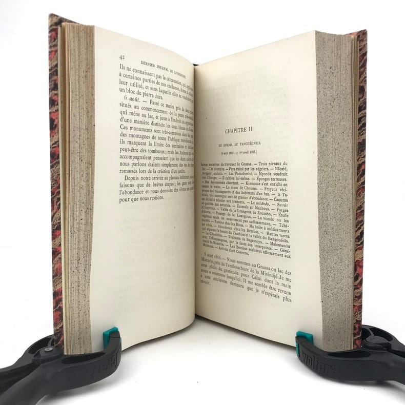 1 volume in-12 (17,7 x 11 cm), demi-veau noir (reliure moderne), dos à 2 nerfs, auteur et titre dorés, [4]-xxiv-306-[2] pages (complet). Premiers et derniers feuillets roussis. Bon état. Édition illustrée de 16 planches hors texte, dont un portrait de l’auteur en frontispice ; et d’une carte dépliante gravée par Erhard. Récit du voyage de Livingstone en Afrique de l'est de Zanzibar à Tchitambo, se terminant par la mort du Docteur aux bords du lac Bangwelo dans l'actuelle Zambie et le retour de ses restes à Westminster. David Livingstone (1813-1873), médecin, missionnaire protestant et explorateur britannique qui contribua à la fois au développement et à la promotion de l'empire commercial britannique d'une part, à la lutte contre la traite esclavagiste et à l'évangélisation du Sud du continent africain d'autre part. Il participa au mouvement d'exploration et de cartographie de l'intérieur du continent africain précédant le « partage de l'Afrique » entre grandes puissances européennes. Livingstone consacra une partie de sa vie à rechercher les sources du Nil. Agréable exemplaire.