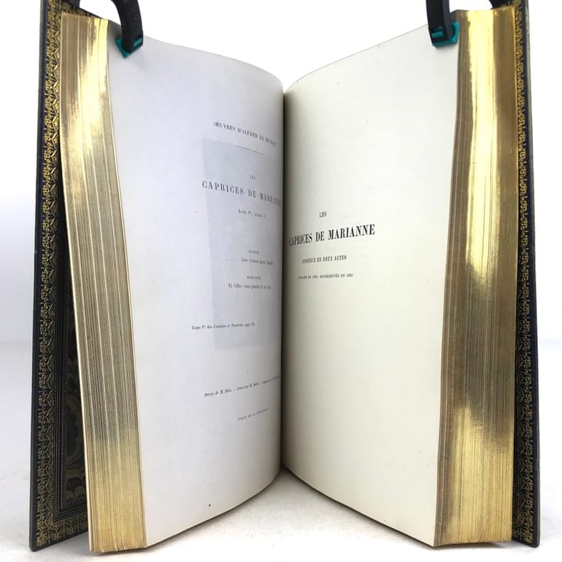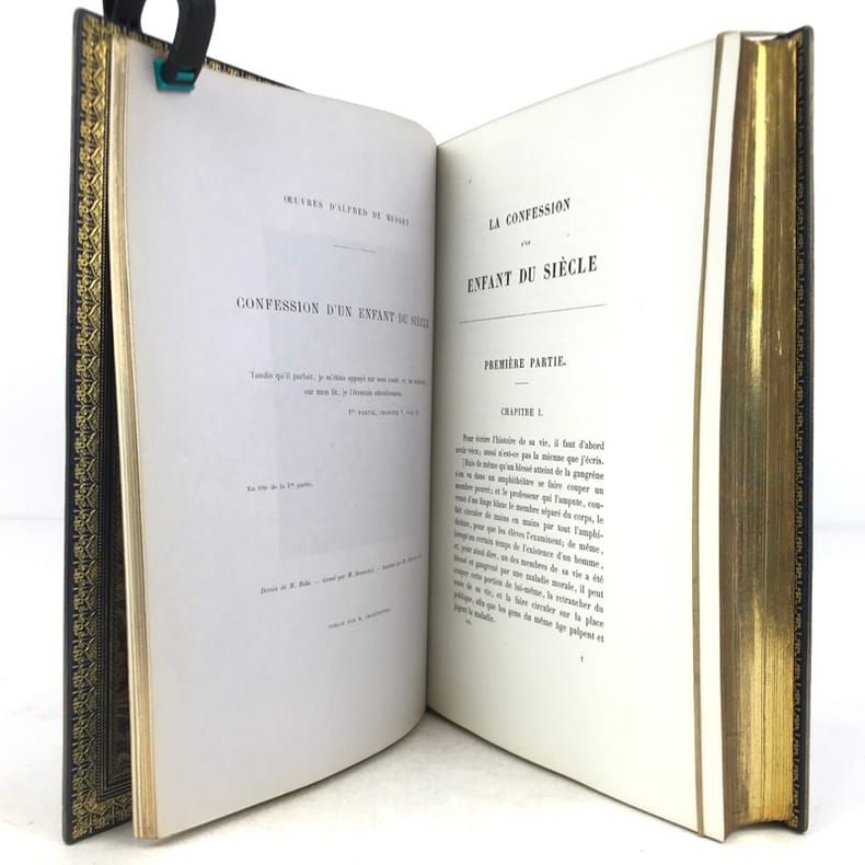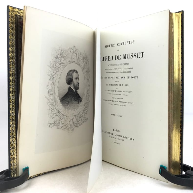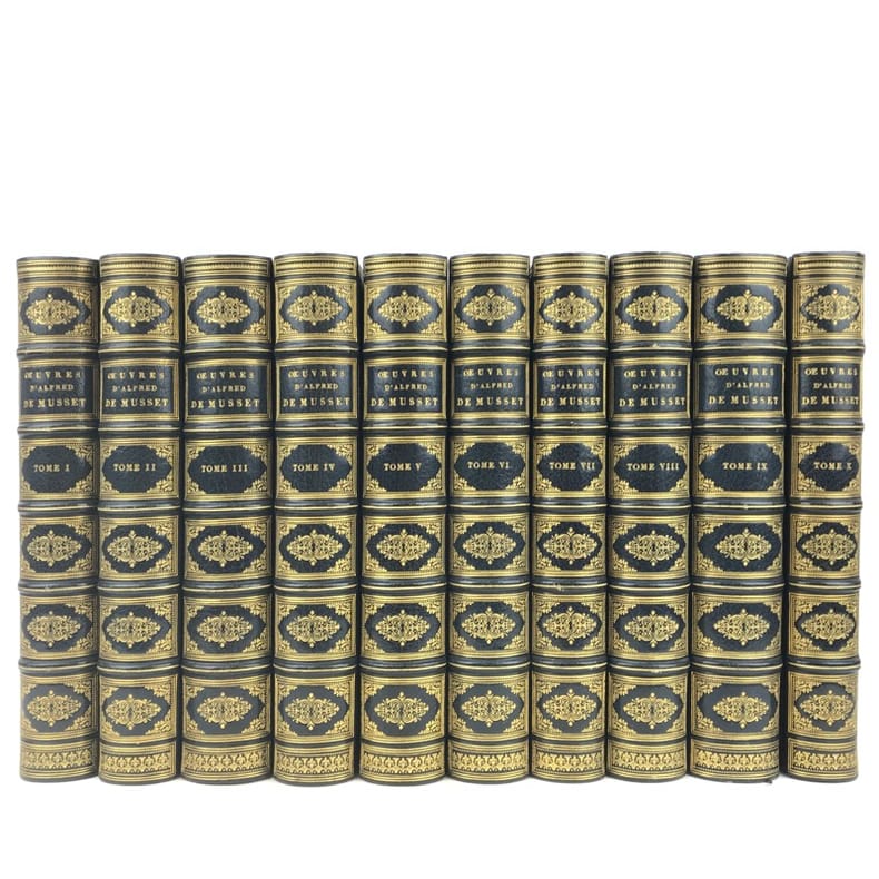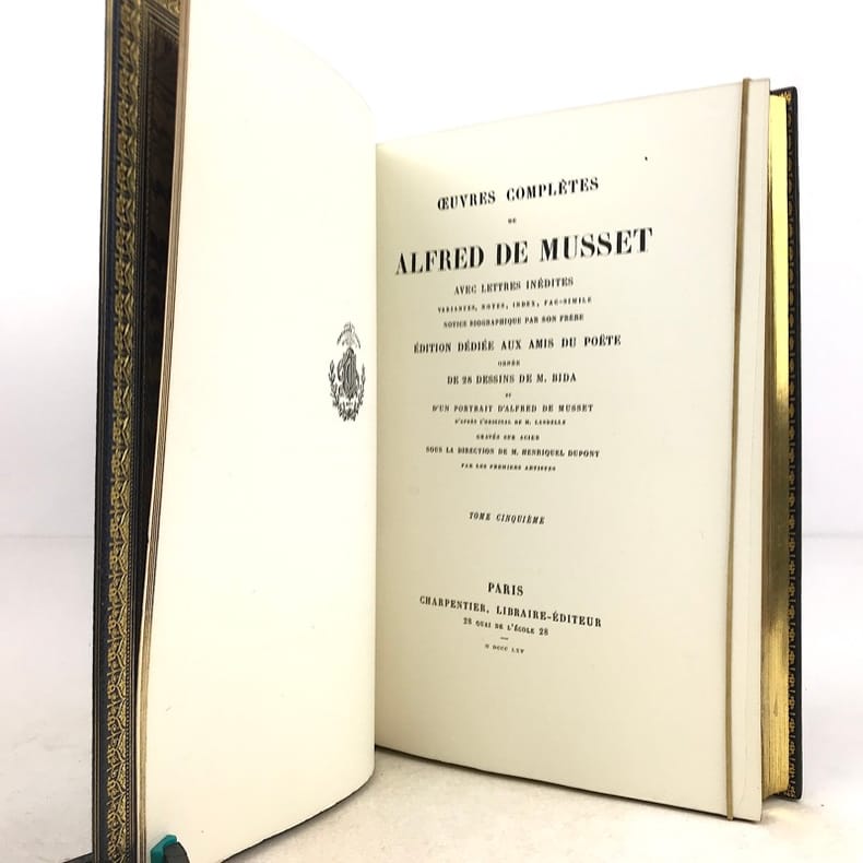 Paris Editions Charpentier 1865-1866 10 volumes in-8, bradel demi-maroquin turquoise à coins, plats de papier marbré, dos à cinq nerfs finement ornés de lyres dans un décor floral poussé or avec de petites mosaïques de maroquin rouge; doublures et gardes de papier marbré, non rognés, couvertures imprimées (V. Champs). Première édition collective, dite Edition dédiée aux amis du poète, comportant la correspondance avec des lettres inédites, et illustrée dun portrait-frontispice de lauteur gravé d'après Landelle et de 28 gravures sur acier hors-texte. Louvrage réunit les textes suivants : Tomes 1 et 2 : Poésies - Tome 3 : Comédies et proverbes : La Nuit vénitienne; André del Sarto; Les caprices de Marianne; Fantasio; On ne badine pas avec l'amour; Barberine - Tome 4 : Comédies et proverbes : Lorenzaccio; Le Chandelier; Il ne faut jurer de rien - Tome 5 : Comédies et proverbes : Un caprice; Il faut qu'une porte soit ouverte ou fermée; Louison; On ne saurait penser à tout; Bettine; Carmosine - Tome 6 : Nouvelles et contes: Emmeline; Les Deux Maîtresses; Frédéric et Bernerette; Le Fils du Titien; Margot - Tome 7 : Nouvelles et contes : Croisilles; Histoire d'un merle blanc; Pierre et Camille; Le Secret de Javotte; Mimi Pinson; La Mouche - Tome 8 : La Confession d'un enfant du siècle - Tome 9 : Mélanges de littérature et de critique - Tome 10: Œuvres posthumes de Alfred de Musset avec lettres inédites. L'ensemble est complété par une notice sur Alfred de Musset, établie par son frère Paul. Tirage unique numéroté sur papier vergé de Hollande (nombre d'exemplaires non précisé), avec les gravures tirées sur papier de Chine contrecollé et accompagnées de serpentes couleur lilas portant une légende de l'illustration et d'autres indications. Exemplaire nominatif réservé à Ernest Chaze, un des souscripteurs à cette édition. Des bibliothèques M. L. (ex-libris représentant un ours coiffé d'un bonnet de juriste, lisant au-dessus de cette amusante devise : Dans mon coin) et Georges Vandaele (ex-libris). Bel exemplaire malgré les dos légèrement passés.