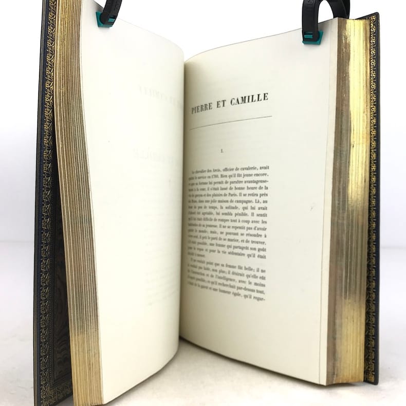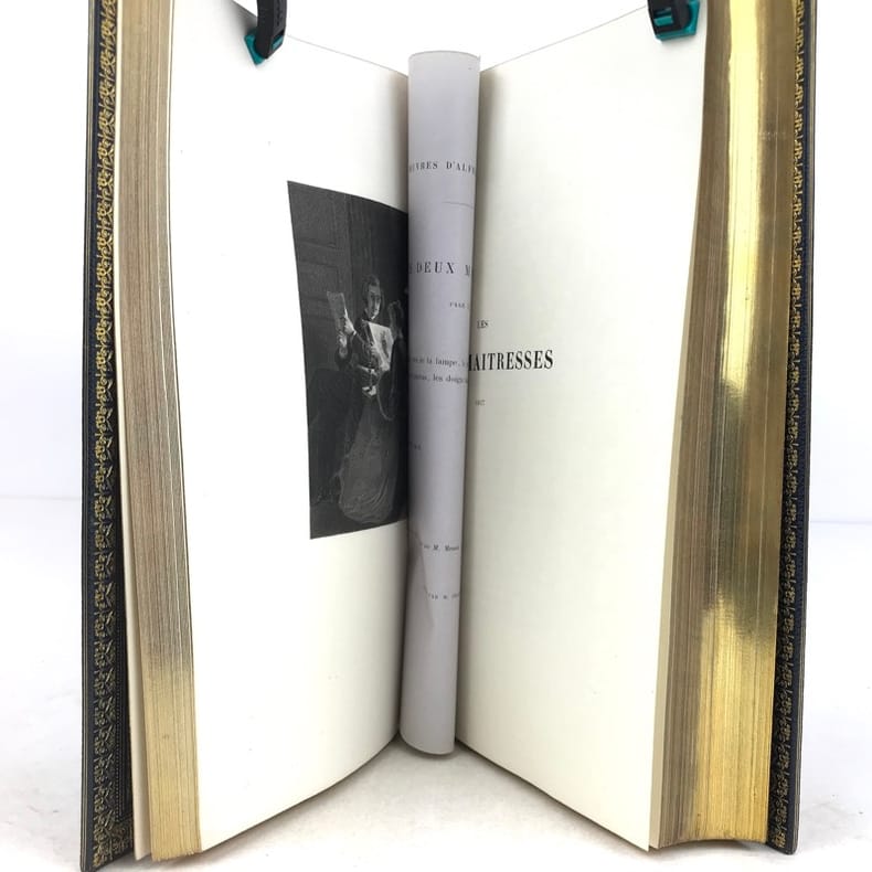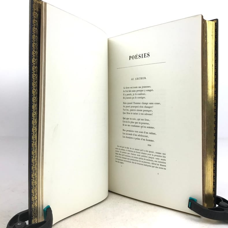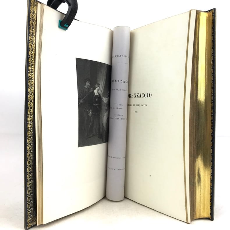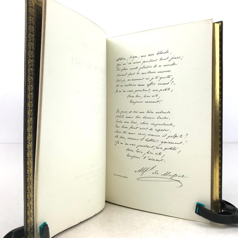 Paris Editions Charpentier 1865-1866 10 volumes in-8, bradel demi-maroquin turquoise à coins, plats de papier marbré, dos à cinq nerfs finement ornés de lyres dans un décor floral poussé or avec de petites mosaïques de maroquin rouge; doublures et gardes de papier marbré, non rognés, couvertures imprimées (V. Champs). Première édition collective, dite Edition dédiée aux amis du poète, comportant la correspondance avec des lettres inédites, et illustrée dun portrait-frontispice de lauteur gravé d'après Landelle et de 28 gravures sur acier hors-texte. Louvrage réunit les textes suivants : Tomes 1 et 2 : Poésies - Tome 3 : Comédies et proverbes : La Nuit vénitienne; André del Sarto; Les caprices de Marianne; Fantasio; On ne badine pas avec l'amour; Barberine - Tome 4 : Comédies et proverbes : Lorenzaccio; Le Chandelier; Il ne faut jurer de rien - Tome 5 : Comédies et proverbes : Un caprice; Il faut qu'une porte soit ouverte ou fermée; Louison; On ne saurait penser à tout; Bettine; Carmosine - Tome 6 : Nouvelles et contes: Emmeline; Les Deux Maîtresses; Frédéric et Bernerette; Le Fils du Titien; Margot - Tome 7 : Nouvelles et contes : Croisilles; Histoire d'un merle blanc; Pierre et Camille; Le Secret de Javotte; Mimi Pinson; La Mouche - Tome 8 : La Confession d'un enfant du siècle - Tome 9 : Mélanges de littérature et de critique - Tome 10: Œuvres posthumes de Alfred de Musset avec lettres inédites. L'ensemble est complété par une notice sur Alfred de Musset, établie par son frère Paul. Tirage unique numéroté sur papier vergé de Hollande (nombre d'exemplaires non précisé), avec les gravures tirées sur papier de Chine contrecollé et accompagnées de serpentes couleur lilas portant une légende de l'illustration et d'autres indications. Exemplaire nominatif réservé à Ernest Chaze, un des souscripteurs à cette édition. Des bibliothèques M. L. (ex-libris représentant un ours coiffé d'un bonnet de juriste, lisant au-dessus de cette amusante devise : Dans mon coin) et Georges Vandaele (ex-libris). Bel exemplaire malgré les dos légèrement passés.