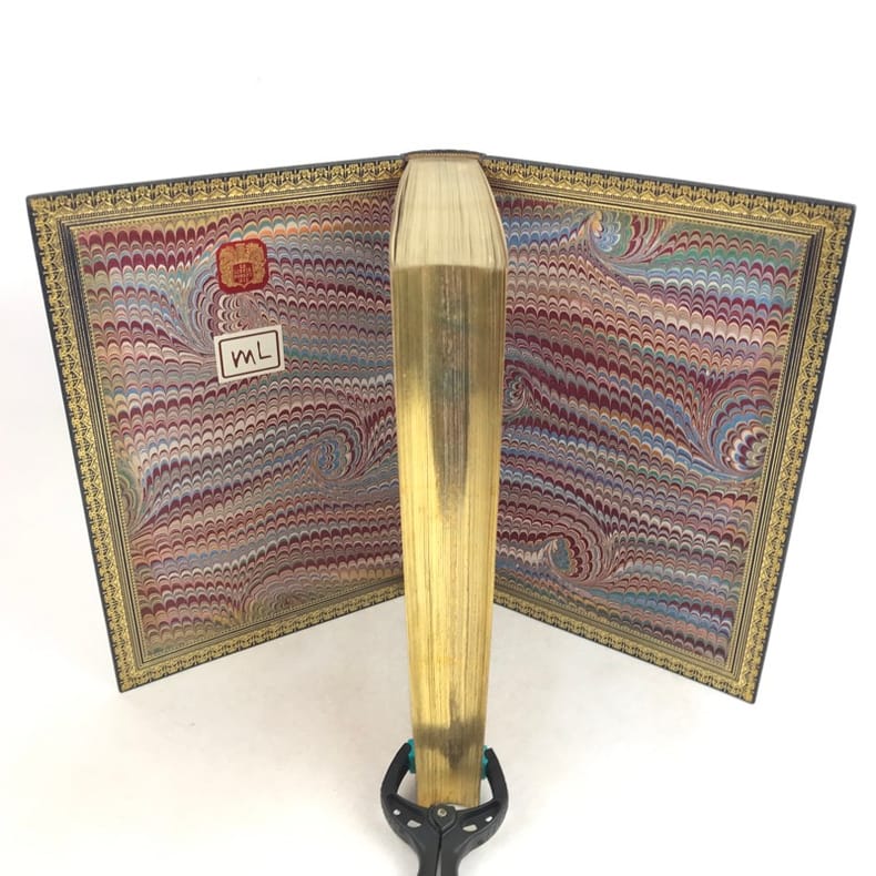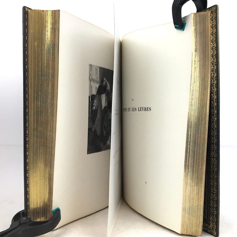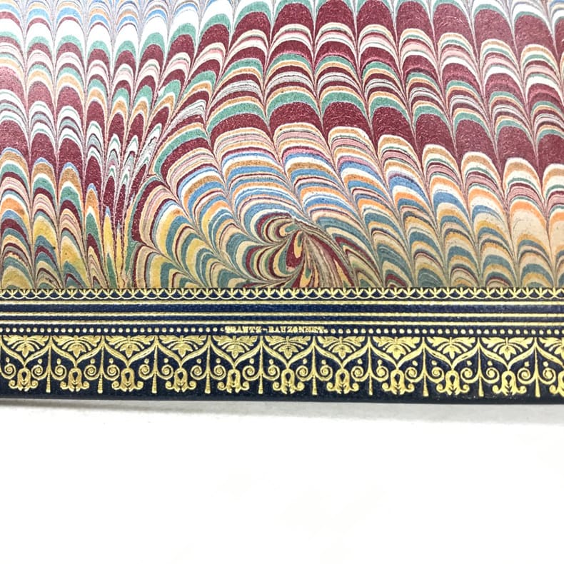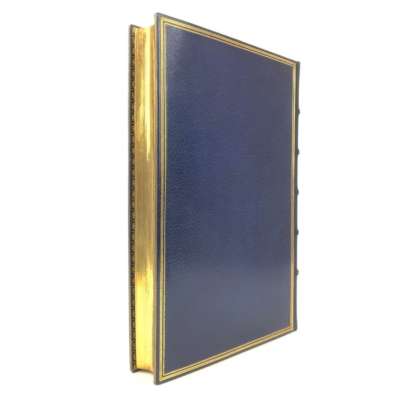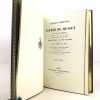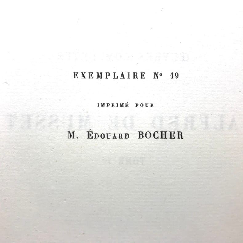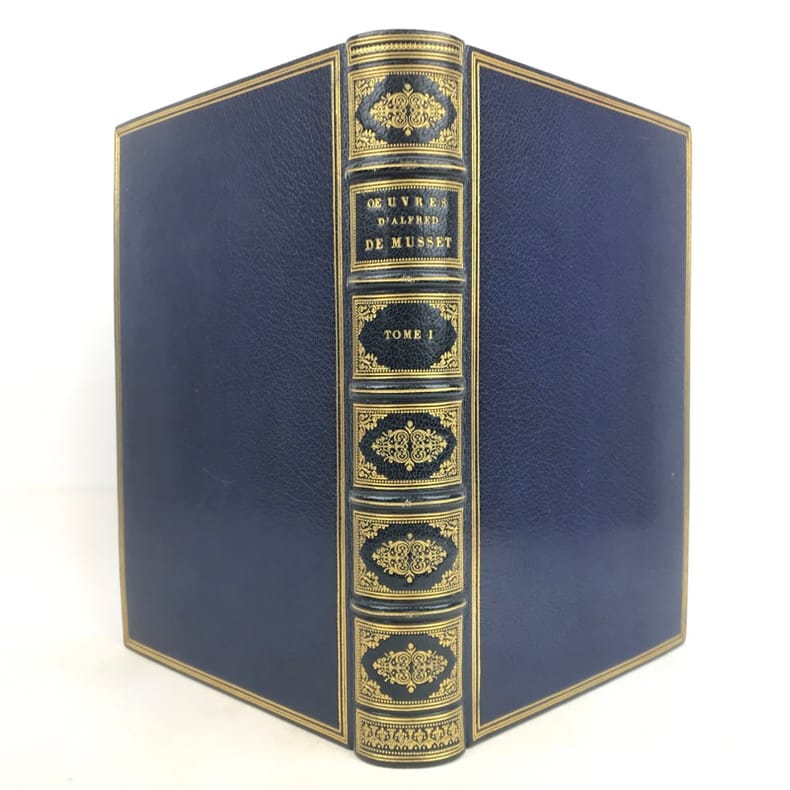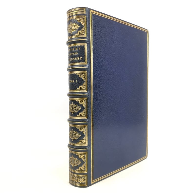 10 volumes grand in-8 (26,7 x 17,6 cm), maroquin bleu (reliure de l’époque, signée Trautz-Bauzonnet), dos à nerfs joliment ornés aux petits fers, triple filet doré en encadrement sur les plats, double filet doré sur les coupes, dentelle dorée intérieure, tranches dorées sur marbrure, ex-libris contrecollés sur le contreplat, [10]-338-3 pl. ; [6]-342-6 pl. ; [6]-403-[3]-4 pl. ; [6]-363-[3]-3 pl. ; [6]-364-[2]-3 pl. ; [6]-340-[2]-3 pl. ; [6]-307-[3]-3 pl. ; [6]-341-[1]-2 pl. ; [6]-422-1 pl. ; [6]-309-[1] pages (complet). Très bon état. PREMIÈRE ÉDITION COLLECTIVE, dite des “Amis du poëte”; elle comprend aussi un certain nombre de lettres familières inédites ; illustrée d'un portrait-frontispice de Musset gravé sur acier par Flameng d'après Landelle et de 28 planches hors texte de Bida gravées sur acier par Desvachez, Nargeot, Levasseur, Balin, etc., toutes les gravures sont avant la lettre et sont tirées sur Chine monté, protégées par des serpentes, légendées, couleurs lilas. Exemplaire sur Rives, celui-ci nominatif, imprimé pour M. Édouard Bocher, (n°19). Des bibliothèques de Robert Hoe (1839-1909), industriel new-yorkais, fabricant de presses typographiques et plus grand bibliophile américain du XIXe siècle. Sa collection de 14000 volumes, particulièrement riche en éditions françaises et en belles reliures, a été dispersée en une série de vente à New-York de 1911 à 1919; avec son ex-libris. ; et un autre ex-libris aux initiales M.L., non identifié. Très bel exemplaire dans une reliure de l’époque en maroquin par Trautz-Bauzonnet.