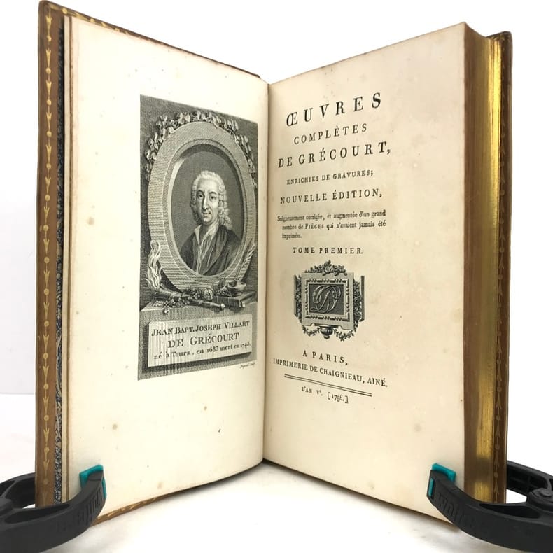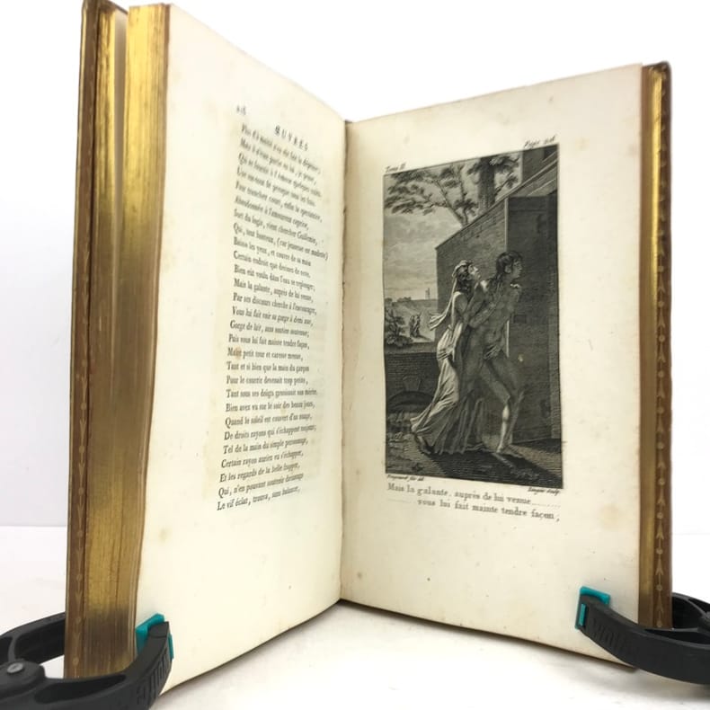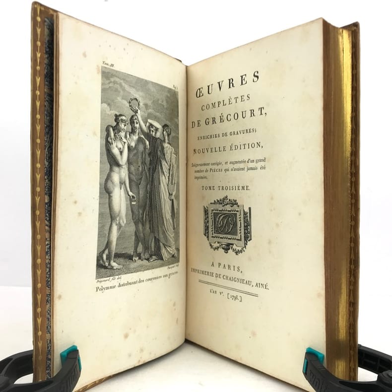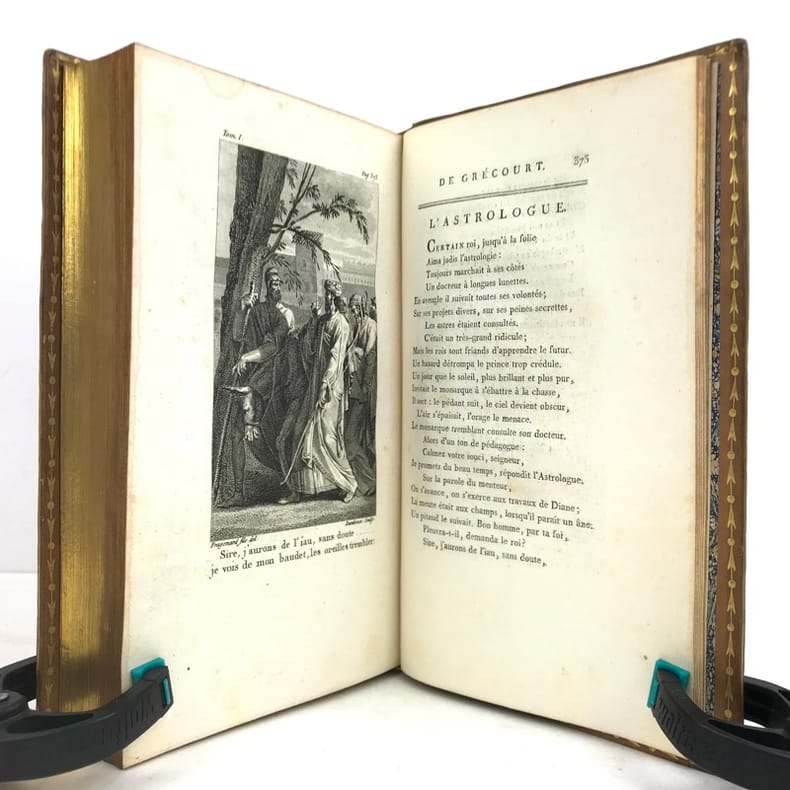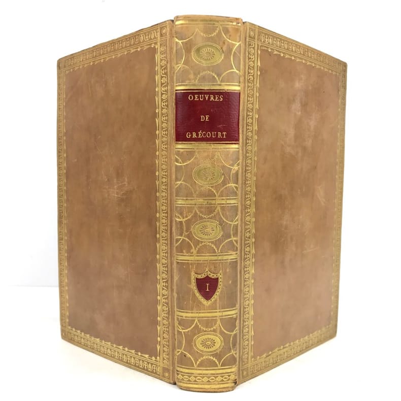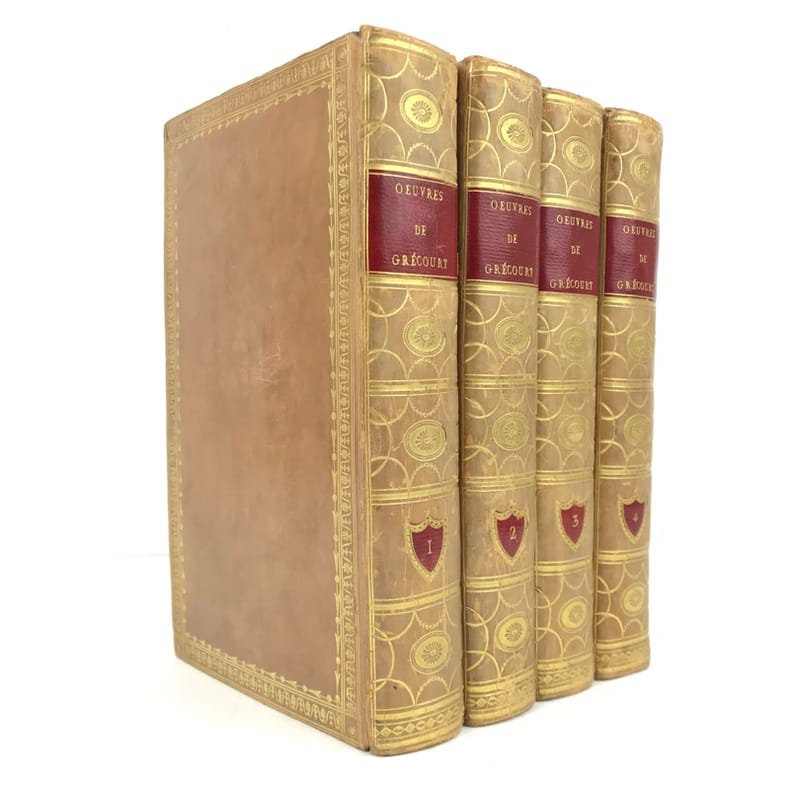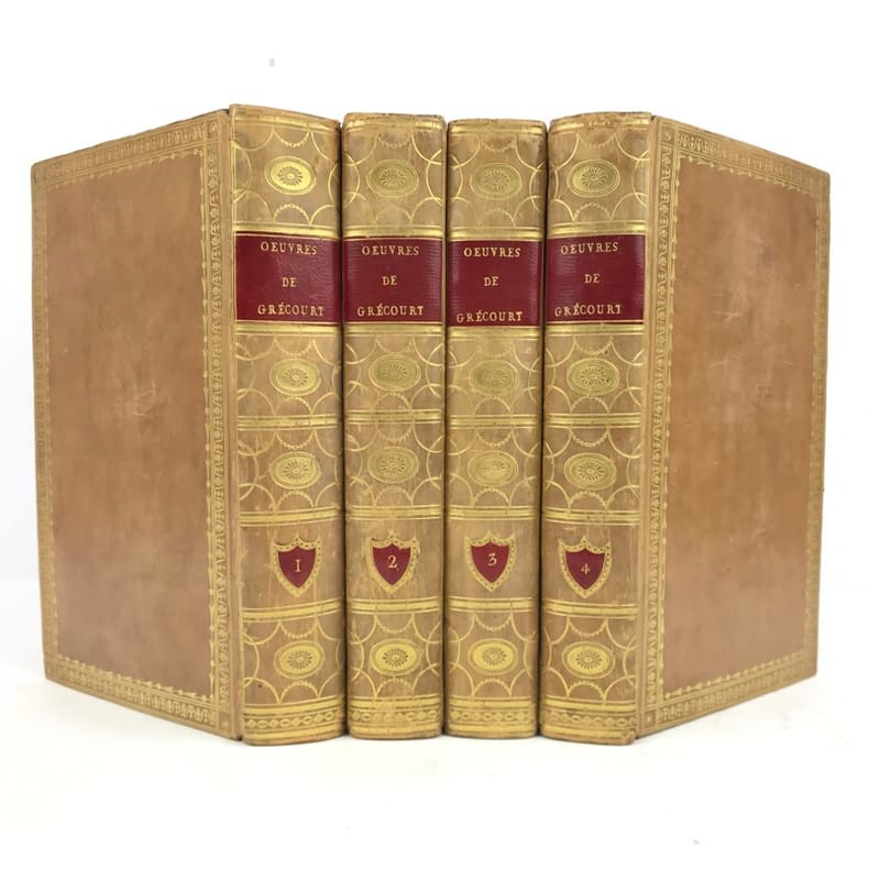 4 volumes in-8 (20 x 12 cm), veau blond glacé (reliure de l’époque), dos lisse orné, pièces de titre et de tomaison en maroquin rouge, roulette dorée encadrant les plats et sur les chasses, filet doré sur les coupes, tranches dorées, étiquette de “Delaunay, Libraire au Palais-Royal”, [4]-383-[1] ; [4]-363-[1] ; [4]-351-[1] ; [4]-347-[1] pages (complet). Quelques rousseurs. Bon état.Nouvelle édition, illustrée d’un portrait en frontispice du tome I, et de huit gravures hors-texte (dont trois en frontispice). Jean-Baptiste-Joseph Willart de Grécourt (1684-1743) est un ecclésiastique et poète français. Il rédige principalement des épîtres, des recueils de poèmes, ou encore des contes. Bel exemplaire.