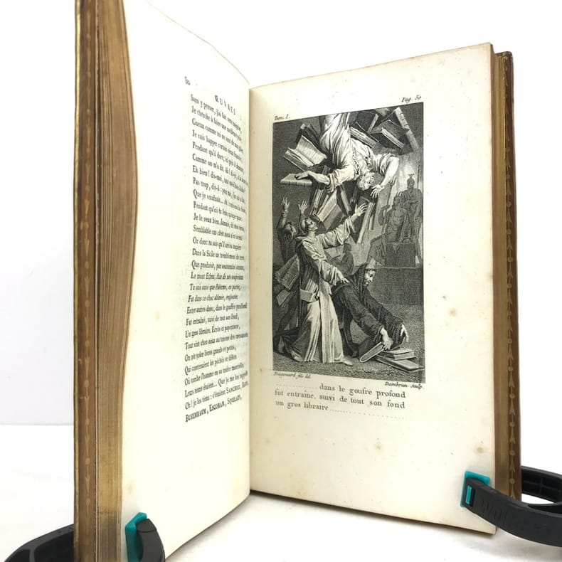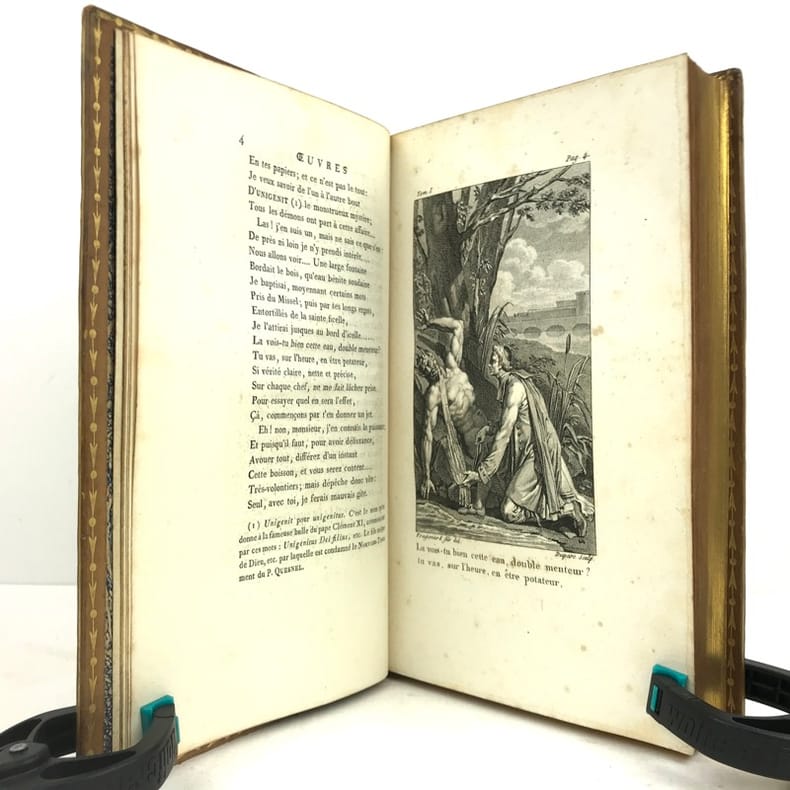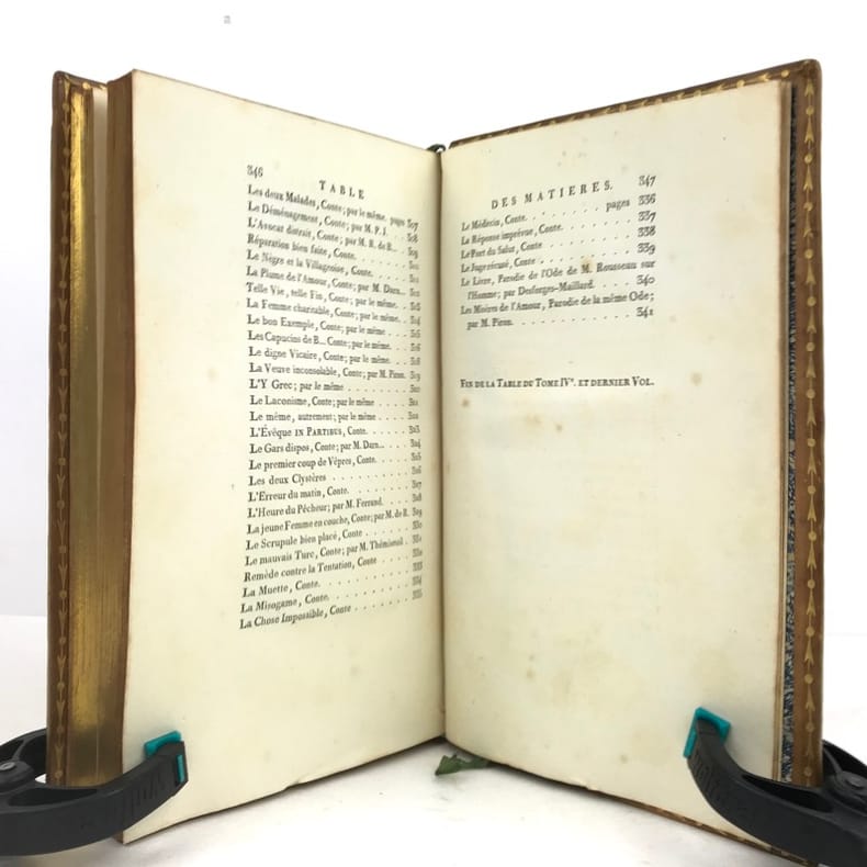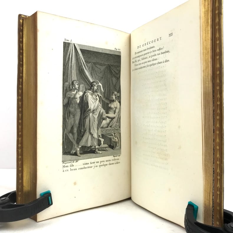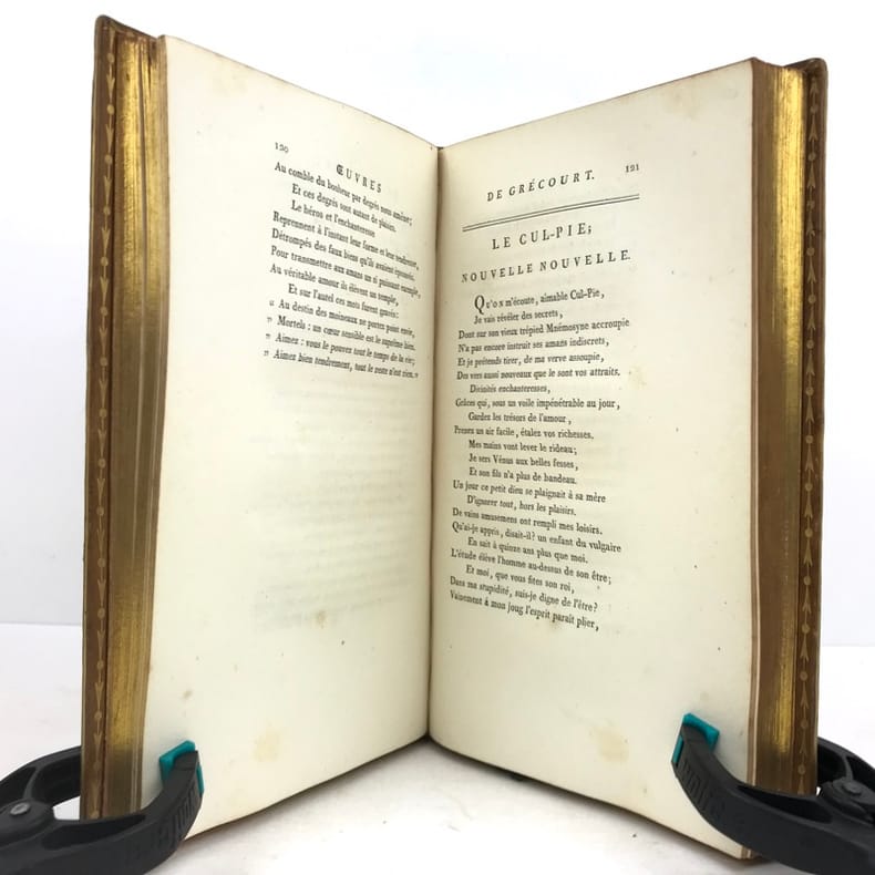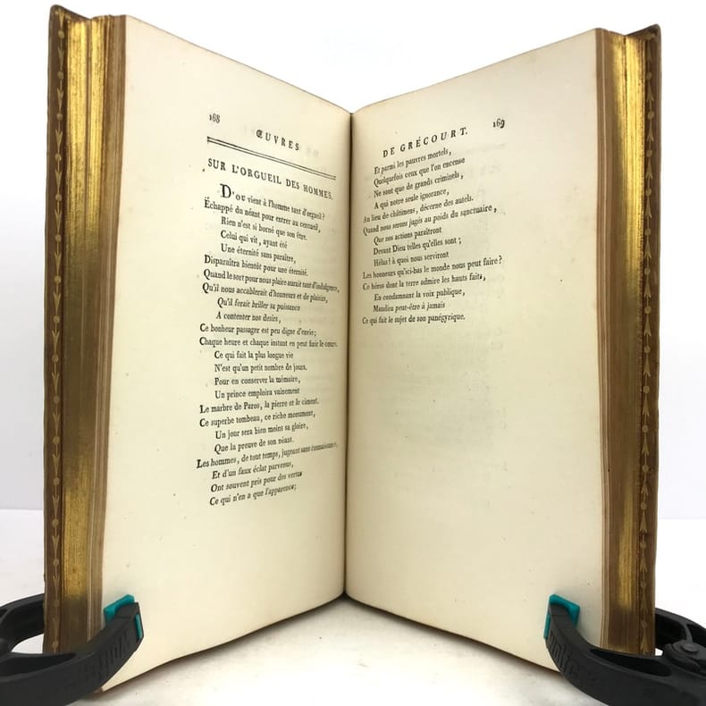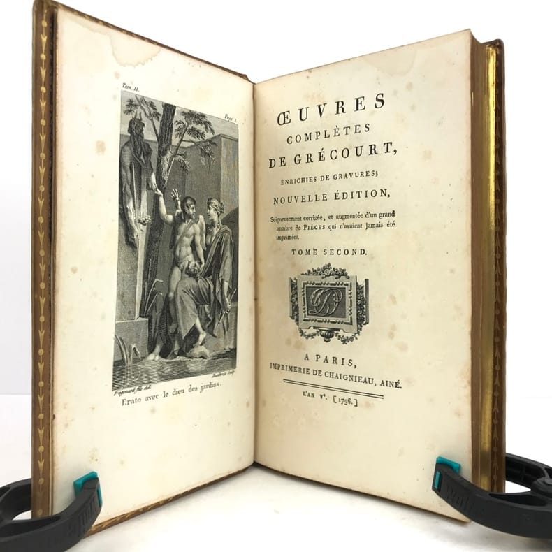 4 volumes in-8 (20 x 12 cm), veau blond glacé (reliure de l’époque), dos lisse orné, pièces de titre et de tomaison en maroquin rouge, roulette dorée encadrant les plats et sur les chasses, filet doré sur les coupes, tranches dorées, étiquette de “Delaunay, Libraire au Palais-Royal”, [4]-383-[1] ; [4]-363-[1] ; [4]-351-[1] ; [4]-347-[1] pages (complet). Quelques rousseurs. Bon état.Nouvelle édition, illustrée d’un portrait en frontispice du tome I, et de huit gravures hors-texte (dont trois en frontispice). Jean-Baptiste-Joseph Willart de Grécourt (1684-1743) est un ecclésiastique et poète français. Il rédige principalement des épîtres, des recueils de poèmes, ou encore des contes. Bel exemplaire.