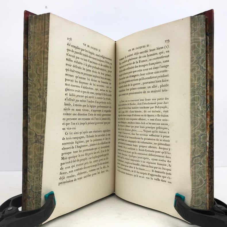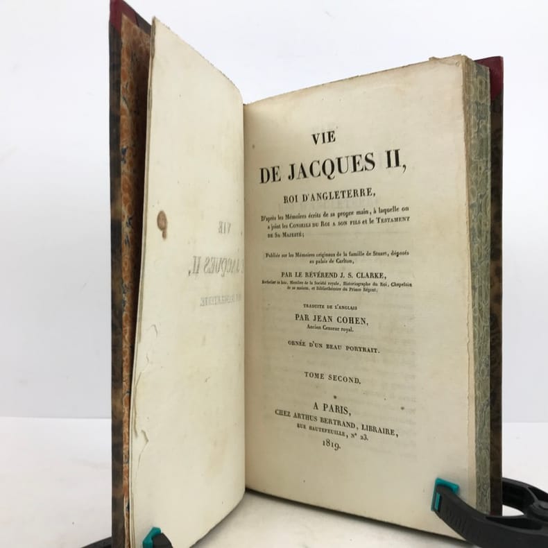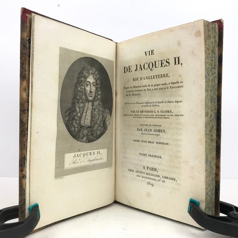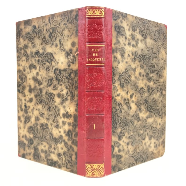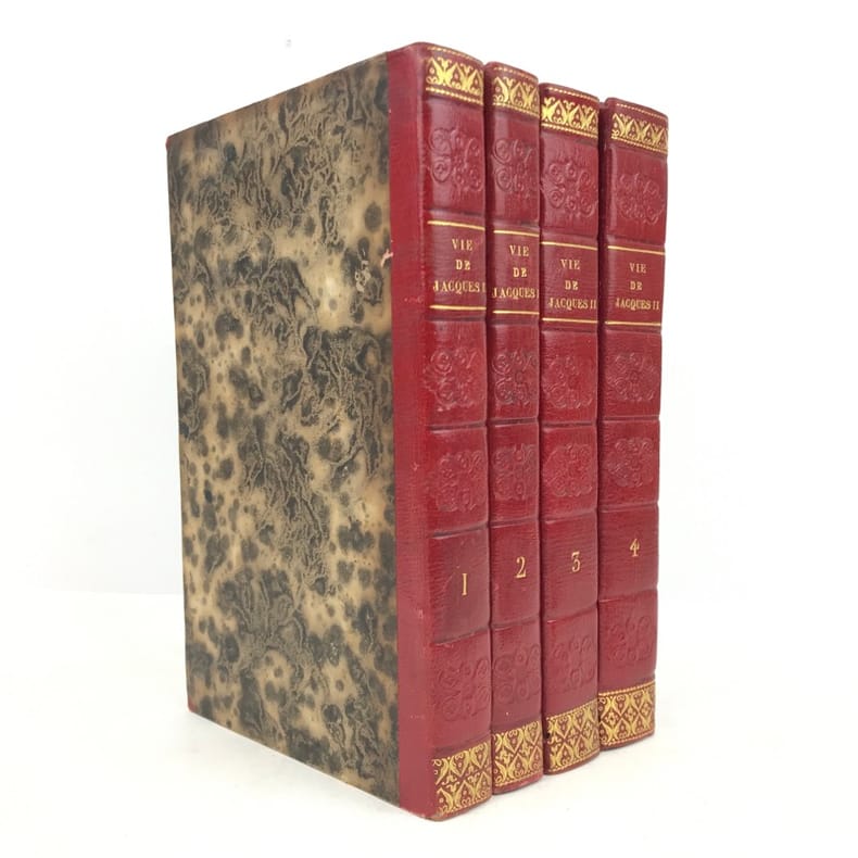 4 volumes in-8 (20,5 x 13 cm), demi-maroquin rouge à coins (reliure de l’époque), dos lisse orné et estampé à froid, tranches marbrées, [4]-lxxix-309 ; [4]-346 ; [4]-432 ; [4]-517-[1] pages (complet). Infimes frottements aux coins, quelques feuillets finement déchirés en bordure sans manque, rousseurs. État très correct tout de même. Nouvelle édition française, illustrée d’un portrait du roi en frontispice. James Stanier Clarke (1766–1834) est un ecclésiastique, auteur spécialisé dans la Marine et un homme de lettres anglais. Il devient bibliothécaire en 1799 auprès de George, prince de Galles, futur prince régent, puis George IV). Il rédige cette biographie de Jacques II (1633-1701), roi d’Angleterre et d’Irlande, grâce aux propres mémoires de ce dernier. Roi très impopulaire, notamment à cause de son catholicisme, il est chassé d’Angleterre par sa fille Marie et son époux, le roi protestant Guillaume III d’Orange. Jacques II est alors contraint de se réfugier à la cour de son cousin, le roi de France Louis XIV. Provenance de la bibliothèque du château de Fontmagne (tampon), à Castries, dans l’Hérault. Agréable exemplaire.