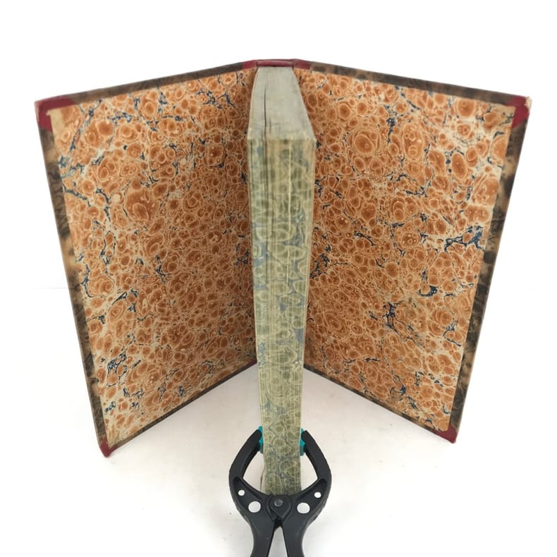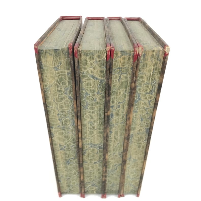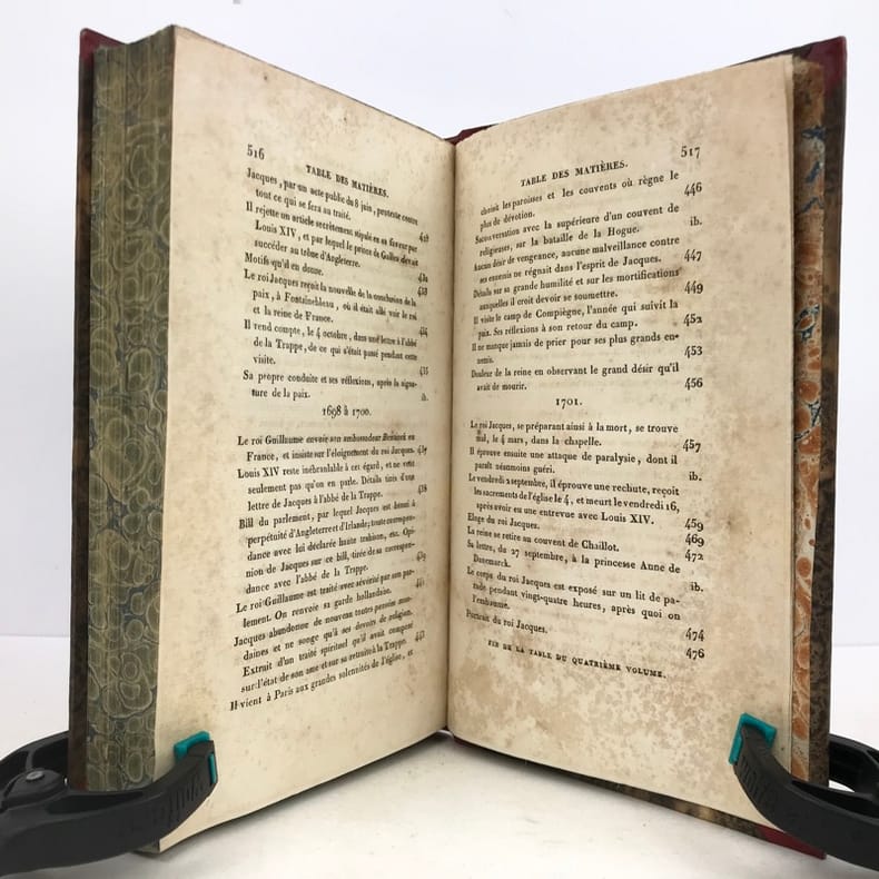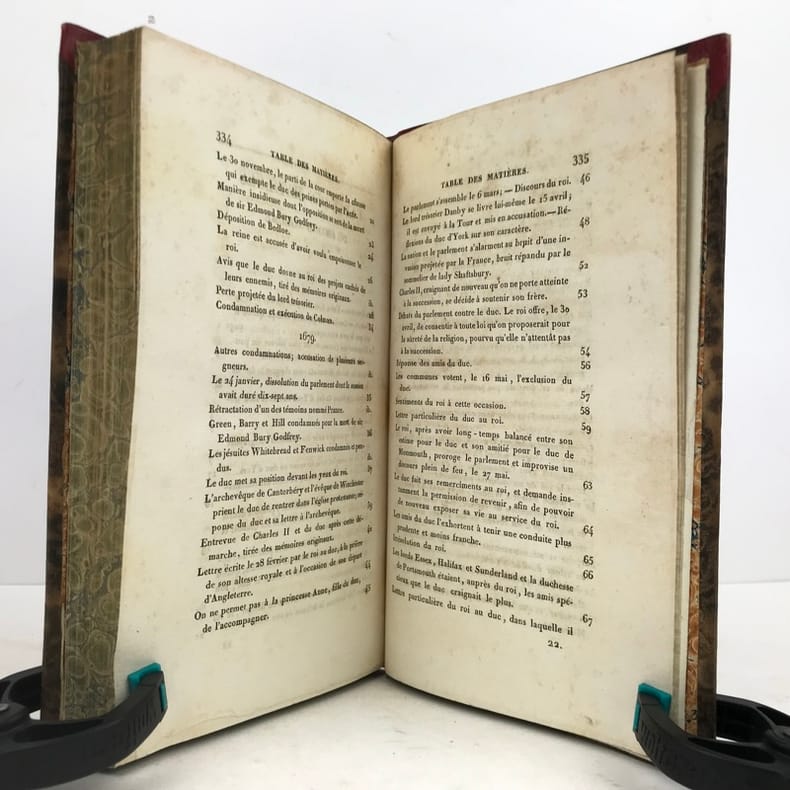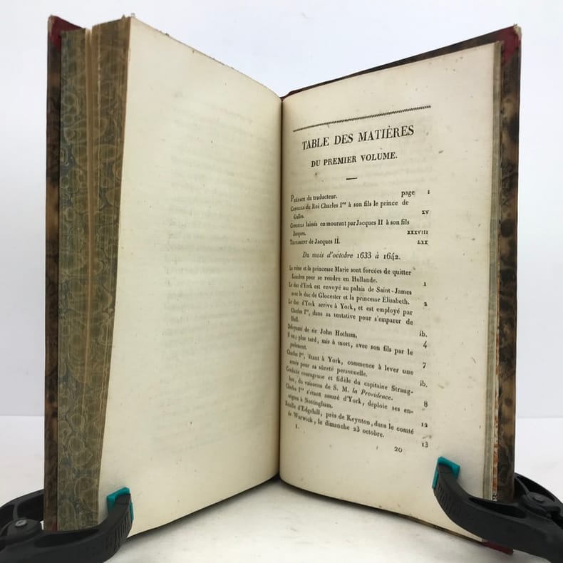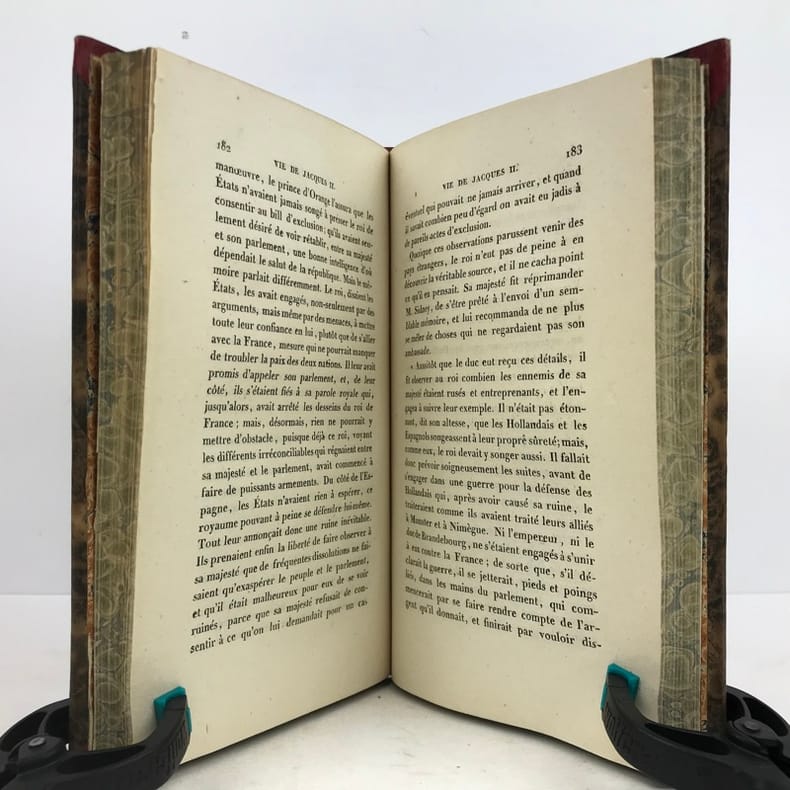 4 volumes in-8 (20,5 x 13 cm), demi-maroquin rouge à coins (reliure de l’époque), dos lisse orné et estampé à froid, tranches marbrées, [4]-lxxix-309 ; [4]-346 ; [4]-432 ; [4]-517-[1] pages (complet). Infimes frottements aux coins, quelques feuillets finement déchirés en bordure sans manque, rousseurs. État très correct tout de même. Nouvelle édition française, illustrée d’un portrait du roi en frontispice. James Stanier Clarke (1766–1834) est un ecclésiastique, auteur spécialisé dans la Marine et un homme de lettres anglais. Il devient bibliothécaire en 1799 auprès de George, prince de Galles, futur prince régent, puis George IV). Il rédige cette biographie de Jacques II (1633-1701), roi d’Angleterre et d’Irlande, grâce aux propres mémoires de ce dernier. Roi très impopulaire, notamment à cause de son catholicisme, il est chassé d’Angleterre par sa fille Marie et son époux, le roi protestant Guillaume III d’Orange. Jacques II est alors contraint de se réfugier à la cour de son cousin, le roi de France Louis XIV. Provenance de la bibliothèque du château de Fontmagne (tampon), à Castries, dans l’Hérault. Agréable exemplaire.