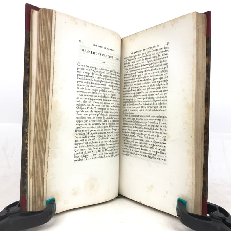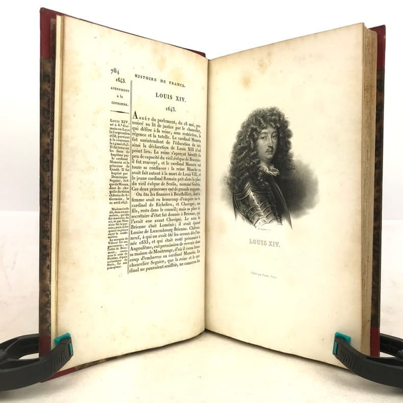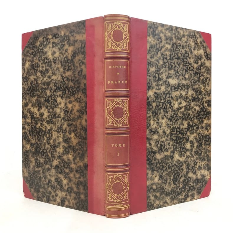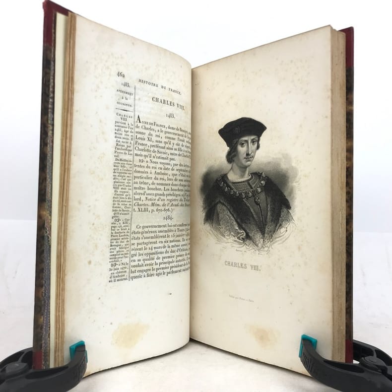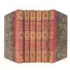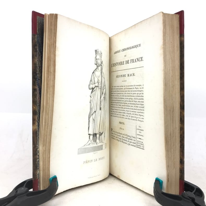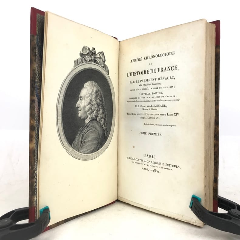 6 volumes in-8 (21,5 cm x 13 cm), demi-maroquin à coins rouge (reliure d’époque), dos à nerfs orné de motifs dorés. xx-438 ; [4]-439 à 782 ; [4]-783 à 1176-[2] ; [4]-ix-[1]-519-[1] ; [4]-424 ; [4]-439-[1] pages. Légers frottements à la reliure, rousseurs éparses. État très correct. Nouvelle édition, corrigée d’après le manuscrit de l’auteur, augmentée par C.-A. Walckenaer, illustrée d’un portrait en frontispice ainsi que de 18 portraits hors-texte. Édition peu commune. Charles-Jean-François Hénault d'Armorezan, dit le « président Hénault », (1685-1770), est un écrivain et historien français. L’ouvrage qui établit sa réputation, l’Abrégé chronologique de l’histoire de France jusqu’à la mort de Louis XIV, inlassablement réédité de son temps et jusqu’à la fin du xviiie siècle, est ingénieux. Il s'agit en réalité de notes des leçons d’histoire reçues par l’auteur au collège Louis-le-Grand, dont le fond provient de Mézeray et du père Daniel, mises bout à bout en forme de questions-réponses, et complétées à partir de Dubos et de Boulainvilliers avec l’aide de l’abbé Boudot. Hénault les enrichit de résumés alertes et clairs et de réflexions morales ou critiques, toujours brèves et bienvenues, accompagnées de tableaux chronologiques très clairs. Agréable exemplaire.