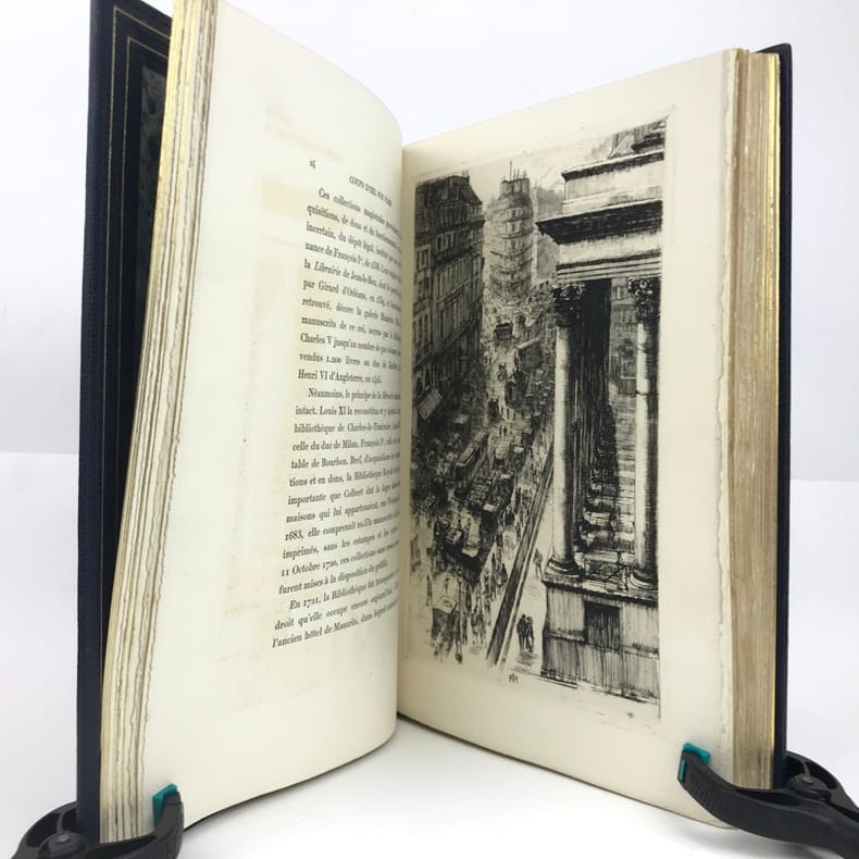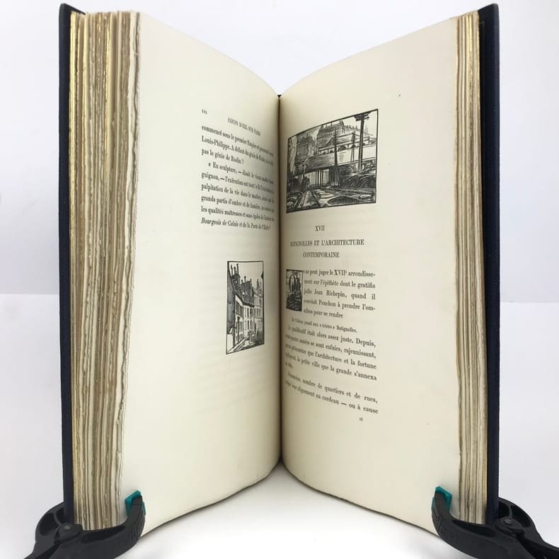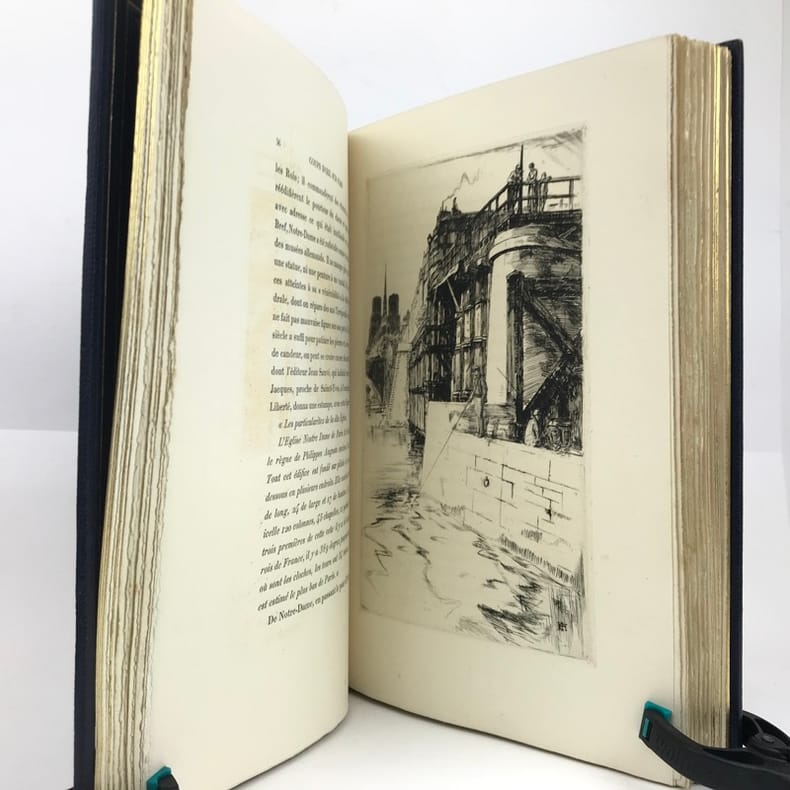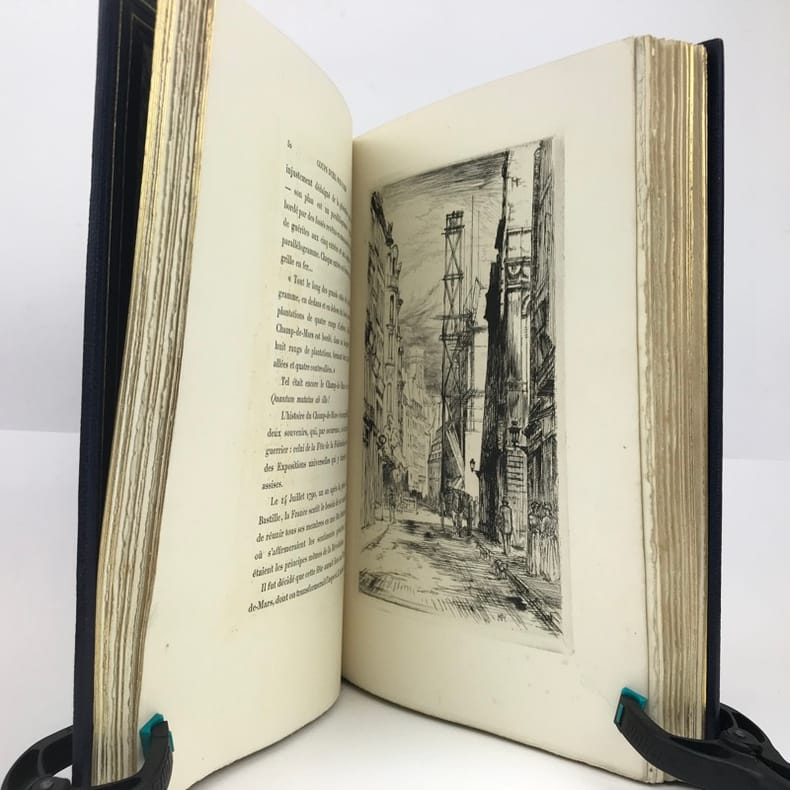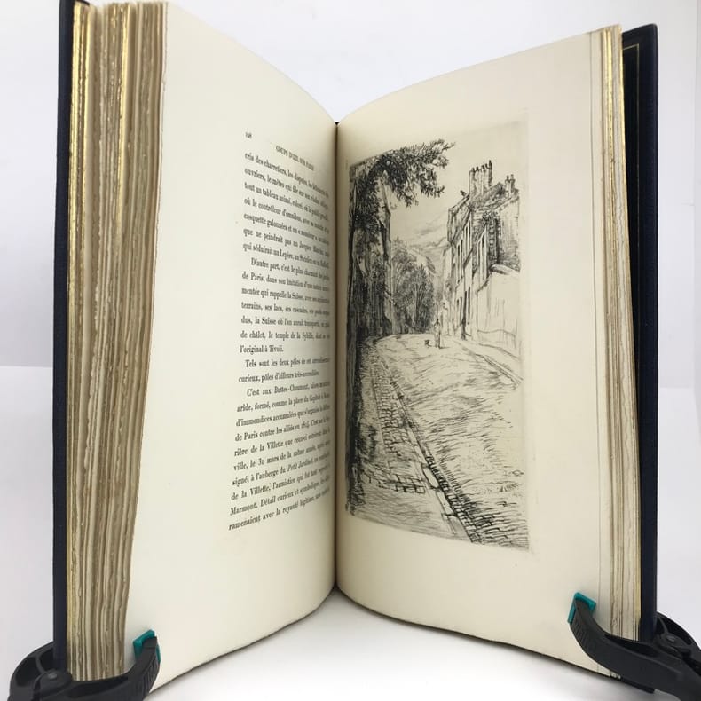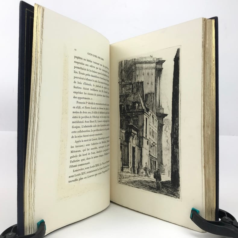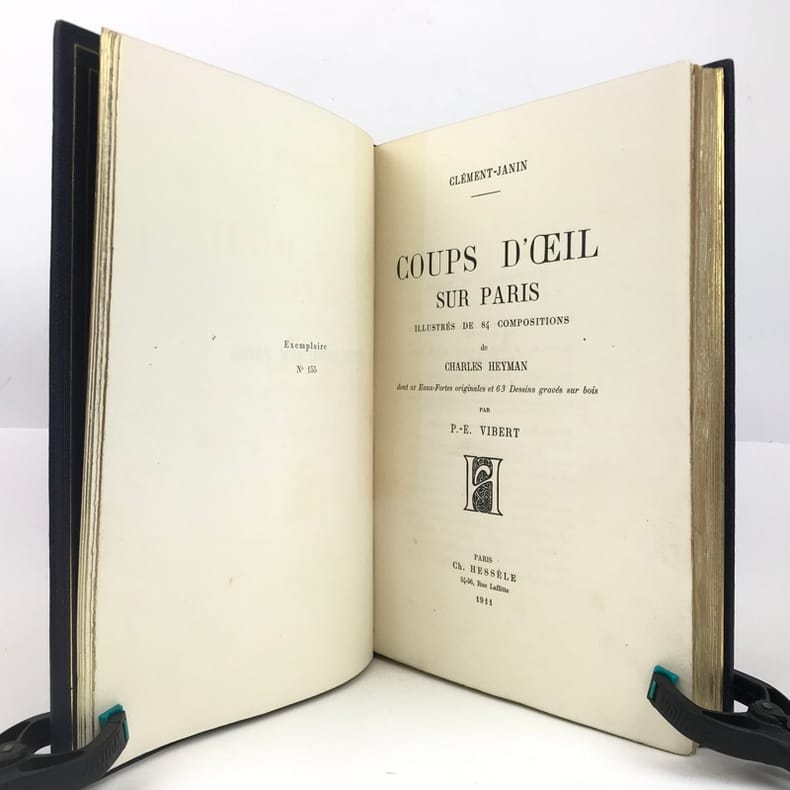 Ce très bel ouvrage sur Paris est illustré par Charles HEYMAN de 84 compositions dont 21 eaux-fortes originales et 63 dessins gravés sur bois par P.-E. Vibert. Tirage à 350 ex. num., celui-ci, (n°49), est l'un des 25 ex. num. sur Chine avec 2 états des planches. Cet exemplaire est accompagné d'une suite des bois sur Chine, ainsi que d'un DESSIN ORIGINAL de l'artiste. L'exemplaire contient est enrichie : d'un état supplémentaire de 2 eaux-fortes signées par l'artiste au crayon de papier, La rue Vandrezanne, et la rue des entrepreneurs, et d'un état supplémentaire d'une vue de la Bourse placé en frontispice. Le titre gravé est ici en 3 états dont 2 avant la lettre.