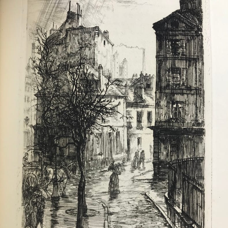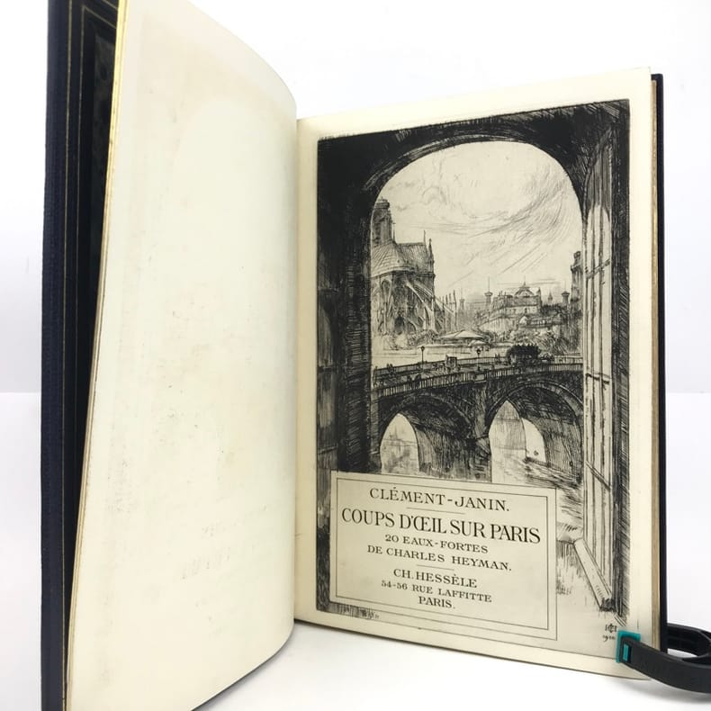 Paris Ch. Hessèle 1911 In-4, broché, couverture illustrée en noir.84 compositions de Charles Heyman, dont 21 eaux-fortes originales et 63 dessins gravés sur bois par P.-E. Vibert. Tirage limité à 325 exemplaires numérotés. Un des 250 exemplaires sur papier d'Arches. Charles Heyman (1881-1915), peintre-aquarelliste de paysages urbains, est surtout connu pour ses vues de Paris. Exemplaire enrichi du prospectus illustré de l'éditeur et portant au bas de la justification de tirage un amical envoi autographe signé de l'éditeur.