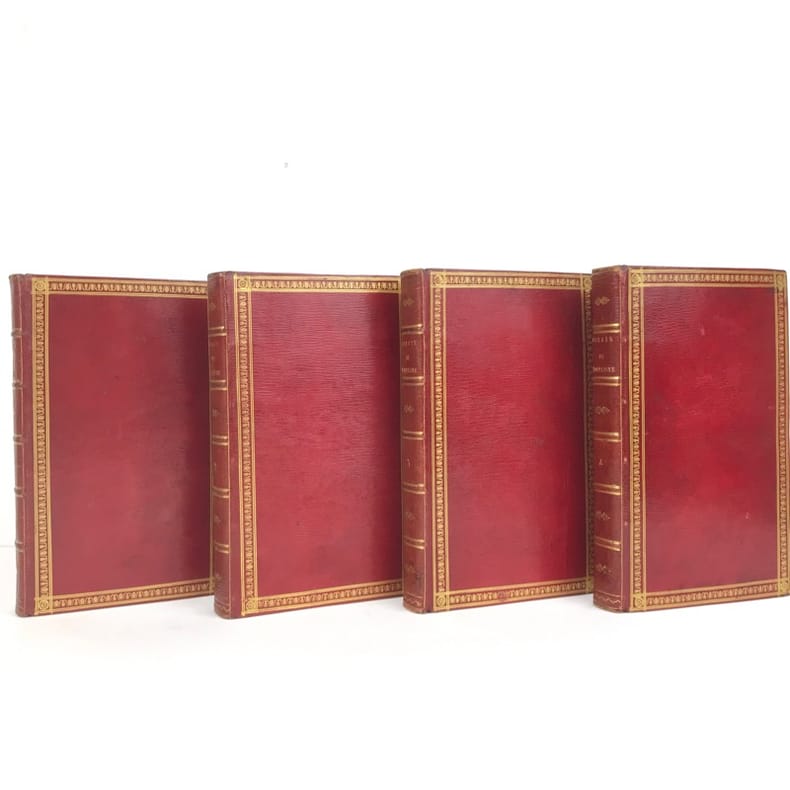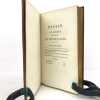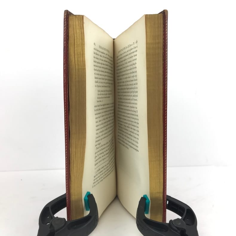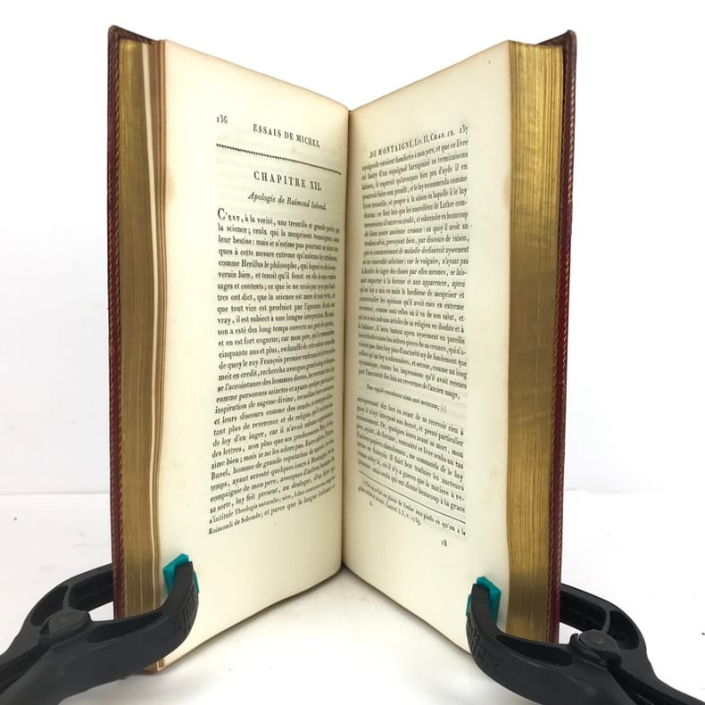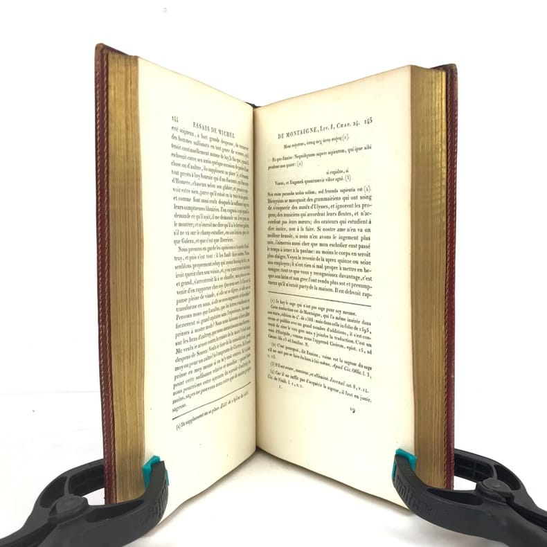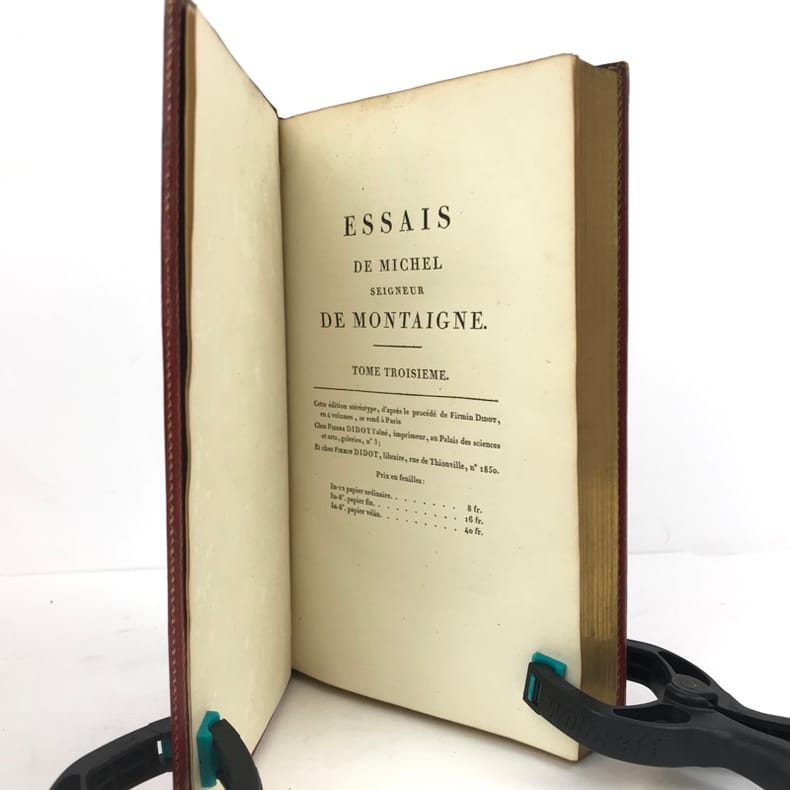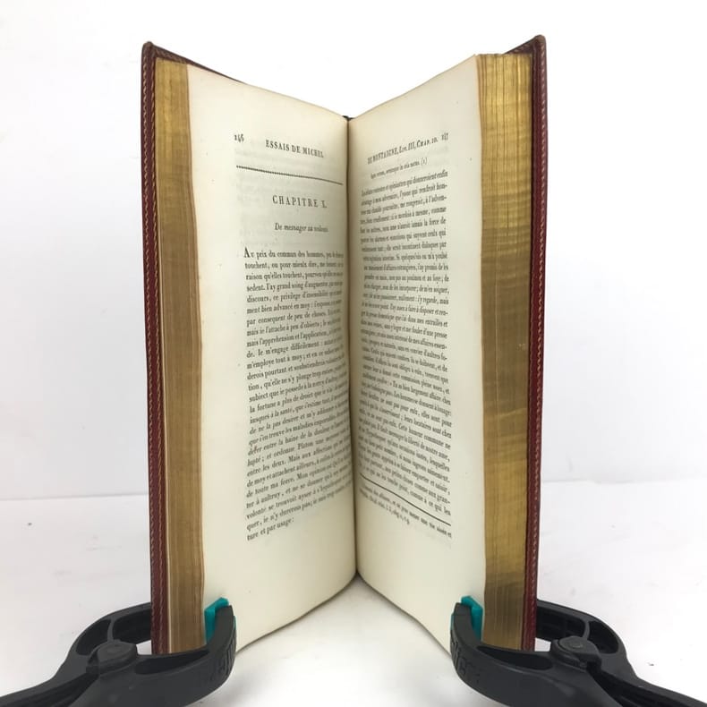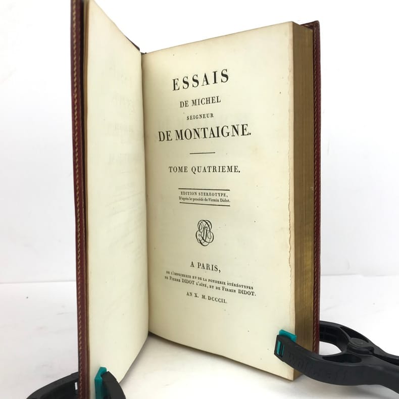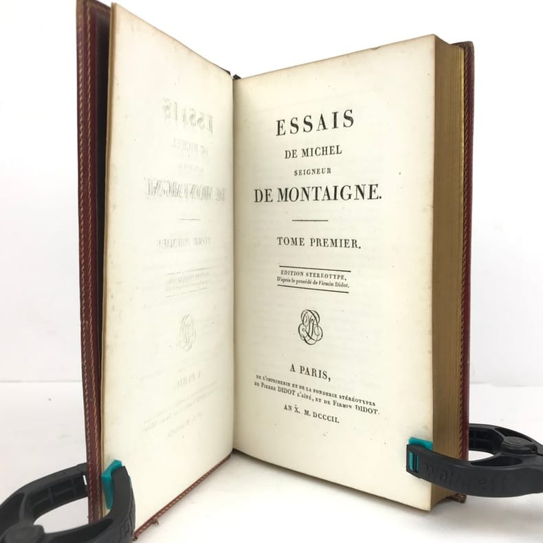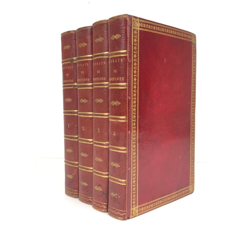 4 volumes in-8 (19,5 cm x 11,5 cm), maroquin rouge à longs grains (reliure de l’époque signée Bozerian), dos lisse à filets et fleurons dorés, roulette dorée encadrant les plats, tranches dorées, fine roulette dorée intérieure, xii-412 ; [4]-390-[1]-1 bl. ; [4]-390 ; [4]-387-[1] pages. Manque le portrait. Frottements et épidermures à la reliure. État très correct. Nouvelle édition stéréotype d’après le procédé de Firmin Didot. Michel Eyquem de Montaigne (1532-1592) commence à écrire ses Essais en 1572, après sa retraite dans son château du Périgord, où il a hérité des terres familiales. Forme nouvelle pour l’époque, l’essai littéraire développe une pensée originale et personnelle organisée autour de la question centrale : qu’est-ce que l’homme ? Le fait d’utiliser le français, et non le latin, pour un ouvrage philosophique, est aussi une innovation.Ses réflexions puisent dans son expérience du monde, dans sa riche bibliothèque et dans la philosophie humaniste. Il s’agit pour l’auteur de “parler indifféremment de tout ce qui se présente à sa fantaisie”. Il justifie ainsi la forme imparfaite ou fragmentaire des Essais en affirmant qu’elle est la preuve de sa bonne foi et de son honnêteté. Tous les sujets sont abordés : histoire, religion, éducation, justice… L’unité de l’œuvre est fournie par la personne même de l’auteur et l’affirmation, au fil des pages, d’une pensée originale.Montaigne ne cesse de reprendre et corriger ses Essais jusqu’à sa mort : quatre éditions paraissent de son vivant, avec à chaque fois de nouveaux ajouts et compléments.Bel exemplaire.