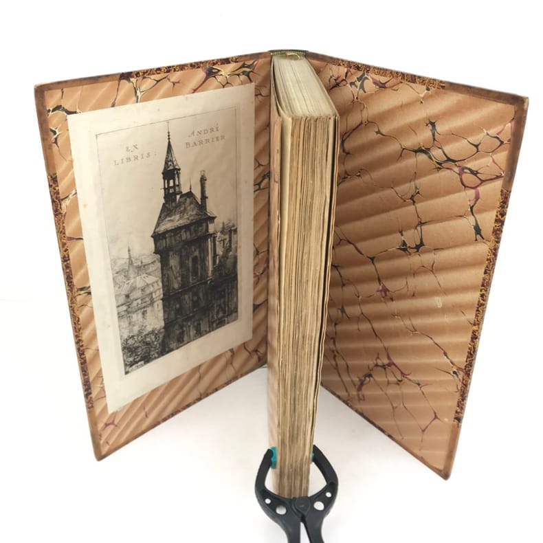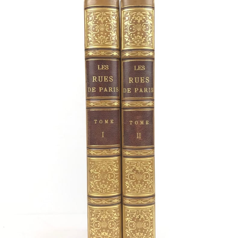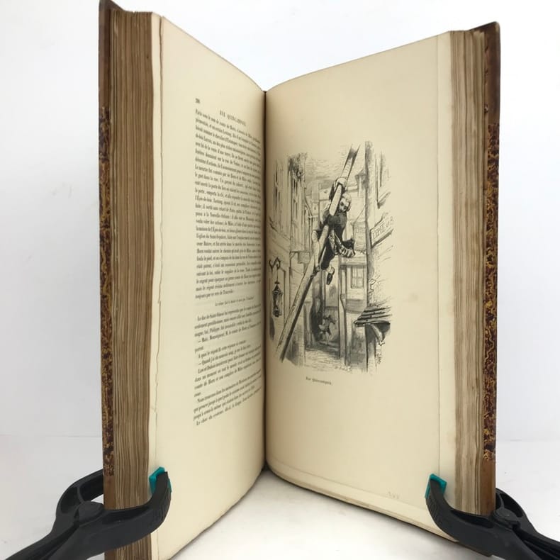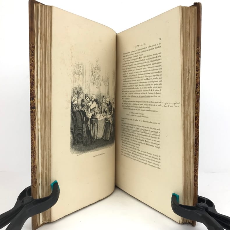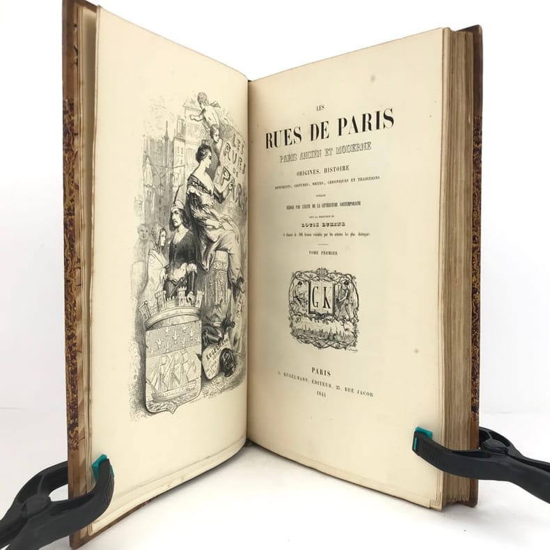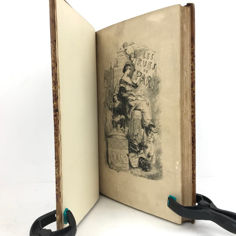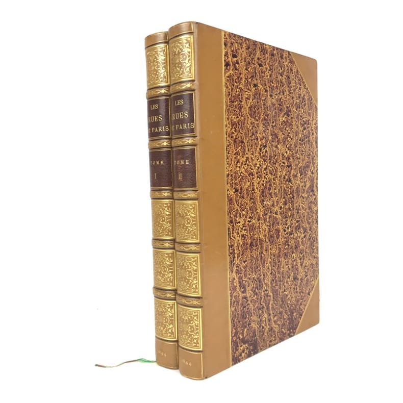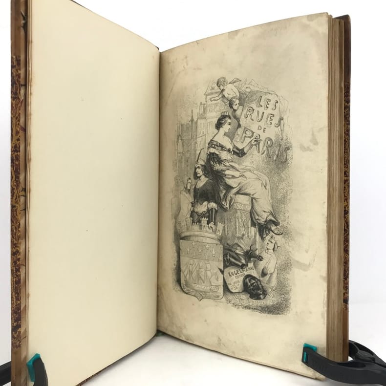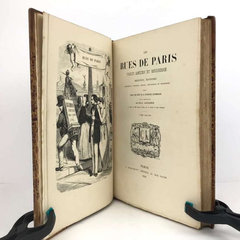 2 volumes in-4 (27,5 cm x 17 cm), demi veau blond à coins (reliure de l’époque signée Champs), dos à nerfs orné de motifs dorés, pièce de titre et de tomaison brunes, tête dorée, ex-libris d’André Barrier contrecollé sur le contreplat, couverture conservée, [4]-396-[4]-4 ; [4]-411-[1]-[3]-1 bl. (complet). Légers frottements à la reliure, quelques rousseurs, quelques feuillets brunis. Bon état. ÉDITION ORIGINALE illustrée de 2 frontispices, d’un portrait de Lurine, de 40 gravures hors-texte ainsi que de nombreuses illustrations in-texte par Nanteuil, David, et de Beaumont entre autres. Illustré romantique sur l'histoire de Paris qui réunit des contributions de Jules Janin, Eugène Briffault, Louis Huart, Amédée Achard, Touchard-Lafosse, ou encore Marco de Saint-Hilaire, présentant un recueil de lieux communs et d'anecdotes sur la ville. Bel exemplaire.