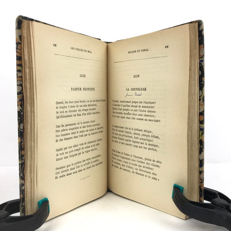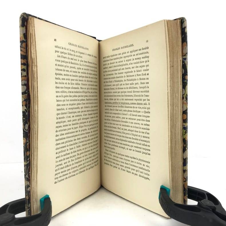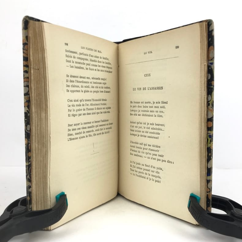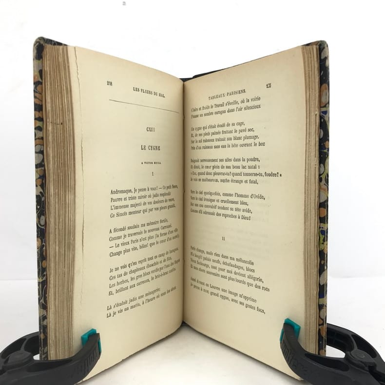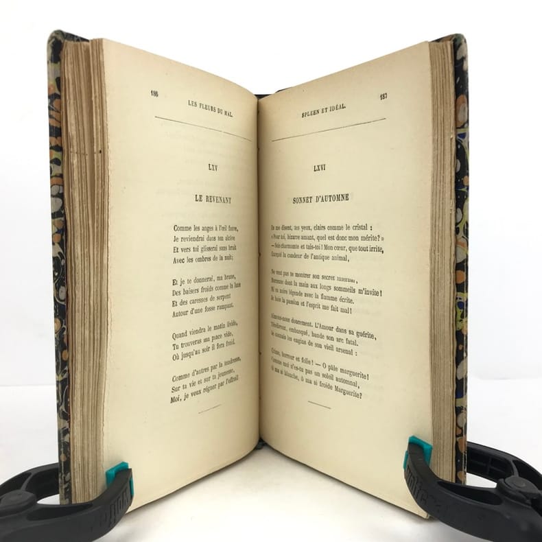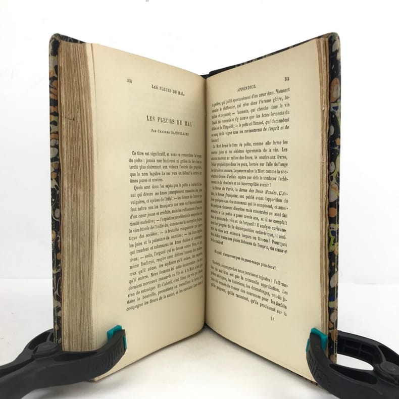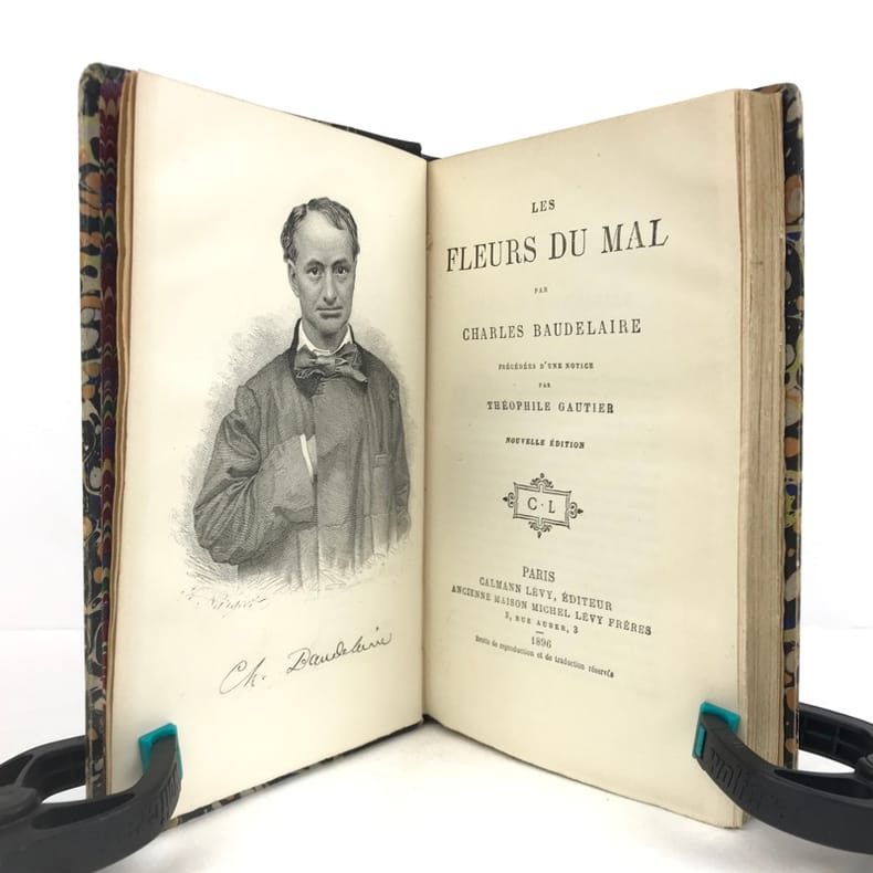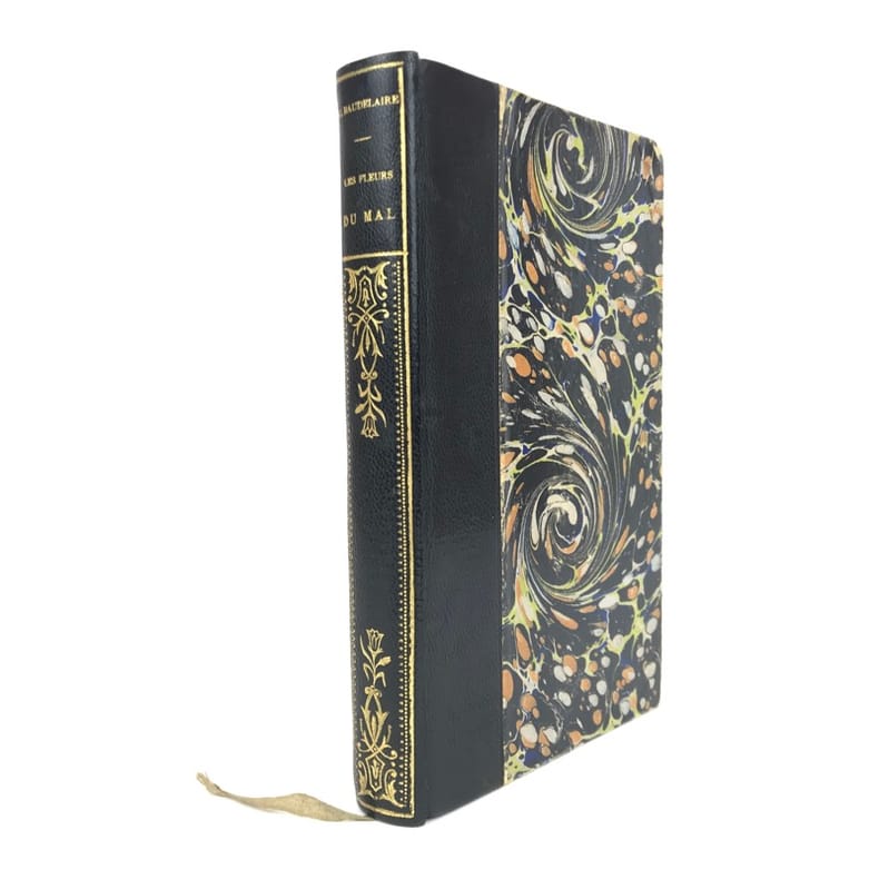 1 volume in-8 (20 x 14 cm), reliure d’art en cuir moderne marbré, couverture et dos conservés, dos à nerfs avec auteur et titre dorés, filets à froid encadrant les plats et sur les chasses, tranche de tête dorée, titre en rouge et noir, lviii-332 pages (complet). Quelques frottements aux mors. État très correct. Le tirage de cette édition a été limité à 1000 exemplaires numérotés et tirés sur papier pur fil des papeteries Lafuma (exemplaire n°672). Nouvelle édition, illustrée d’un portrait de l’auteur. Elle reprend le texte originel des célèbres Fleurs du mal de Charles Baudelaire (1821-1867), l’un des poètes français les plus emblématiques, parnassien mais aussi empreint de classicisme et de romantisme. Publié en 1857 pour la première fois, ce recueil sera poursuivi en justice et censuré de six poèmes - que l’on retrouve ici restitués. Agréable exemplaire.