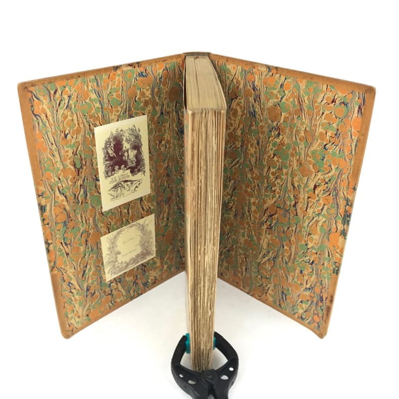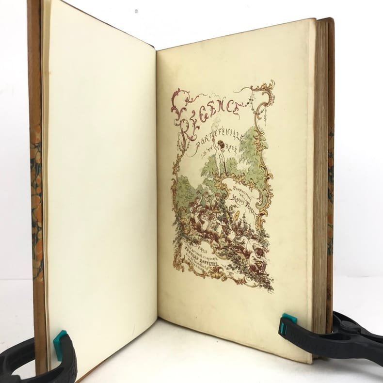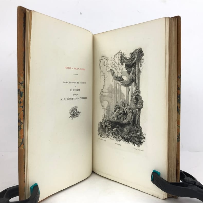 1 volume in-8 (22 cm x 13,5 cm), demi maroquin à coins citron (reliure de l’époque, signée Champs), dos à nerfs orné de motifs dorés, mosaïqués en vert, pièce de titre verte, tête dorée, ex-libris de Jean et Serge Barrier contrecollés sur le contreplat, couverture conservée, [2]-xxvi-224-[4] pages (complet). Rares rousseurs. Bon état. ÉDITION ORIGINALE illustrée d’un titre-gravé ainsi que de 3 gravures à pleine page et quelques vignettes, par Perret, gravées par Rouveyre et Puyplat. Édouard Rouveyre, (1849-1930), est un essayiste, éditeur et libraire français, qui fut un fervent bibliophile, spécialiste et collectionneur d'ouvrages anciens. Outre des bibliographies, on compte aussi dans son catalogue des ouvrages plus techniques ayant pour thèmes des aspects méconnus de l'histoire, le sport, certaines périodes de l'histoire de l'art, ainsi que les arts décoratifs. Bel exemplaire.