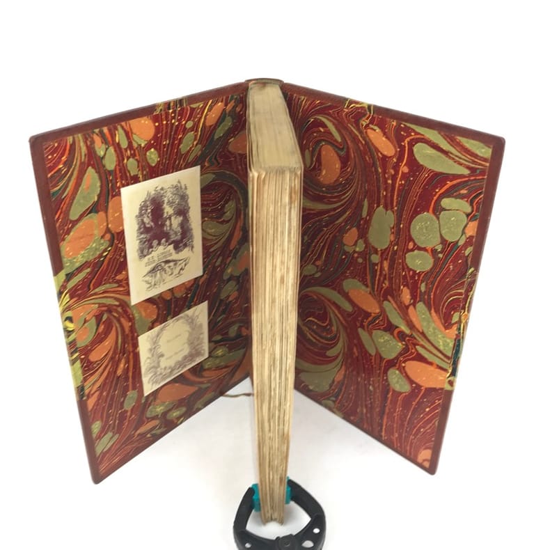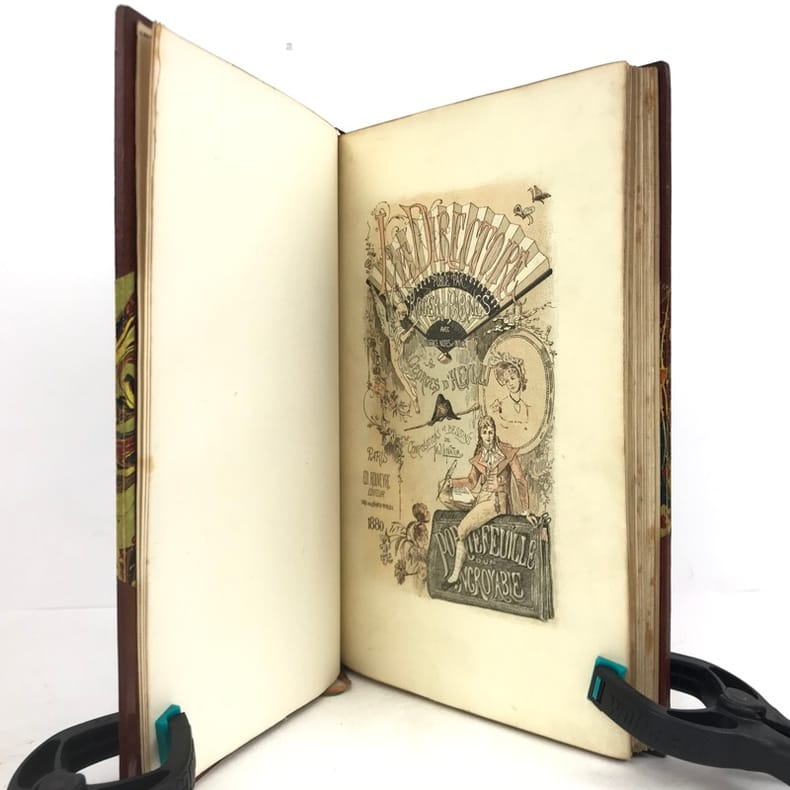 1 volume in-8 (22 cm x 13,5 cm), demi maroquin à coins fauve (reliure de l’époque, signée Champs), dos à nerfs orné de motifs dorés, mosaïqués en vert, tête dorée, ex-libris de Jean et Serge Barrier contrecollés sur le contreplat, couverture conservée, xviii-227-[1] pages (complet). Rares rousseurs. Bon état. ÉDITION ORIGINALE illustrée d’un frontispice ainsi que de 2 gravures à pleine-page et quelques vignettes, par Nature, gravées, entres autres, par Rouveyre et Puyplat. Édouard Rouveyre, (1849-1930), est un essayiste, éditeur et libraire français, qui fut un fervent bibliophile, spécialiste et collectionneur d'ouvrages anciens. Outre des bibliographies, on compte aussi dans son catalogue des ouvrages plus techniques ayant pour thèmes des aspects méconnus de l'histoire, le sport, certaines périodes de l'histoire de l'art, ainsi que les arts décoratifs. Bel exemplaire.