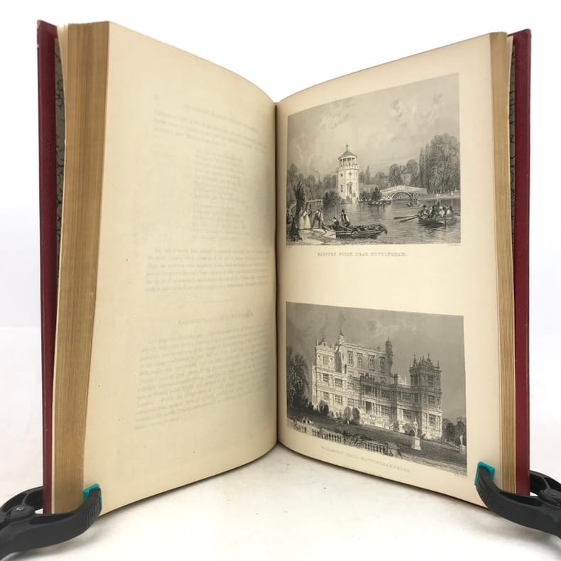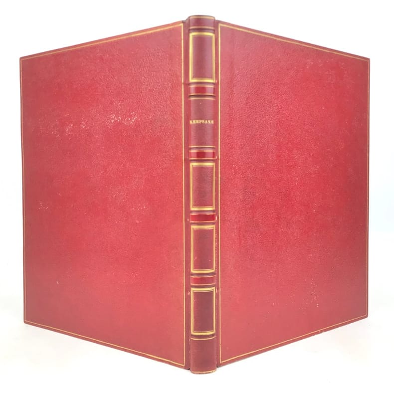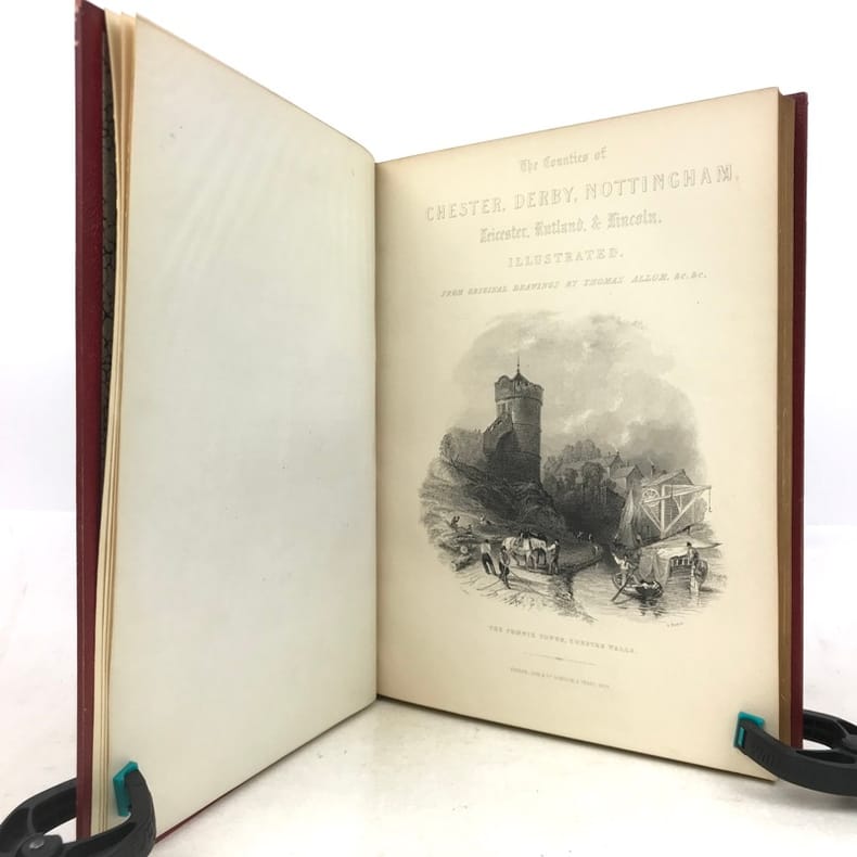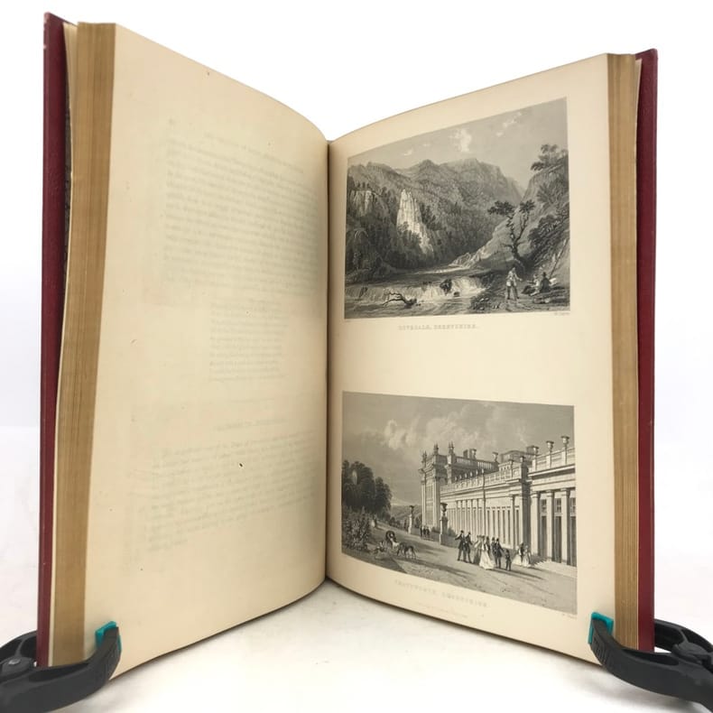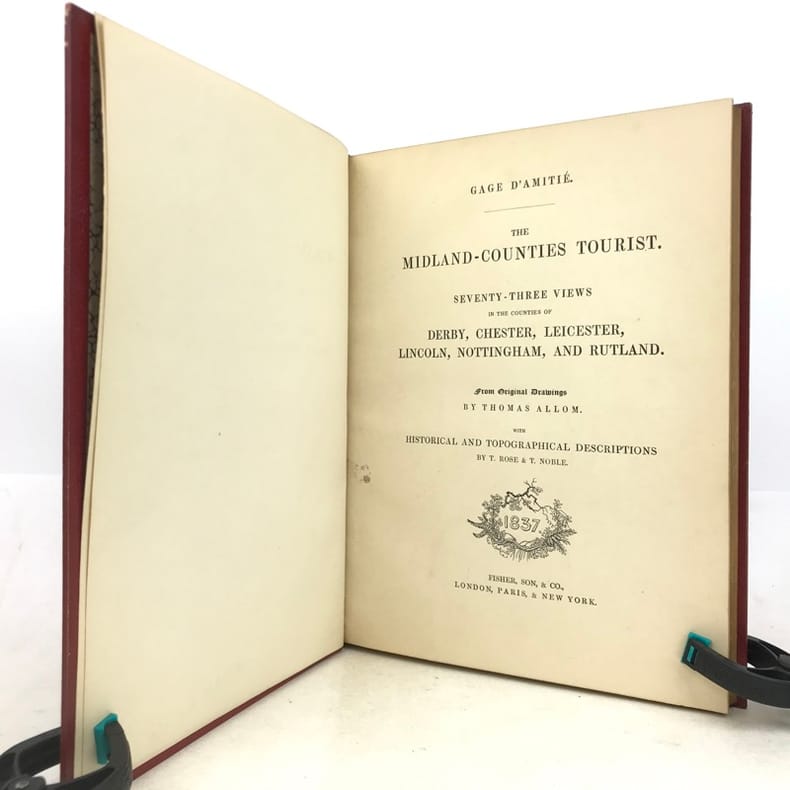 1 volume in-4 (27 x 20,5 cm), demi-chagrin rouge (reliure de l’époque), dos à nerfs orné de filets dorés, filet doré en encadrement sur les plats de percaline rouge, tranches dorées, texte en anglais. 76 pages (complet). Légers frottements angulaires, légèrement brunis mais sans taches. Très bon état. Édition illustrée d’un titre gravé et de 72 gravures hors texte sous serpente. Ouvrage permettant la découverte des régions anglaises, de leurs monuments et paysages, avec des textes descriptifs et historiques par Thomas Rose, topographe, et Thomas Noble. Thomas Allom (1804-1872) est un peintre, illustrateur et architecte britannique, un des fondateurs de ce qui deviendra le Royal Institute of British Architects. Il est surtout connu pour ses dessins topographiques. Il voyage en Angleterre, dans toute l’Europe, jusqu’en Anatolie, en Syrie et en Palestine. Bel exemplaire.