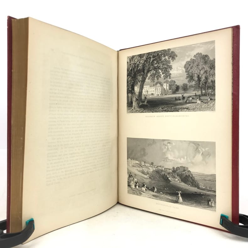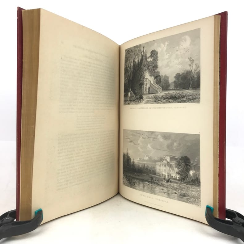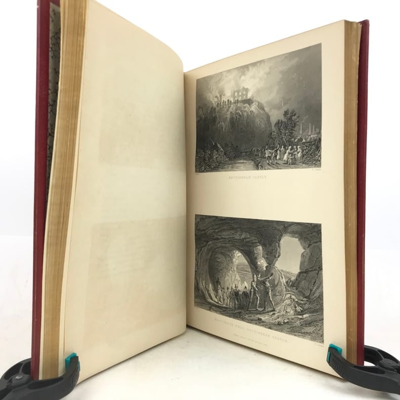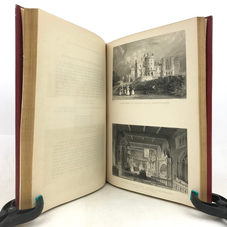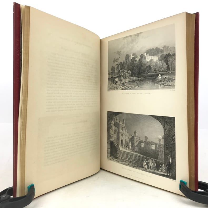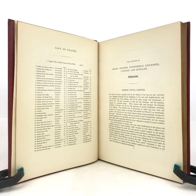 1 volume in-4 (27 x 20,5 cm), demi-chagrin rouge (reliure de l’époque), dos à nerfs orné de filets dorés, filet doré en encadrement sur les plats de percaline rouge, tranches dorées, texte en anglais. 76 pages (complet). Légers frottements angulaires, légèrement brunis mais sans taches. Très bon état. Édition illustrée d’un titre gravé et de 72 gravures hors texte sous serpente. Ouvrage permettant la découverte des régions anglaises, de leurs monuments et paysages, avec des textes descriptifs et historiques par Thomas Rose, topographe, et Thomas Noble. Thomas Allom (1804-1872) est un peintre, illustrateur et architecte britannique, un des fondateurs de ce qui deviendra le Royal Institute of British Architects. Il est surtout connu pour ses dessins topographiques. Il voyage en Angleterre, dans toute l’Europe, jusqu’en Anatolie, en Syrie et en Palestine. Bel exemplaire.
