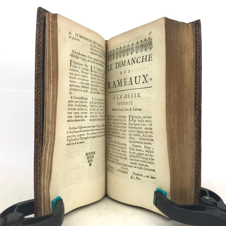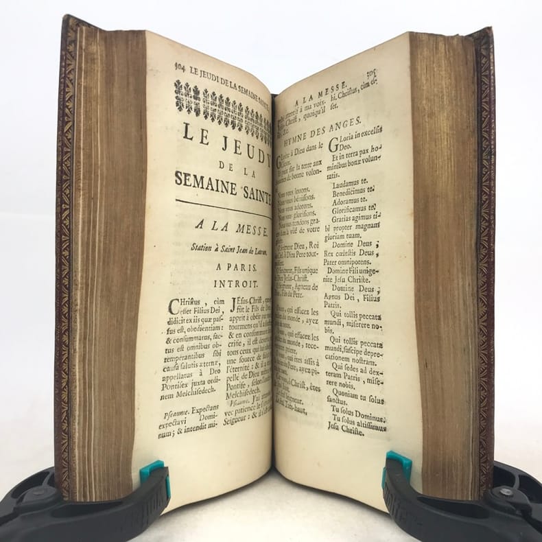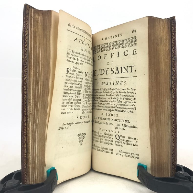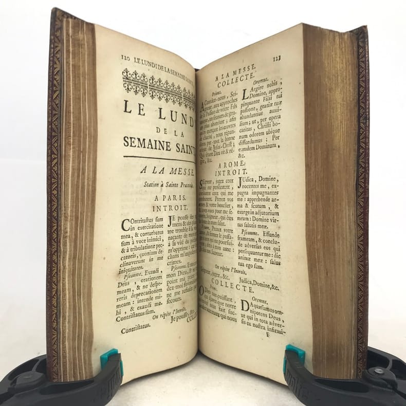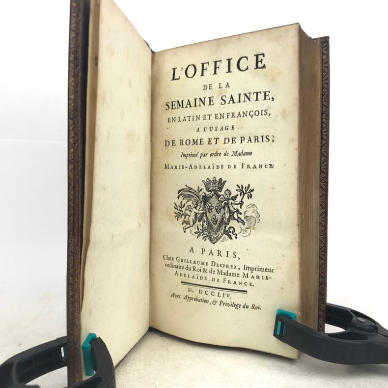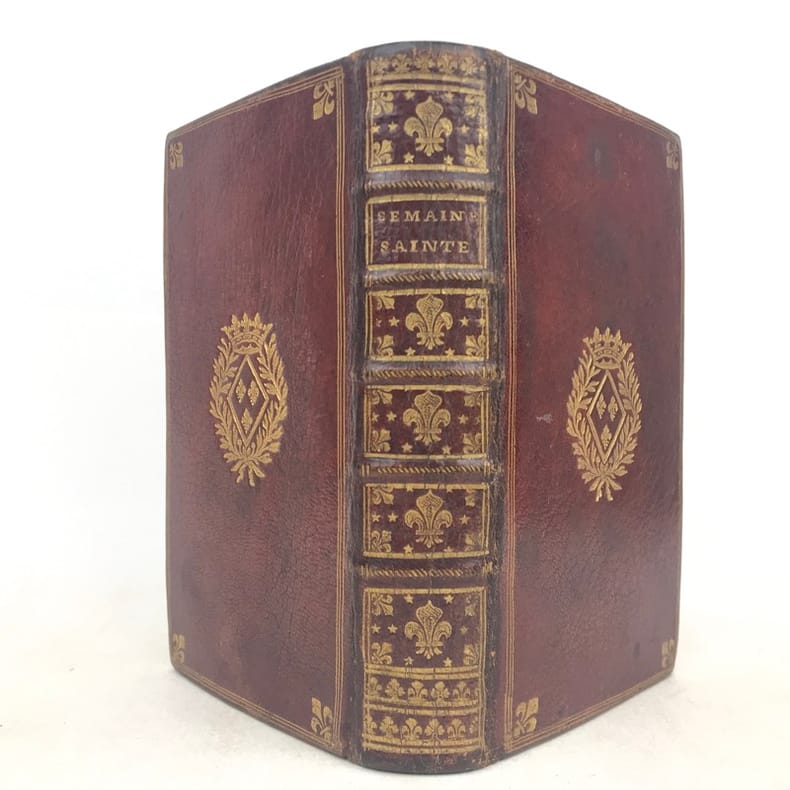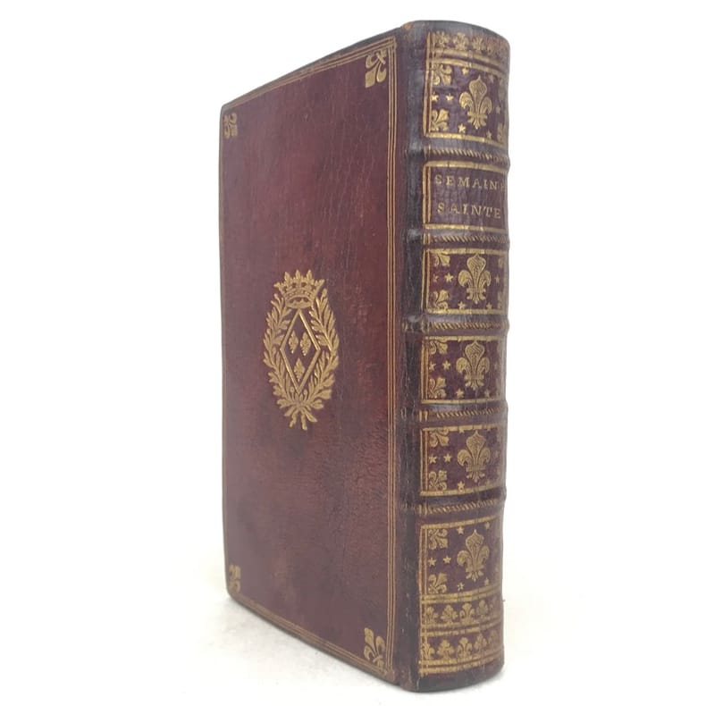 1 volume in-12 (17 x 9,5 cm), maroquin grenat (reliure de l'époque), dos à nerfs orné et fleurdelysé, triple filet doré encadrant les plats avec fleurs de lys en écoinçons, roulette dorée sur les coupes et sur les chasses, tranches dorées, texte sur double colonne, xxiv-744 pages (complet). Quelques fines taches sur le cuir, infimes frottements aux mors, quelques rousseurs. État très correct. RELIURE AUX ARMES de Marie-Adélaïde de France (1732-1800), fille de Louis XV (O. H. R., pl. 2514, fer n°5). Sa bibliothèque, plus considérable que celle de ses sœurs avec près de 10 000 volumes, fut vendue durant la Révolution. Recueil des prières réservées à la semaine précédant Pâques, en français et en latin, ici réimprimé sur ordre de la princesse. BEL EXEMPLAIRE.