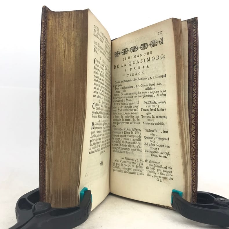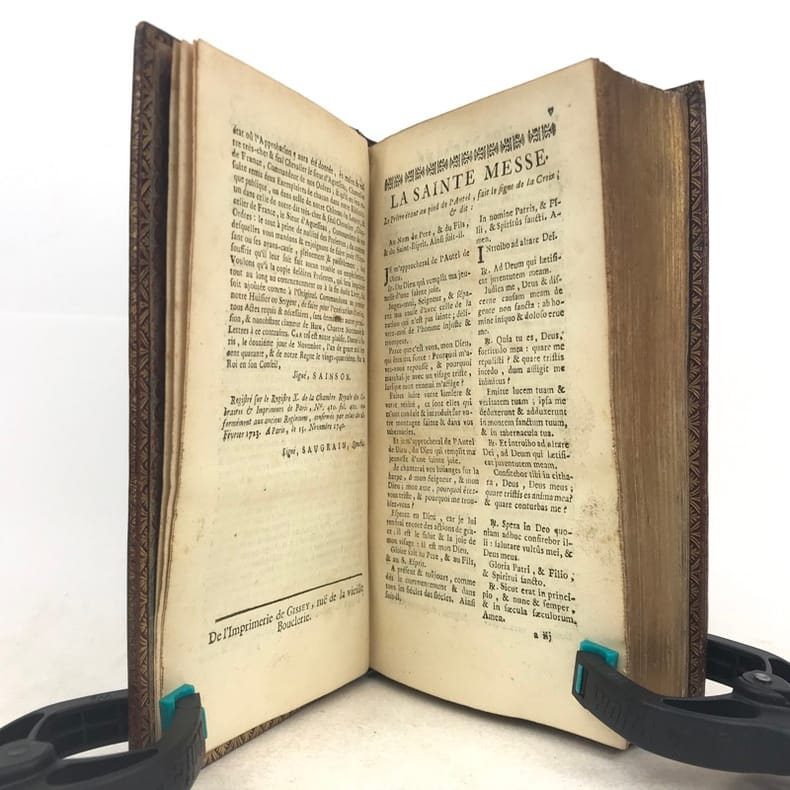 Paris, Chez Guillaume Desprez Imprimeur ordinaire du Roi & du Clergé de France, 1758, 647 pages. Plein veau d'époque. Triples filets dorés, fleuron dans les angles. Dos à nerfs avec pièce de titre. Toutes tranches dorées. Frottements au dos et sur les plats. Bon état général. 1 gravure pleine page.