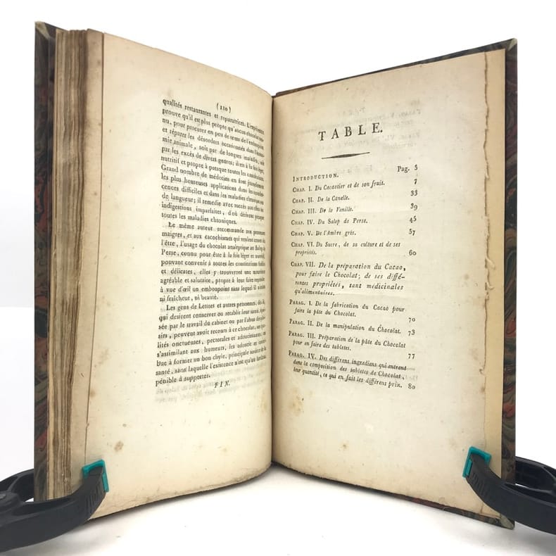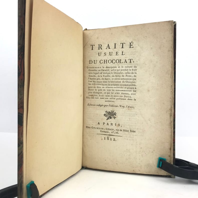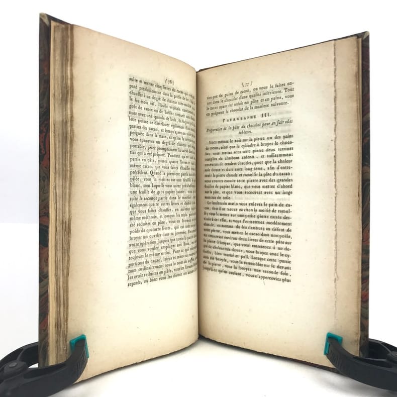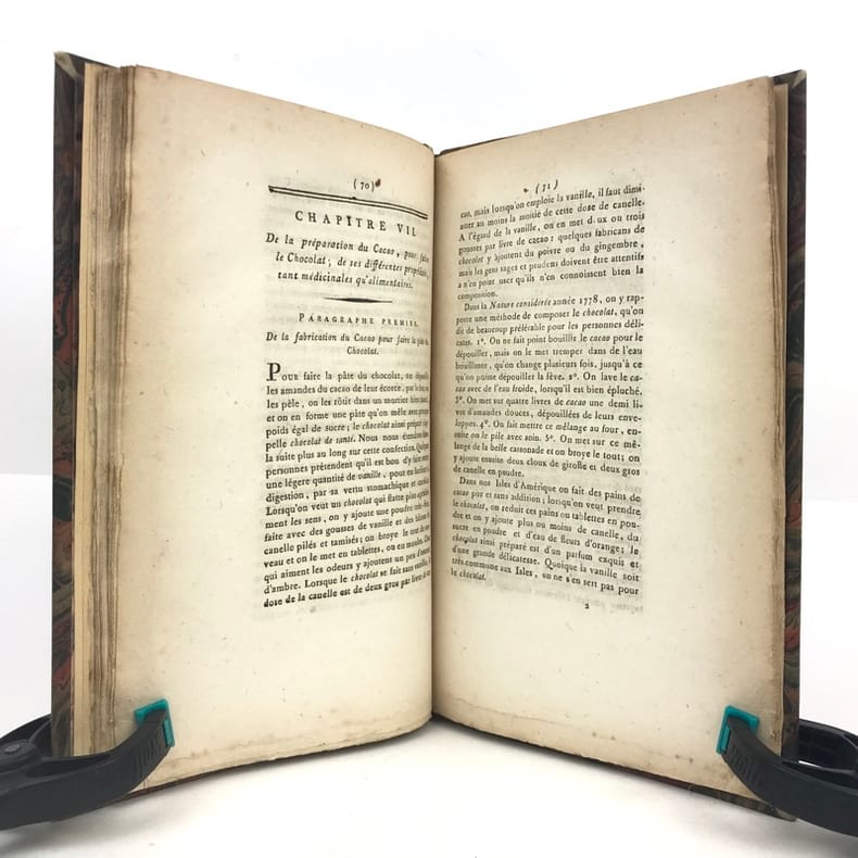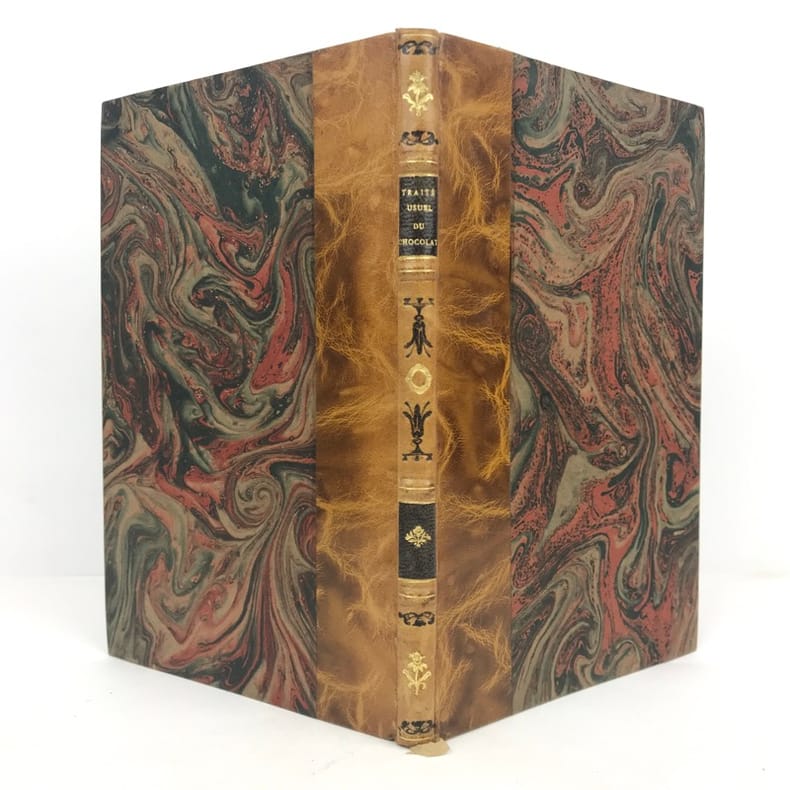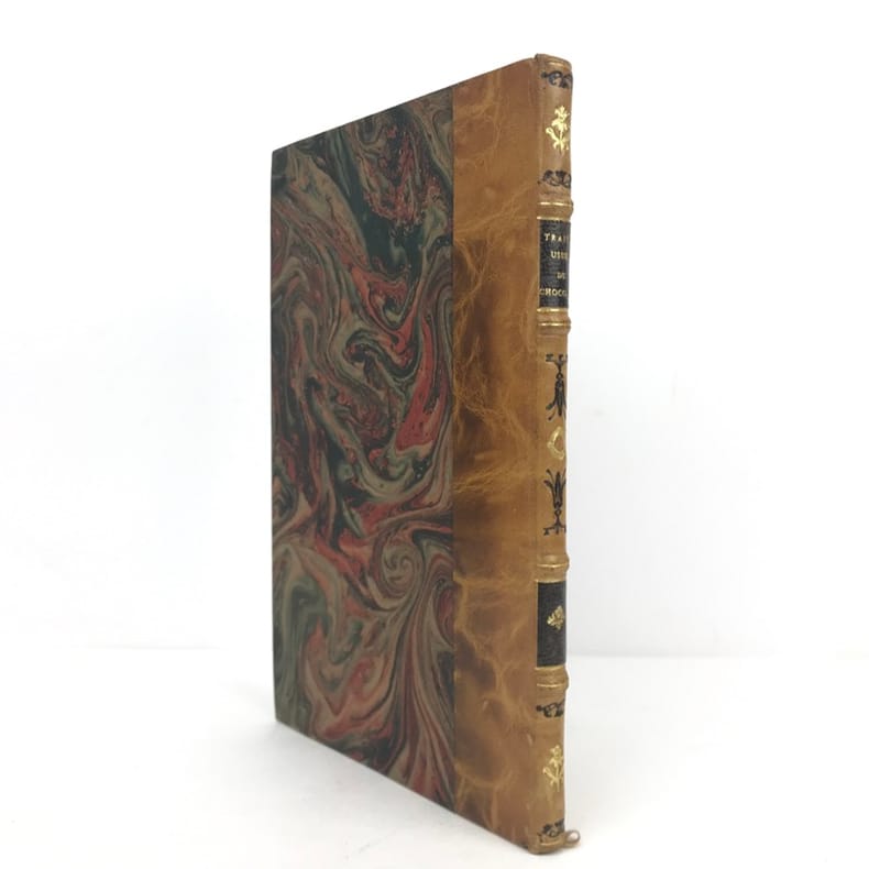 1 volume in-8 (21,1 x 13,6 cm), demi basane fauve (reliure XIXe), dos à nerfs ornés, fers à chaud et à froid, pièce de titre et de tomaison de maroquin brun, tête dorée, 112 pages (complet). Petite brunissure. Bon état. Édition originale, rédigée par l'éditeur d'après le manuscrit laissé par l'auteur à sa mort. L'ouvrage comprend huit chapitres traitant successivement du cacaotier et de son fruit, de la cannelle, de la vanille, du salep de Perse, de l'ambre gris, du sucre et autres substances que l'on fait entrer dans la fabrication du chocolat, il contient aussi de nombreuses recettes et des conseils médicaux. Rare exemplaire.