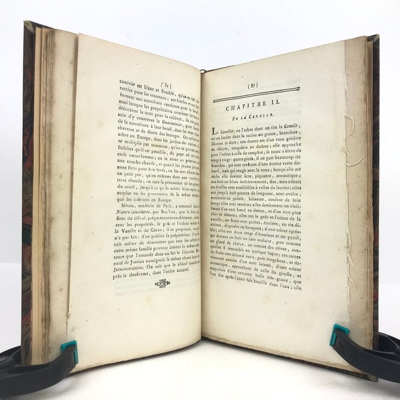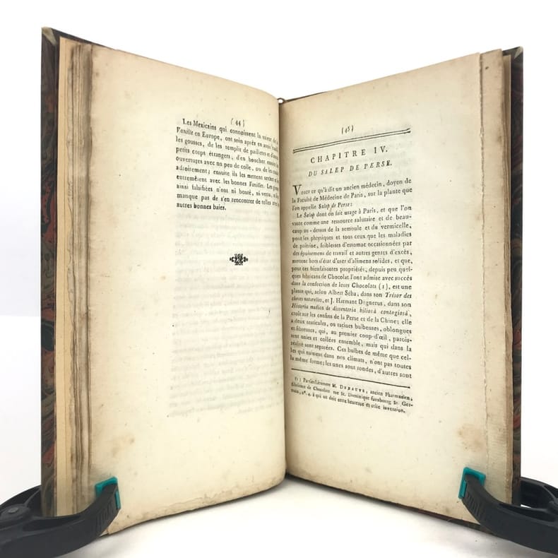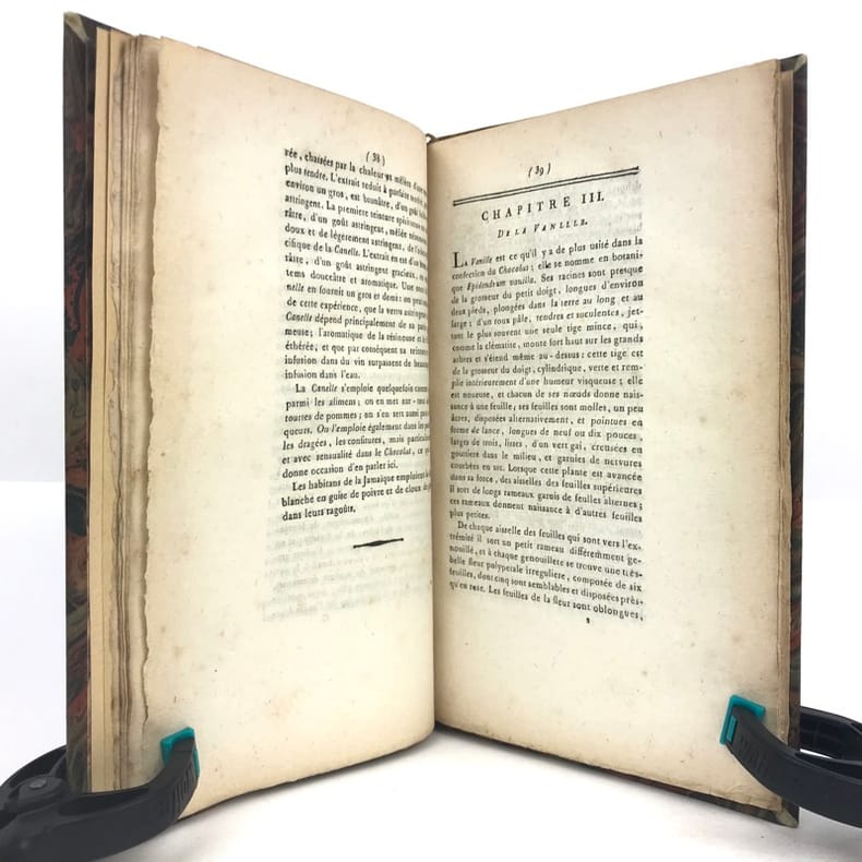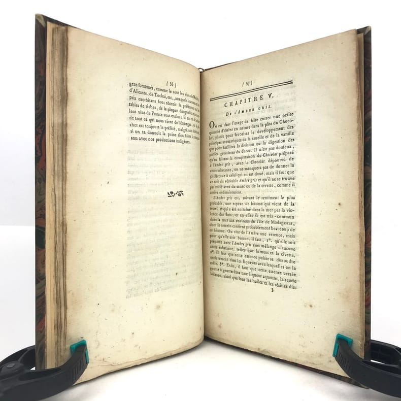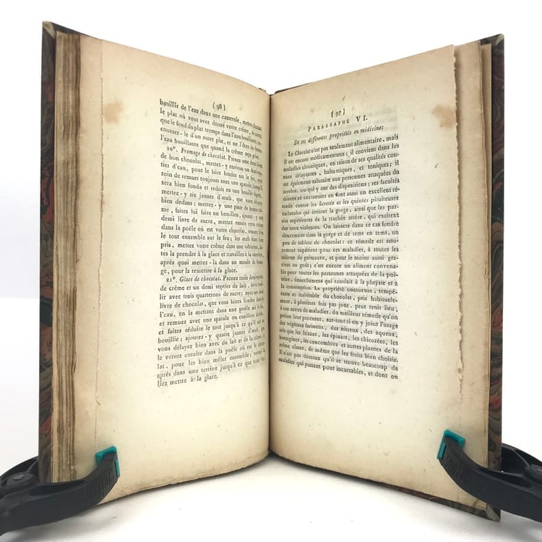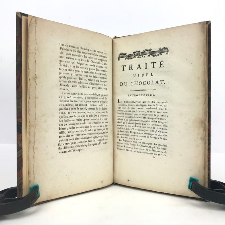 1 volume in-8 (21,1 x 13,6 cm), demi basane fauve (reliure XIXe), dos à nerfs ornés, fers à chaud et à froid, pièce de titre et de tomaison de maroquin brun, tête dorée, 112 pages (complet). Petite brunissure. Bon état. Édition originale, rédigée par l'éditeur d'après le manuscrit laissé par l'auteur à sa mort. L'ouvrage comprend huit chapitres traitant successivement du cacaotier et de son fruit, de la cannelle, de la vanille, du salep de Perse, de l'ambre gris, du sucre et autres substances que l'on fait entrer dans la fabrication du chocolat, il contient aussi de nombreuses recettes et des conseils médicaux. Rare exemplaire.