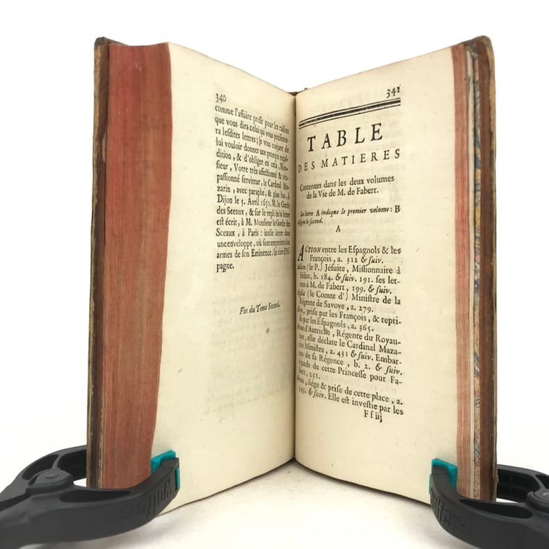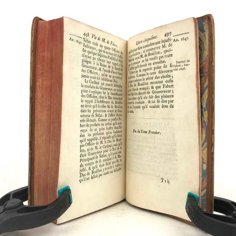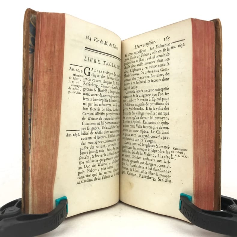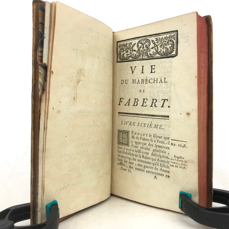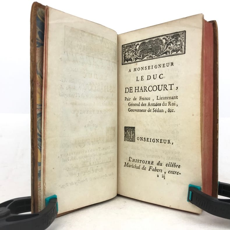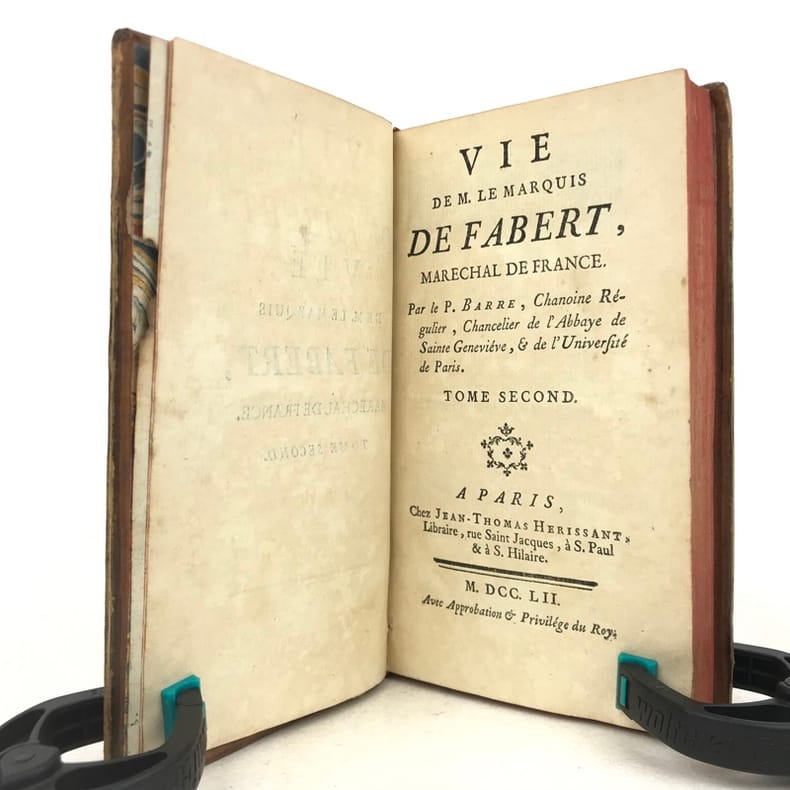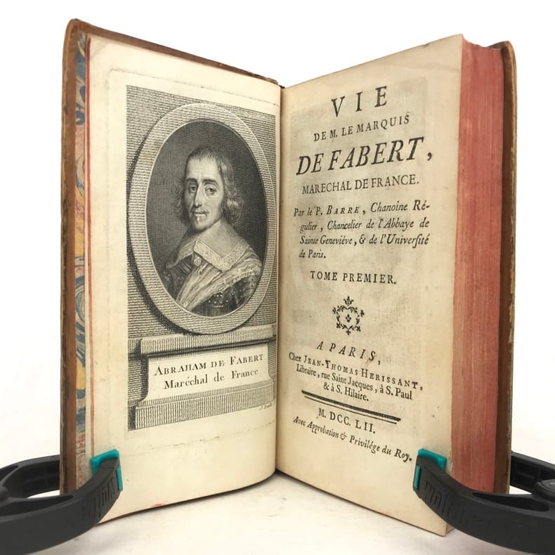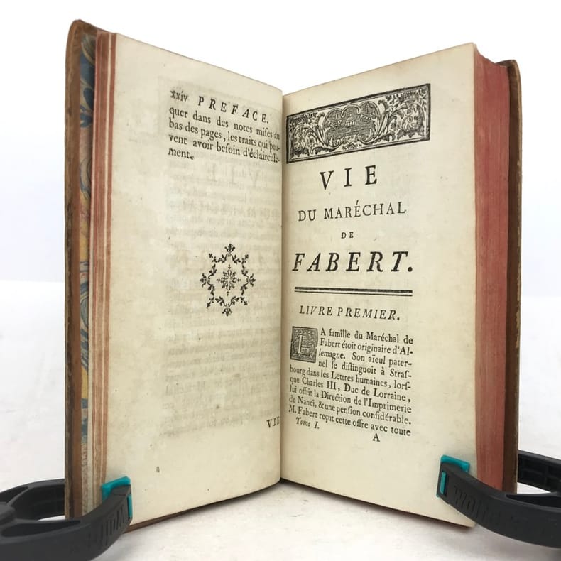 Paris, Jean-Thomas Hérissant, 1752. 2 vol. in-12, veau marbré, dos à nerfs ornés de fleurons dorés, pièces de titre en maroquin rouge, roulette dorée sur les coupes, tranches rouges. Reliures de l'époque, coins râpés. Bon exemplaire. Cachet humide du notaire E.M.N. Despoiriers (à Senval) sur les titres. xxiv-499 pp., (5) pp.; (2) ff., 376 pp. On joint un portrait gravé de Fabert. 1 feuillet remmargé au début du tome I.