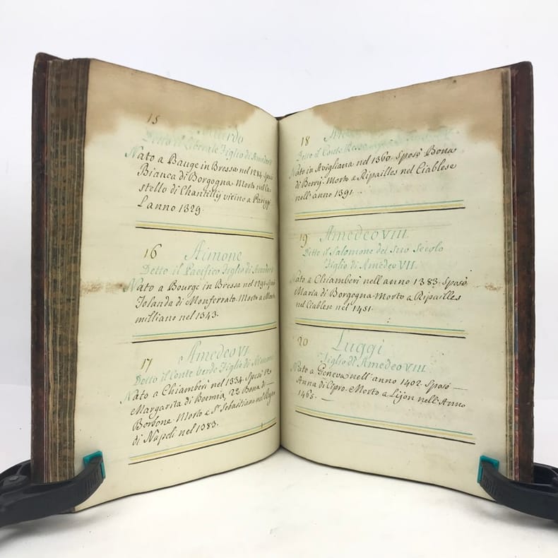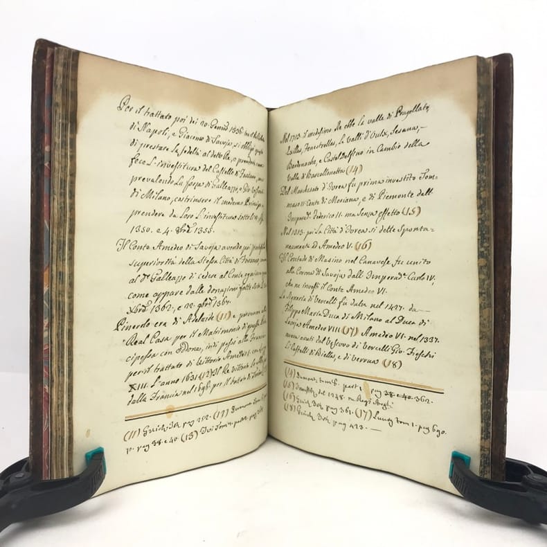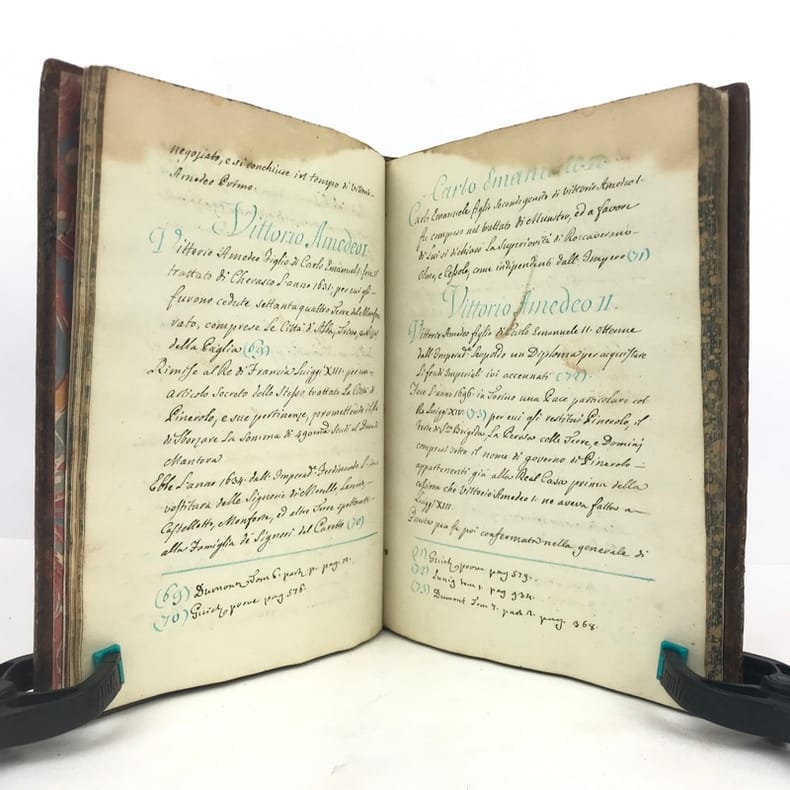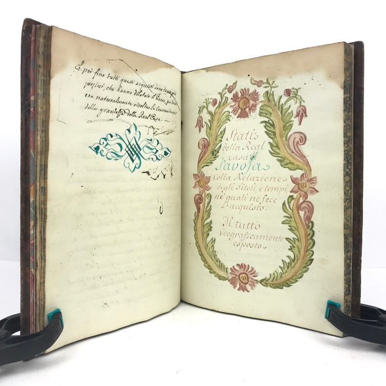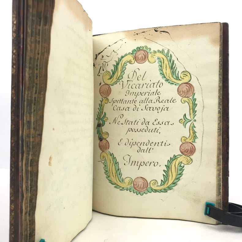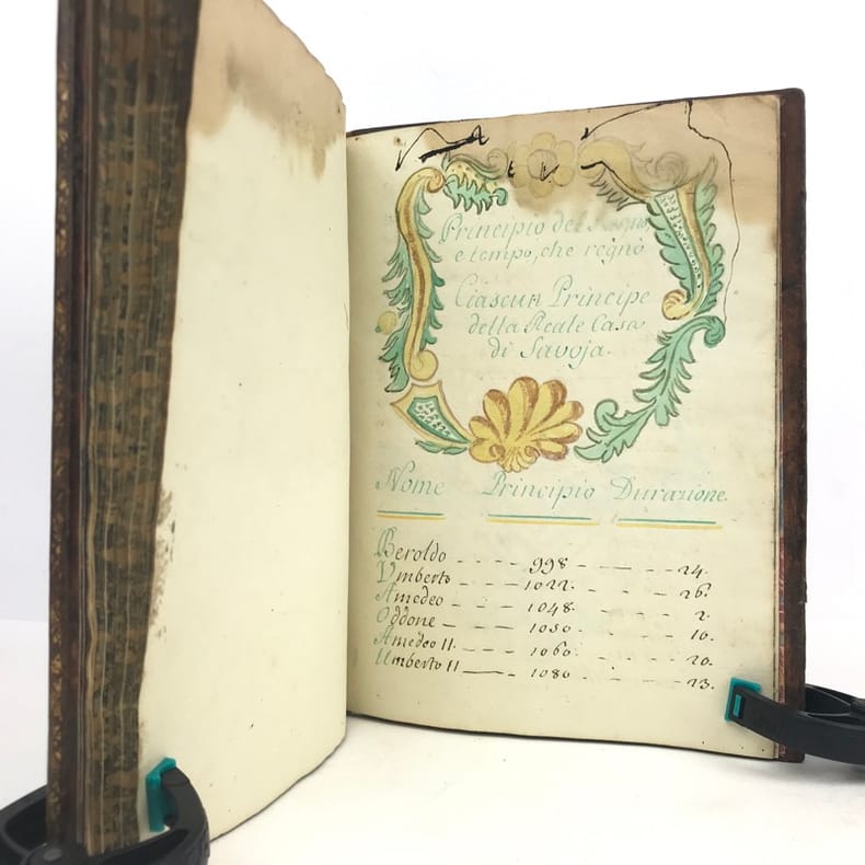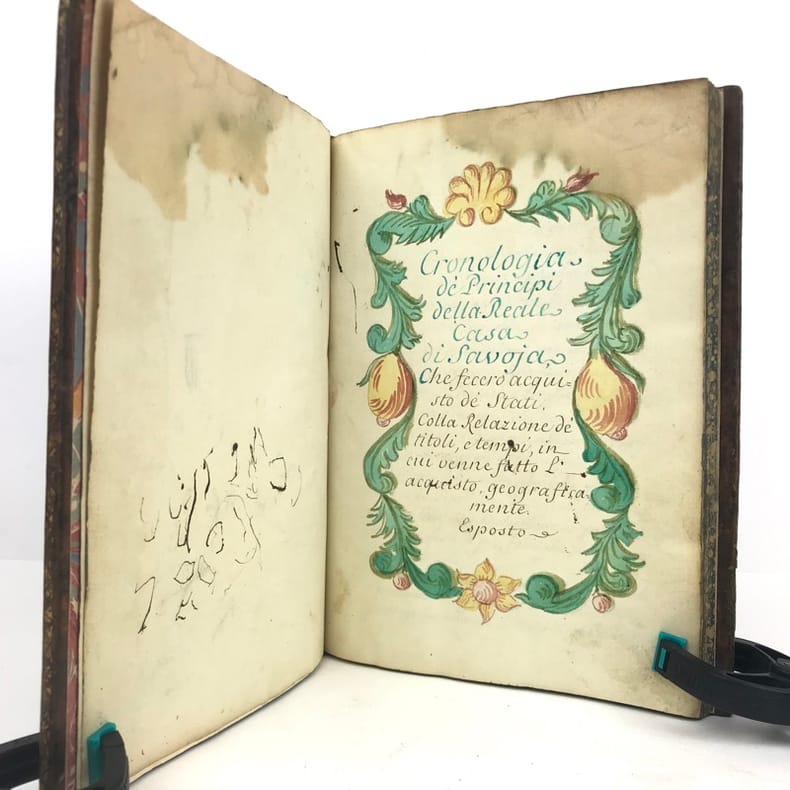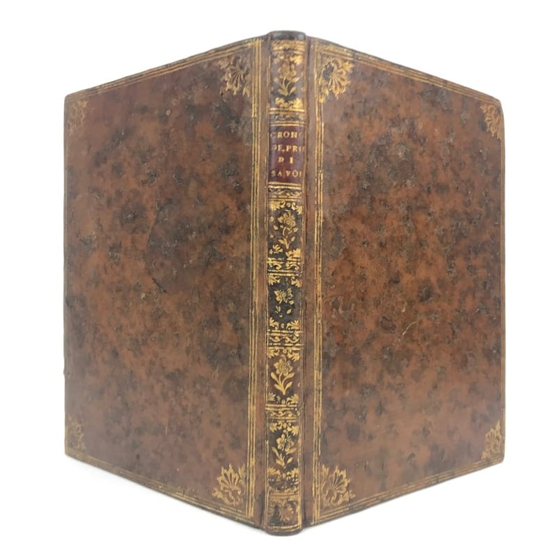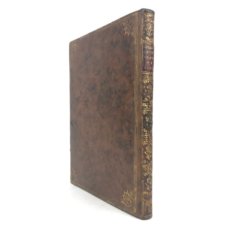1 volume petit in-4 (22,3 x 16,5 cm), basane brune marbrée (reliure de l'époque), dos lisse orné de caissons fleuronnés, pièce de titre de maroquin rouge, triple filet en encadrement des plats, fers en écoinçons, tranches bleues mouchetées, 140 pages. Un mors restauré, mouillure plus ou moins sombre dans la marge supérieure ne gênant pas la lecture, quelques essais de plume en marge. État très correct. Manuscrit en italien de l'histoire de la maison de Savoie, dédié à Victor-Amédée III, duc de Savoie et roi de Sardaigne, exécuté avec soin, d'une écriture régulière et parfaitement lisible, aux encres de couleur noire, safran, turquoise et vert d'eau, et agrémenté d'encadrements floraux pour les titres de chaque partie et de nombreux culs-de-lampe, le tout joliment peint à l'aquarelle. Charmant et intéressant manuscrit, établi avec rigueur et présentant de nombreuses notes biographiques en bas de page. Il est divisé en trois parties : la première présentant par ordre chronologique les notices biographiques des princes de la maison jusqu'en 1773 ; la seconde décrivant les États de la maison, comprenant la Sardaigne, la Savoie, le Piémont, Monferrato et la Lombardie ; la troisième sur "le vicariat impérial dû à la maison royale de Savoie dans les états possédés et dépendants de l'Empire". Document unique.