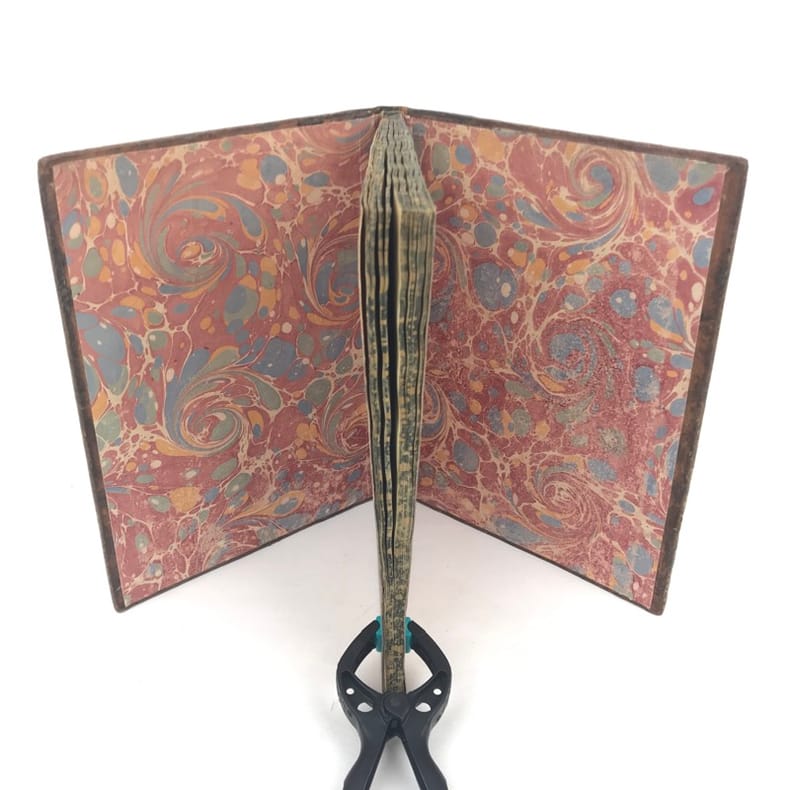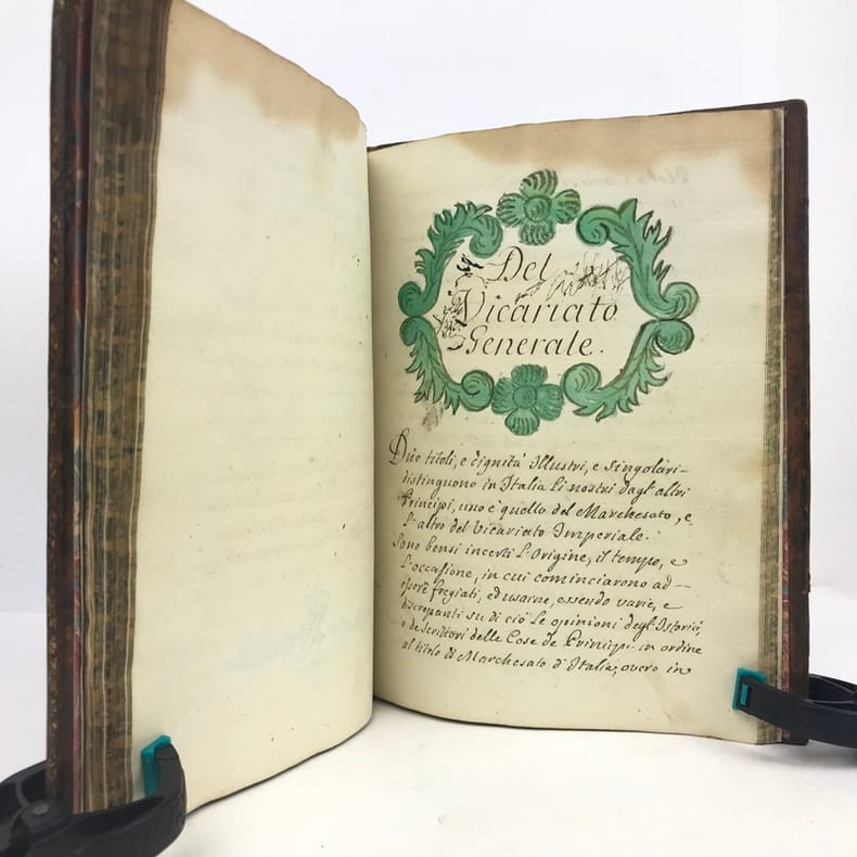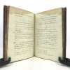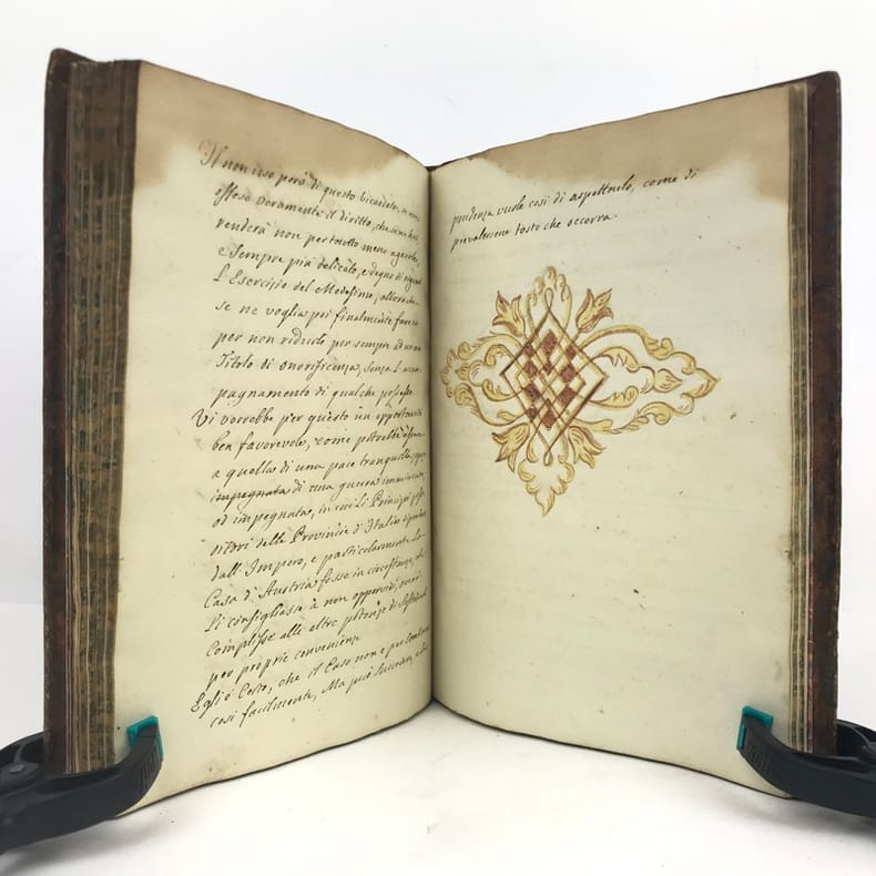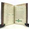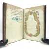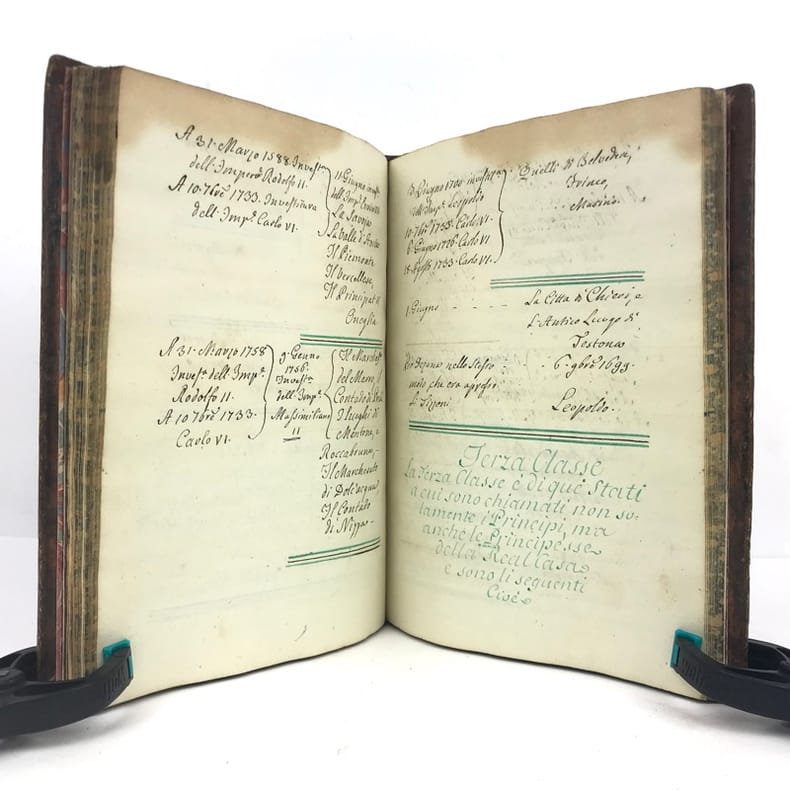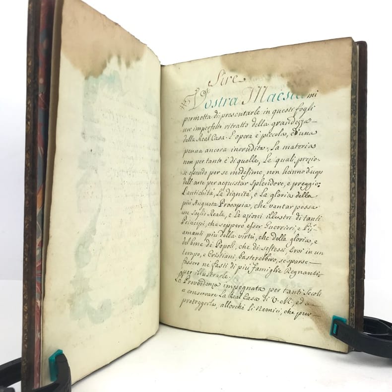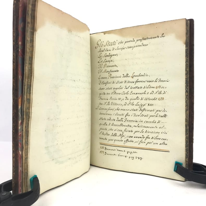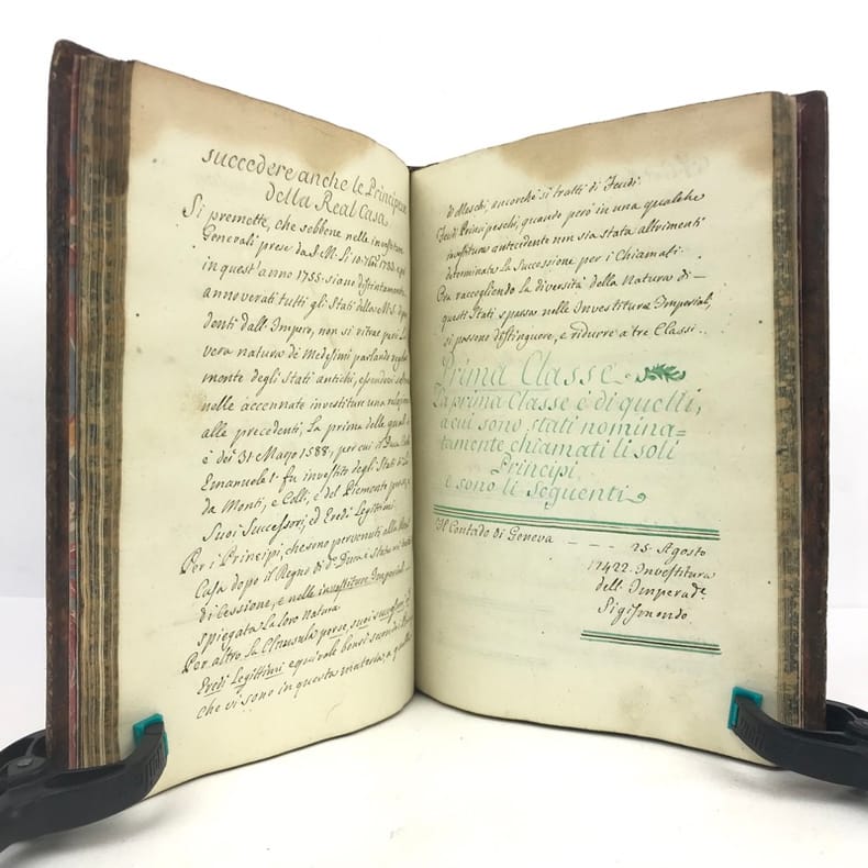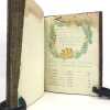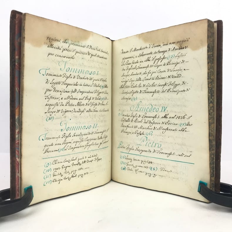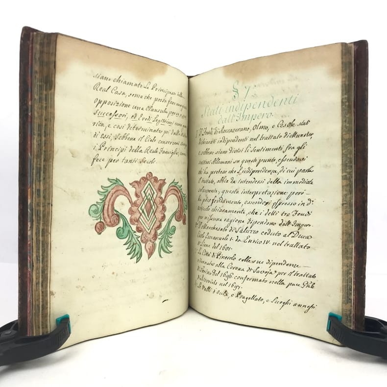 1 volume petit in-4 (22,3 x 16,5 cm), basane brune marbrée (reliure de l'époque), dos lisse orné de caissons fleuronnés, pièce de titre de maroquin rouge, triple filet en encadrement des plats, fers en écoinçons, tranches bleues mouchetées, 140 pages. Un mors restauré, mouillure plus ou moins sombre dans la marge supérieure ne gênant pas la lecture, quelques essais de plume en marge. État très correct. Manuscrit en italien de l'histoire de la maison de Savoie, dédié à Victor-Amédée III, duc de Savoie et roi de Sardaigne, exécuté avec soin, d'une écriture régulière et parfaitement lisible, aux encres de couleur noire, safran, turquoise et vert d'eau, et agrémenté d'encadrements floraux pour les titres de chaque partie et de nombreux culs-de-lampe, le tout joliment peint à l'aquarelle. Charmant et intéressant manuscrit, établi avec rigueur et présentant de nombreuses notes biographiques en bas de page. Il est divisé en trois parties : la première présentant par ordre chronologique les notices biographiques des princes de la maison jusqu'en 1773 ; la seconde décrivant les États de la maison, comprenant la Sardaigne, la Savoie, le Piémont, Monferrato et la Lombardie ; la troisième sur "le vicariat impérial dû à la maison royale de Savoie dans les états possédés et dépendants de l'Empire". Document unique.