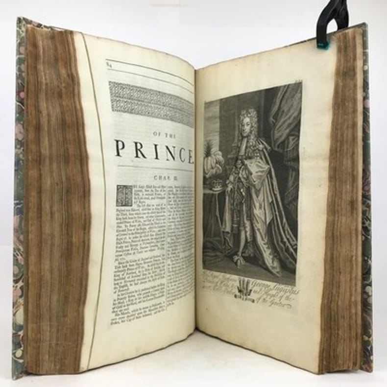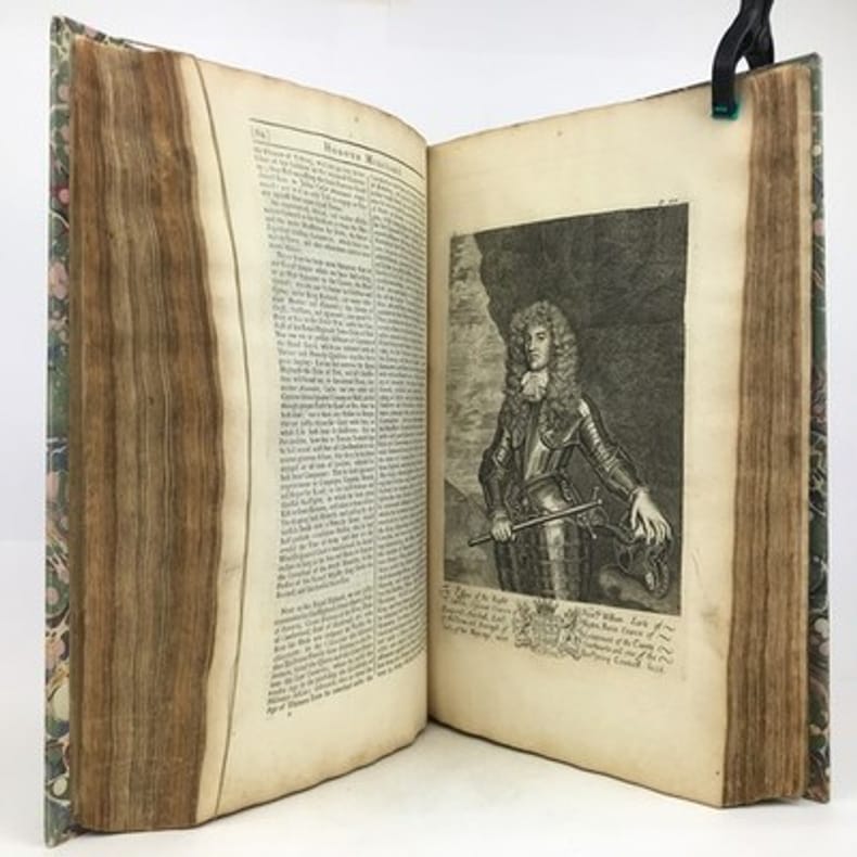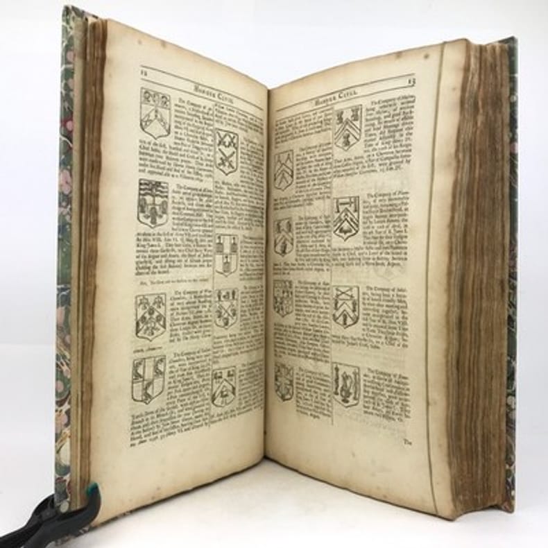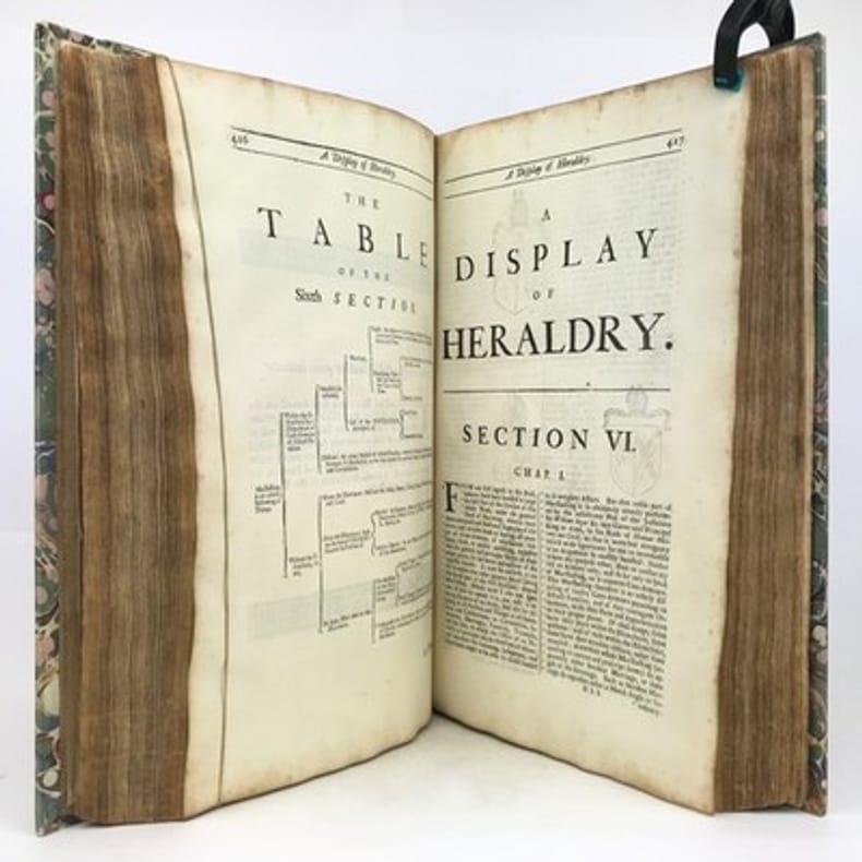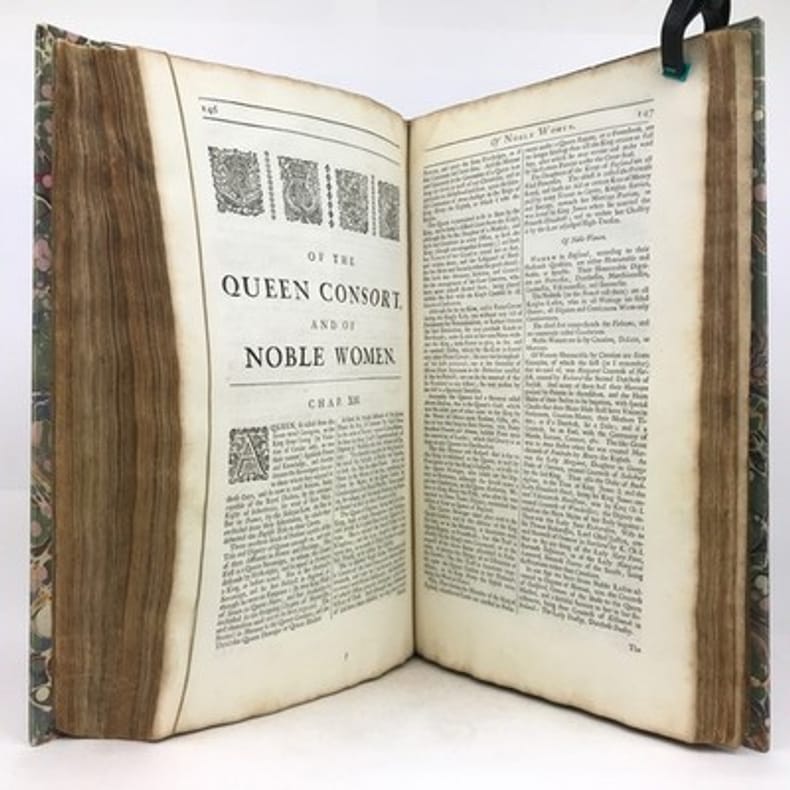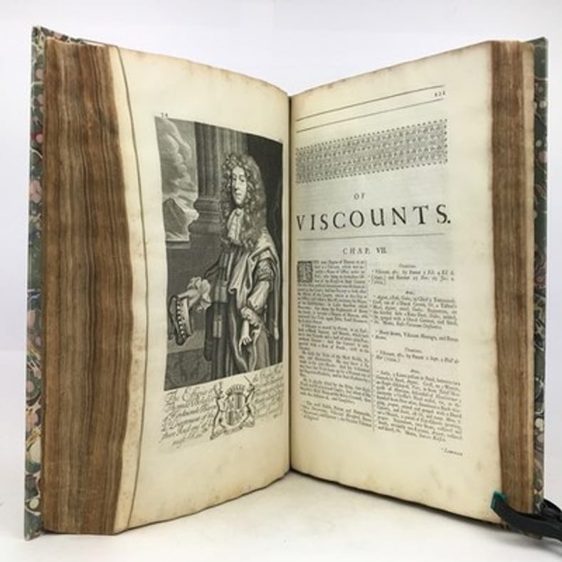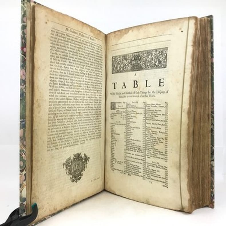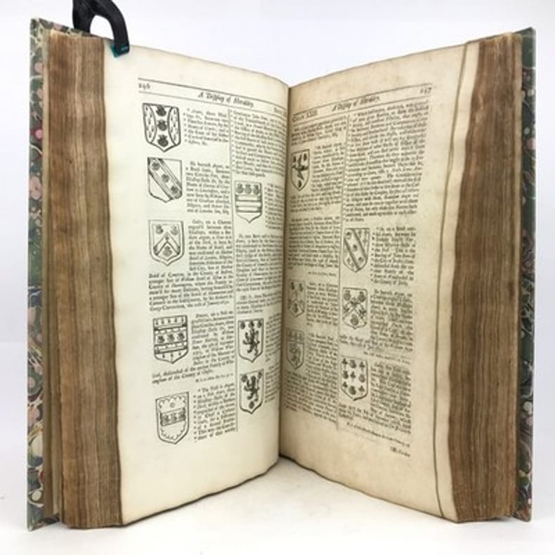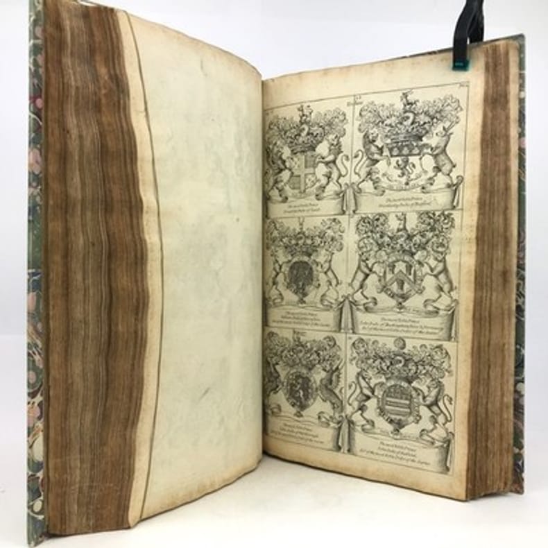 London, R. and J. Bonwicke and R. Wilkin / J. Walthoe and Tho. Ward, 1724, 1 volume, fort in-folio, relié, [9]-20-[2]-460-275-58-24-[22] p.. Sixième édition. 17 planches de portraits et 47 planches de blasons, plusieurs centaines de blasons in-texte, une dizaine colorisés ou partiellement colorisés postérieurement, page de titre en rouge et noir. Reliure d'époque, plein veau marbré glacé, dos à nerfs avec caissons et fleurons dorés, titre doré sur pièce de titre noire, tranches brique, filet double et large dentelle d'encadrement sur les plats, filets à froid sur les coupes et intérieur, mors fendillés à la coiffe supérieure, un à la coiffe inférieure, un angle frotté, pâle mouillure à l'angle infèrieur droit de la page de titre à la page 18, petit manque de papier à l'angle supérieur droit de la page de titre, petite restauration à la marge inférieure d'un feuillet. Bien complet de toutes ses planches.
