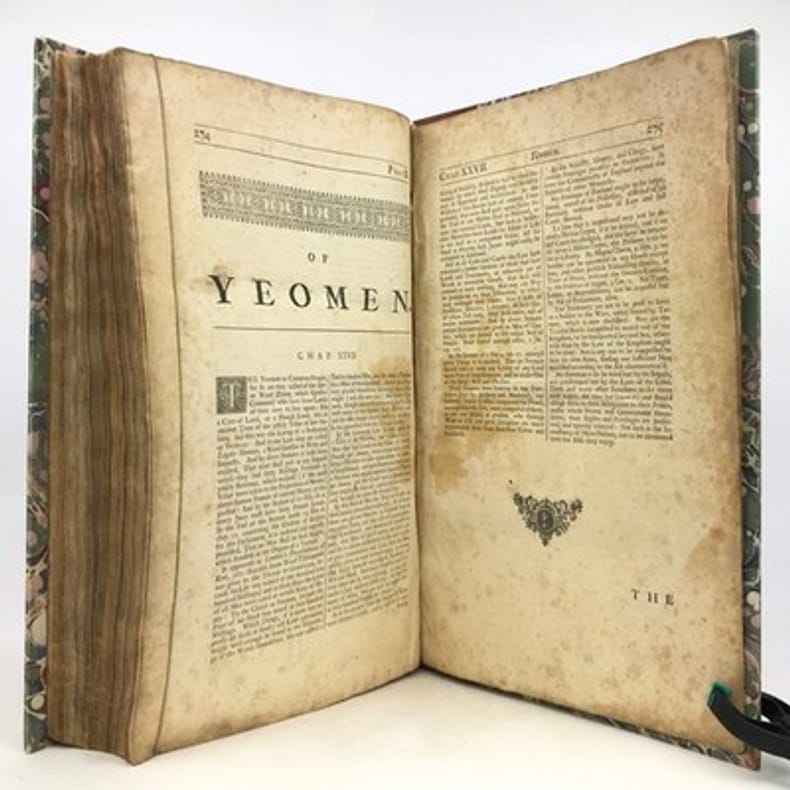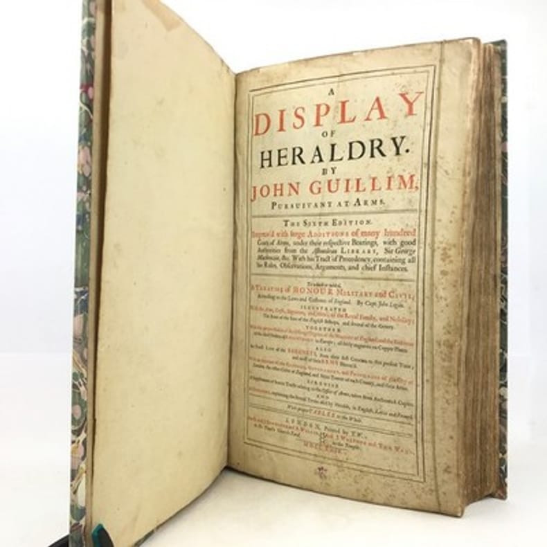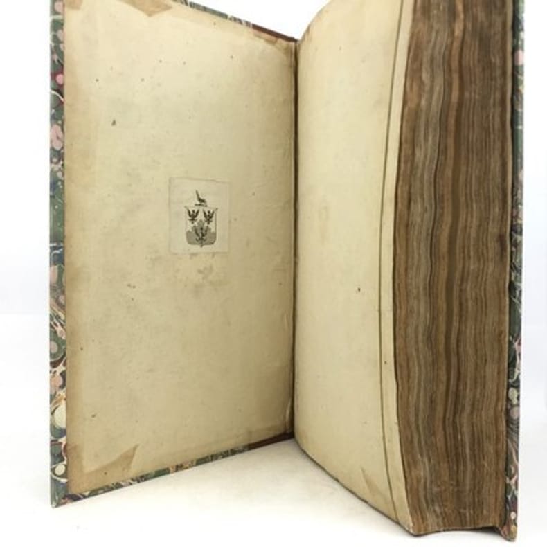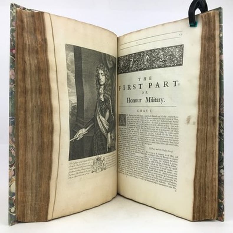 1 volume fort in-folio (40 x 24 cm), demi-veau marbré (reliure moderne), dos à nerfs orné, gardes renouvelées, titre en rouge et noir, étiquette d'ex-libris aux armes et tampon sur la page de titre, [34]-58-24-20-460-[4]-275 pages (complet). Page de titre et second feuillet restaurés en bordure, nombreux feuillets brunis, rousseurs. État correct. À noter : ouvrage relié dans le désordre ("The Second part of Honour civil" relié au début et non à la fin de l'ouvrage), et quelques sauts de pagination inhérents à l'édition. Nouvelle édition, richement illustrée de gravures in-texte et de 64 gravures hors-texte. John Guillim (ca. 1565-1621) était un antiquaire et officier d'armes au College of Arms à Londres. Cette somme historique demeure son travail le plus éminent : il y recense chaque famille anglaise, et son blason correspondant. Publié pour la première fois en 1610, l'ouvrage connut dès sa parution un grand succès, et fut réédité de nombreuses fois. Il est ici augmenté d'encore plus de blasons, ainsi que d'un traité sur l'honneur militaire et civil, d'après la loi et les coutumes anglaises. Bon exemplaire.