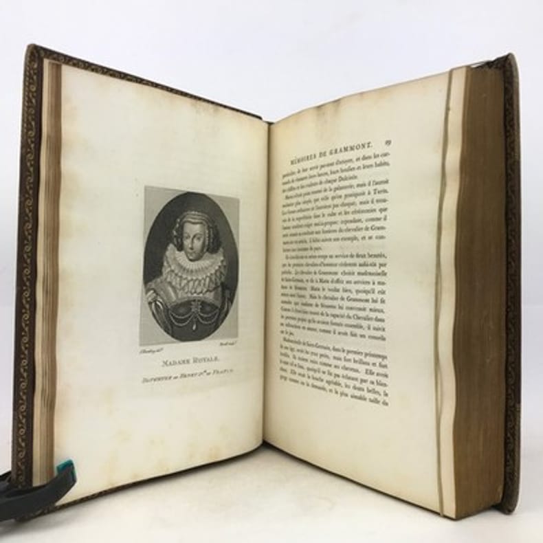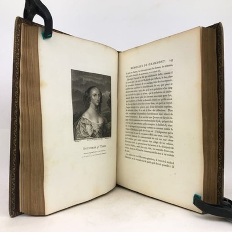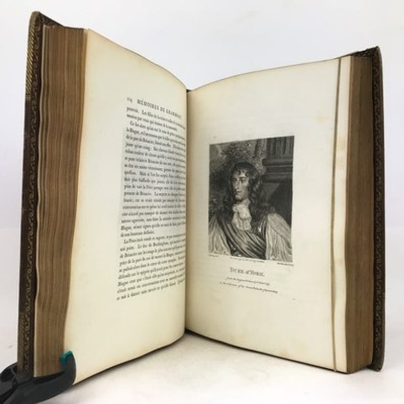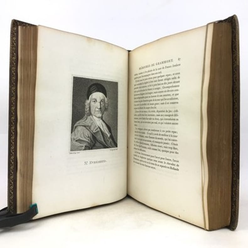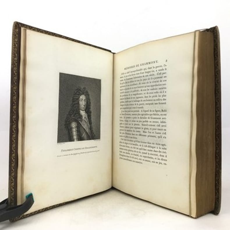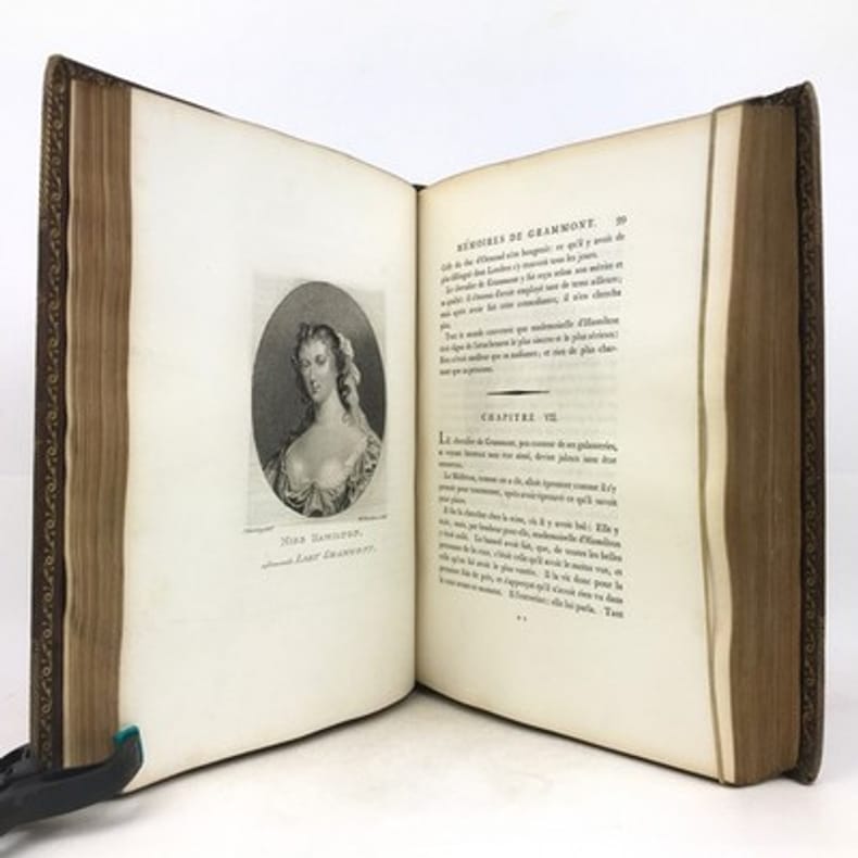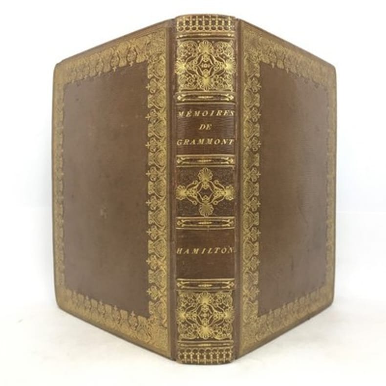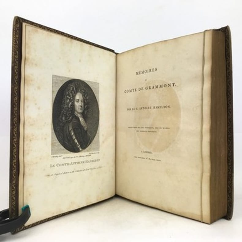Paris Au bureau de la Bibliothèque Choisie 1829 in 8 (21x13,5) 1 volume reliure demi veau fauve, dos lisse orné de faux-nerfs à froid, 390 pages, avec un fac-similé dépliant in fine, fente sur le mors du plat supérieur. Antoine Hamilton, Roscrea 1646 (Irlande) - Saint-Germain-en-Laye 1720, écrivain écossais d'expression française. Antoine Hamilton écrivit les Mémoires du comte de Gramont, son beau-frère. Philibert comte de Gramont, 1621-1707, aristocrate français. Bon exemplaire ( Photographies sur demande / We can send pictures of this book on simple request )
