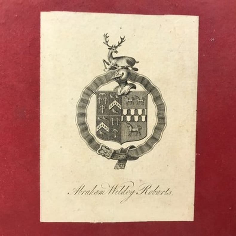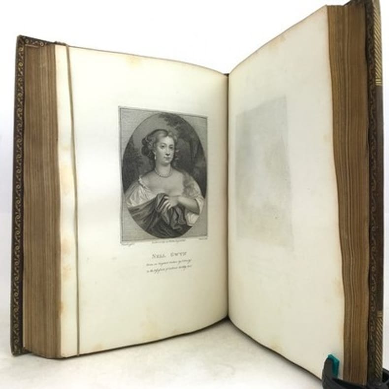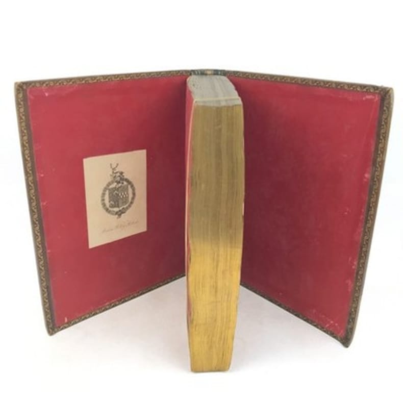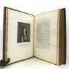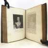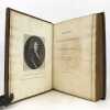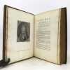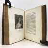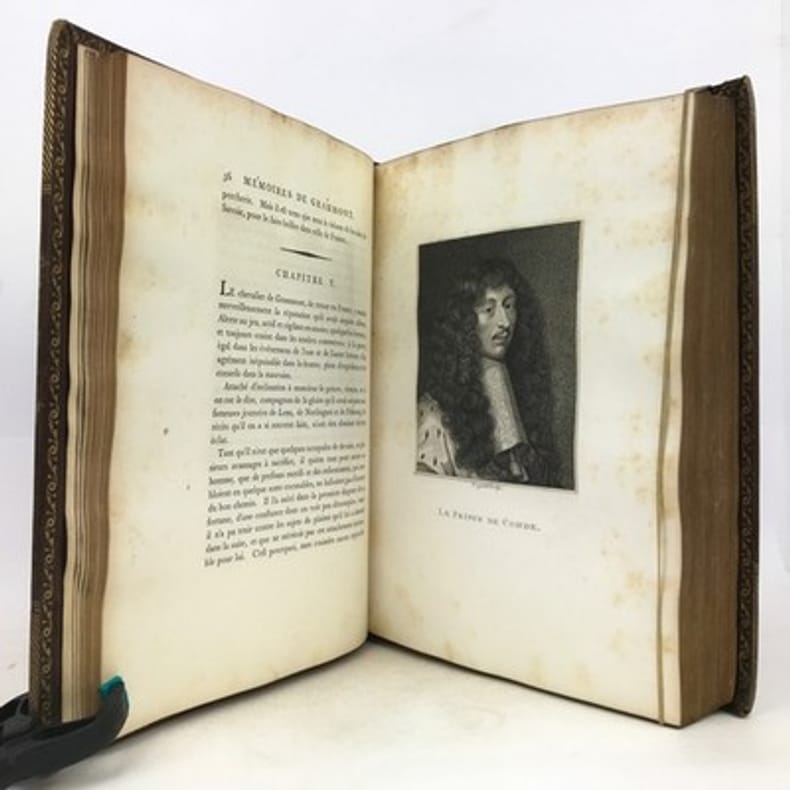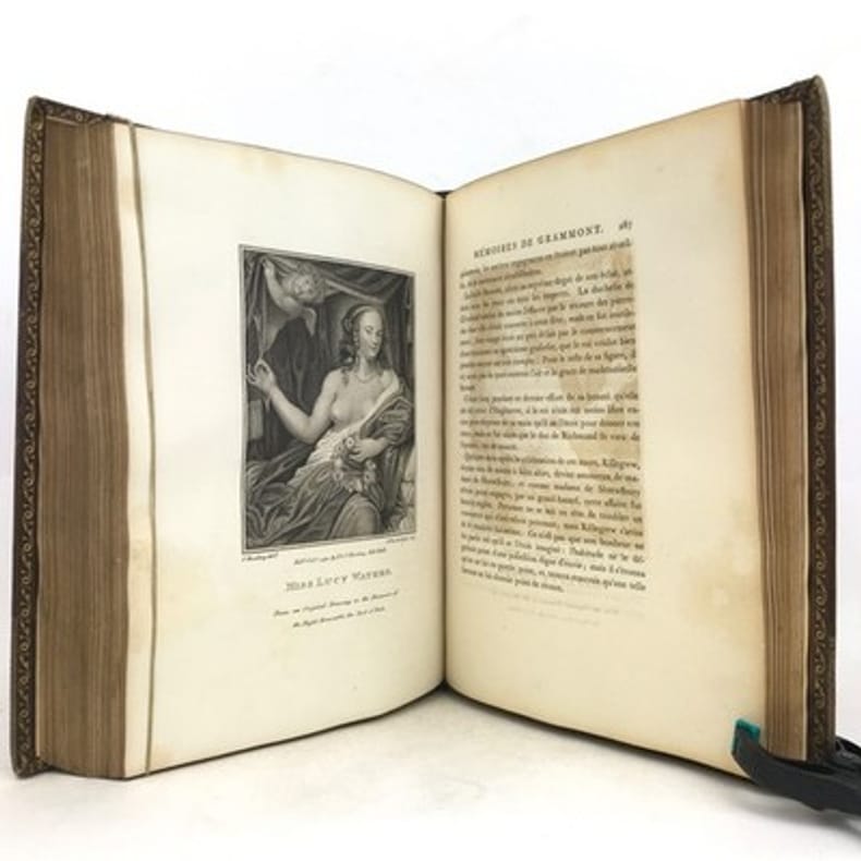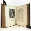1 volume in-4 (27 x 20,5 cm), plein maroquin grain long marron glacé (reliure de l'époque), dos à nerfs ornés et caissons finement décorés, triple filet et large roulette en encadrement des plats, rehauts à froid, coins des coupes décorés, roulette intérieure, [4]-313-1 bl.-77-1 bl.-[2] pages (complet). Frottements angulaires, rousseurs. Bon état tout de même. Édition originale de ce récit récit de la vie et des exploits d’un libertin, un Français exilé en Angleterre, Philibert de Gramont, par son beau-frère écossais, Antoine Hamilton. Édition illustrée de 72 portraits hors texte gravés d'après les tableaux originaux. L'ouvrage dresse un portrait sans concessions des fidèles de la cour anglaise de Charles II et des intrigues amoureuses qui s’y jouent, récits de batailles, scènes de séduction, dans un mélange de grandeur et d’esprit canaille. La publication en 1713 est un succès immédiat : le livre apparaît comme l’exemple d’une mondanité brillante où un bon mot fait la renommée d’un gentilhomme aussi bien qu’une prouesse à la guerre. Gramont incarne une aristocratie qui maintient sur les champs de bataille, sur les tables de jeu, dans les alcôves et surtout dans le verbe une souveraineté en train de disparaître. Le bel esprit est une posture qui s’apprend. L’art d’Hamilton consiste, de manière fort moderne, à brouiller la relation du grand au petit, à confondre l’historique et le romanesque, la première et la troisième personne. Aux côtés des Mémoires de Saint Simon, des Historiettes de Tallemant des Réaux ou du Siècle de Louis XIV de Voltaire, il est temps de redécouvrir les Mémoires du comte de Gramont(Gallimard). Provenance : de la bibliothèque d'Abraham Wildey Robarts, avec son ex-libris armorié sur le contreplat. Abraham Wildey Robarts (1779–1858), de Hill Street, Berkeley Square, Middlesex, est un politicien et banquier anglais. Il est issu d’une famille de politiciens, fils d’Abraham Roberts et de Sabine Tierney (sœur de George Tierney). Dans sa jeunesse, il était écrivain pour la Compagnie des Indes orientales à Canton. Il est devenu administrateur de la Compagnie des Indes orientales, également partenaire dans la banque Robarts & Curtis, et a travaillé comme facteur des Antilles. Il a été membre du Parlement de 1818 à 1837. Benjamin Disraeli lui a succédé. Bel exemplaire.