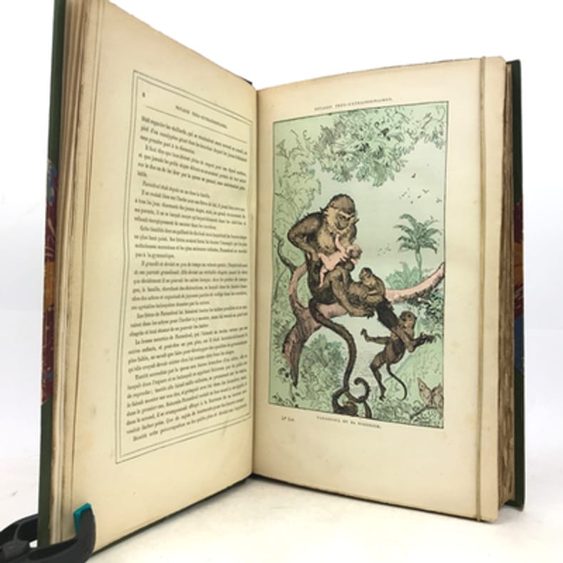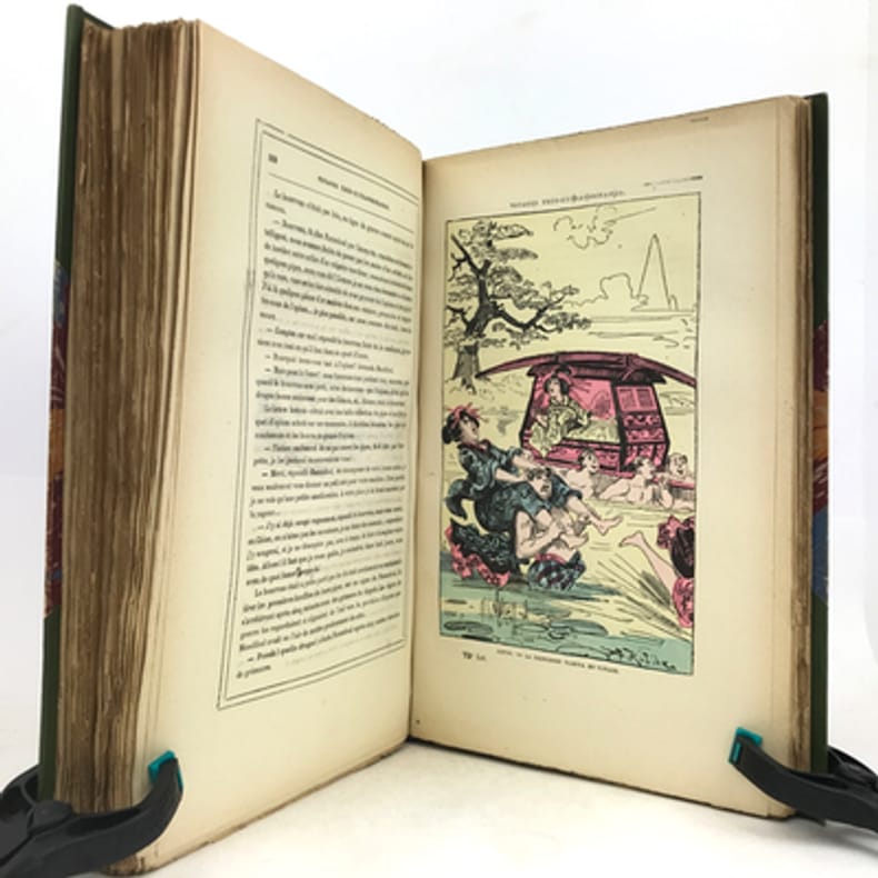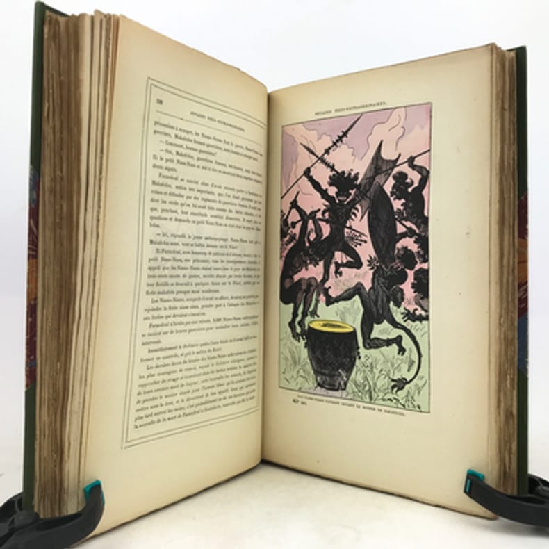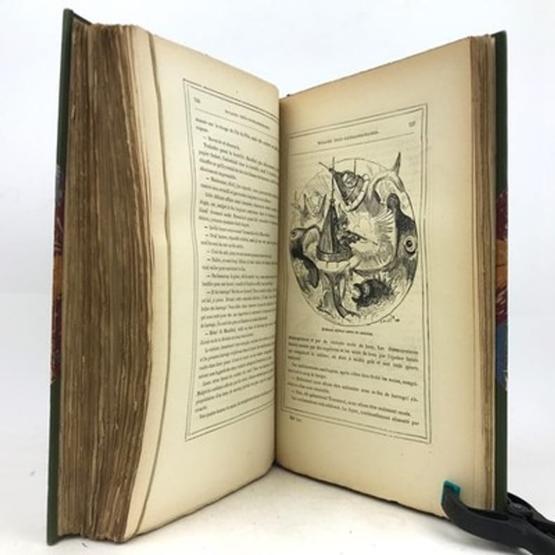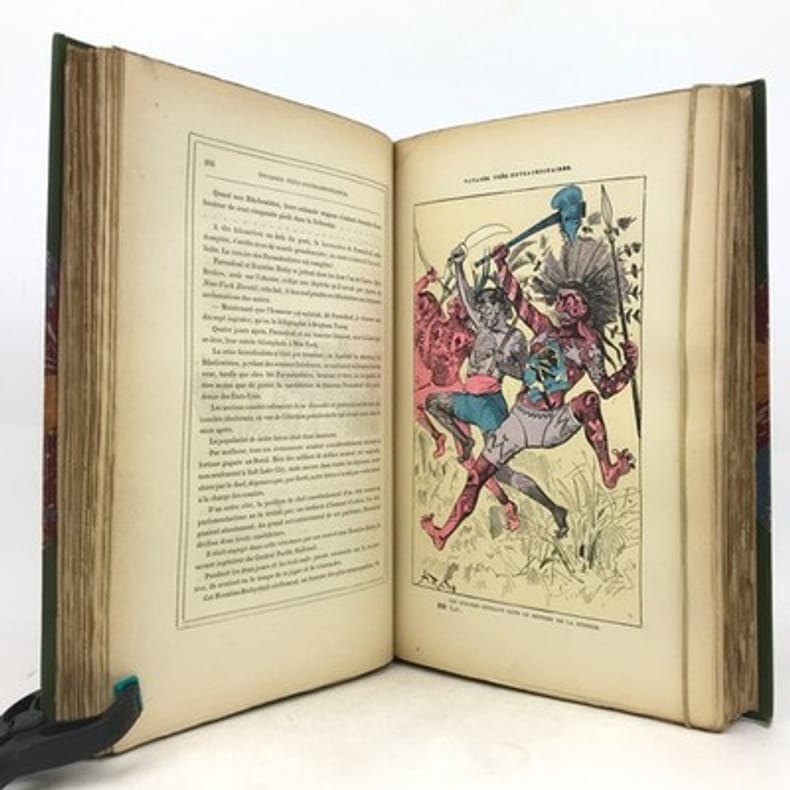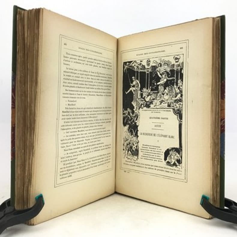 1 volume in-4 (27,8 x 18 cm), percaline verte à coins (reliure de l'époque), dos lisse à pièce de titre de maroquin rouge, [4]-808 pages (complet). Légers frottements, très rares fendillements marginaux. Bon état. Édition originale de ce roman, publiée en 101 livraisons et rassemblées ici en volume, conçu comme une parodie des Voyages extraordinaires de Jules Verne. Édition illustrée de 450 dessins d'Albert Robida dont près de 100 en couleurs, d'une belle inventivité et très amusants. Le héros Saturnin Farandoul vit des aventures invraisemblables à travers le monde entier et rencontre un grand nombre de personnages créés par Jules Verne, à l'instar du capitaine Nemo, de Philéas Fogg, de Michel Strogoff ou encore du capitaine Hatteras. Provenance : de la bibliothèque d'André Barrier, président des Cent Bibliophiles, avec son ex-libris tampon japonais, et celui d'un héritier. Très sympathique exemplaire.